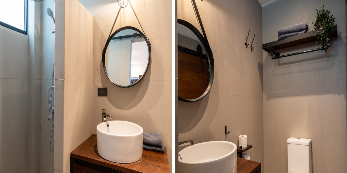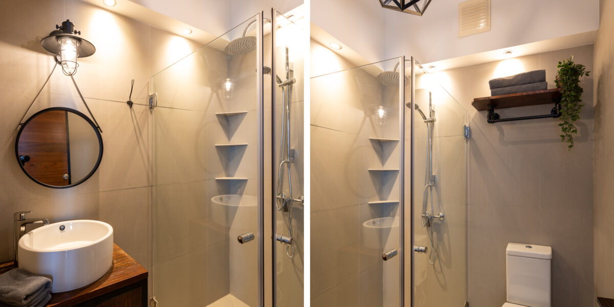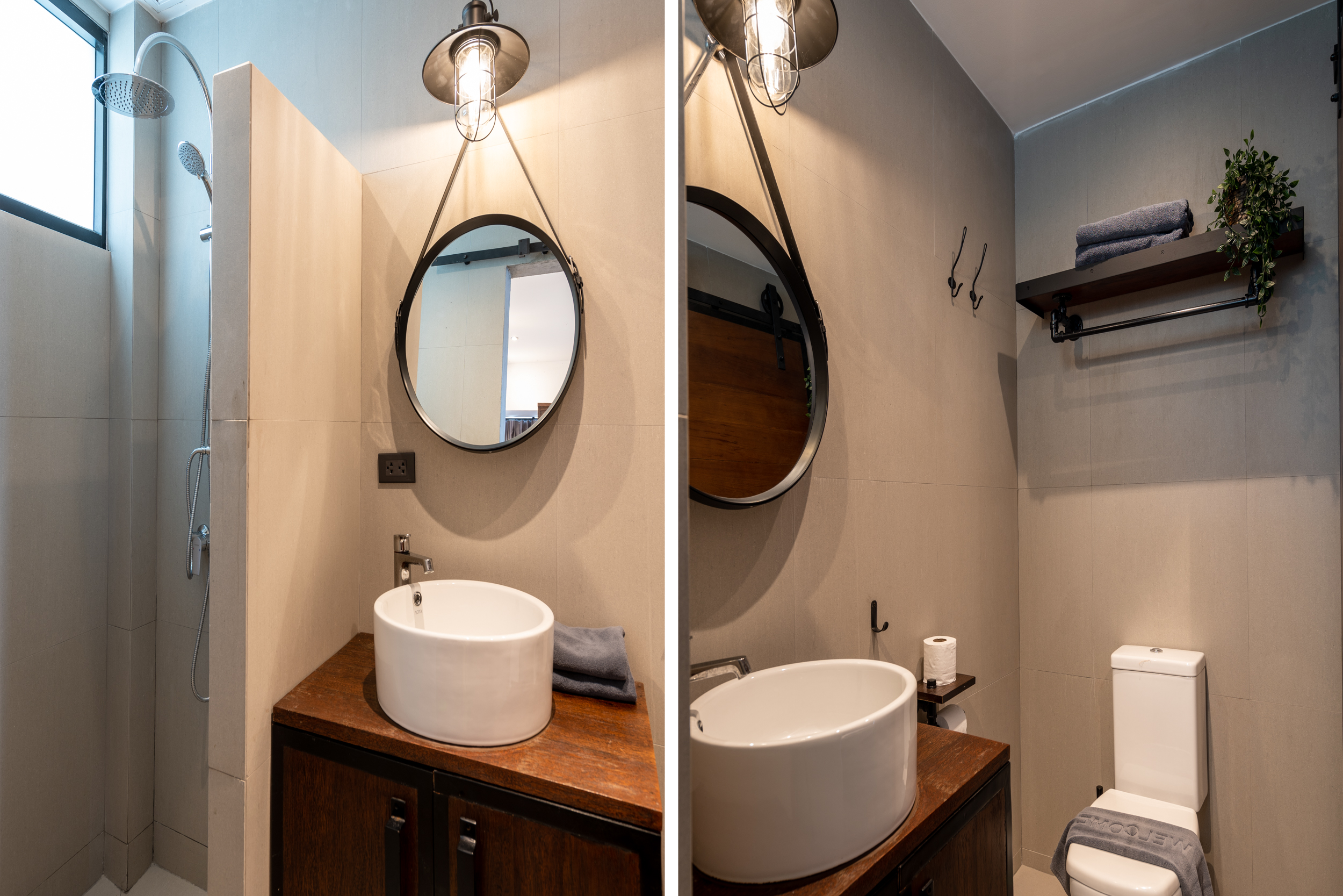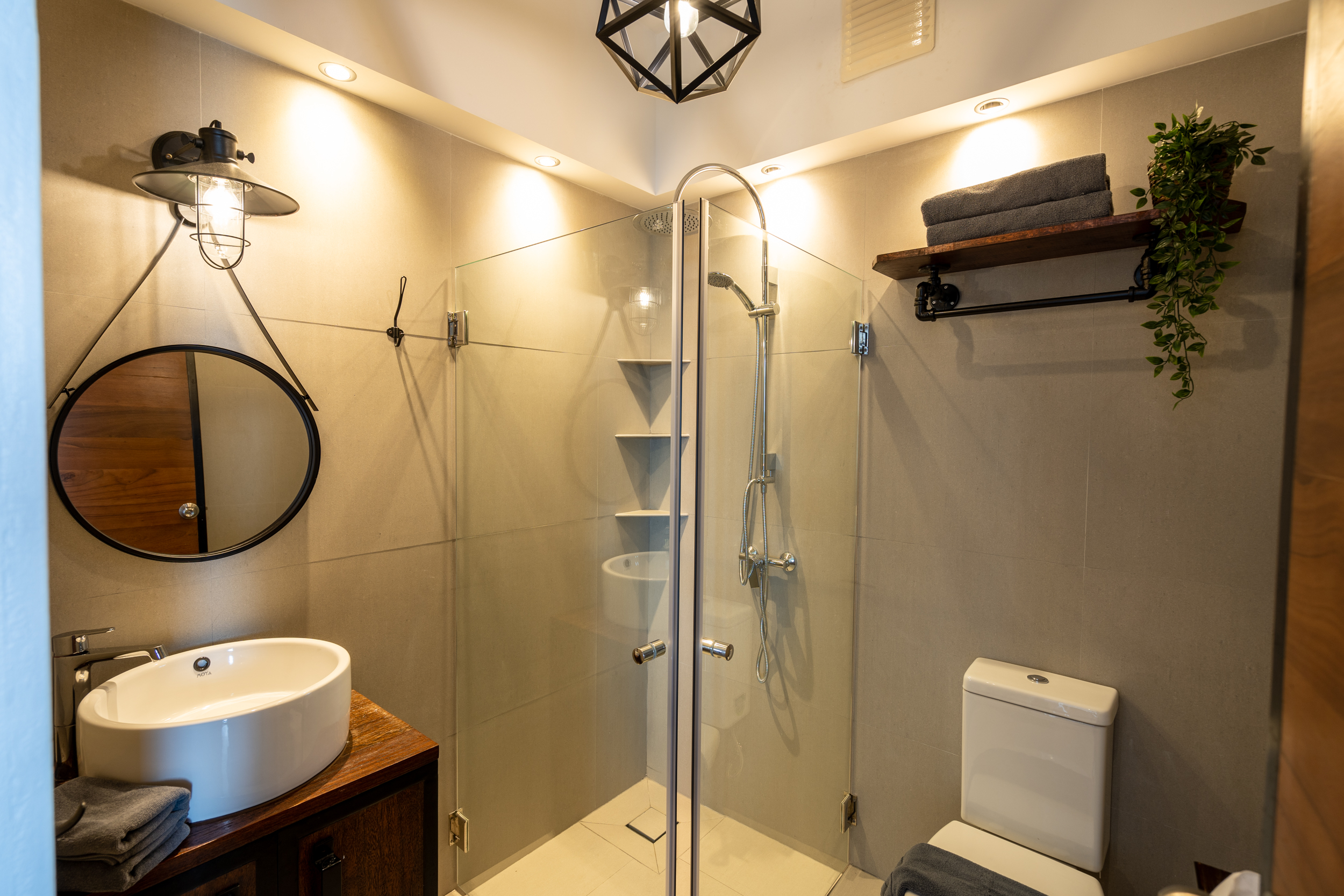 A beautifully designed bathroom is easily accessible from the living area. There is also a storage closet for luggage or any other items you may need to stow away during your stay.