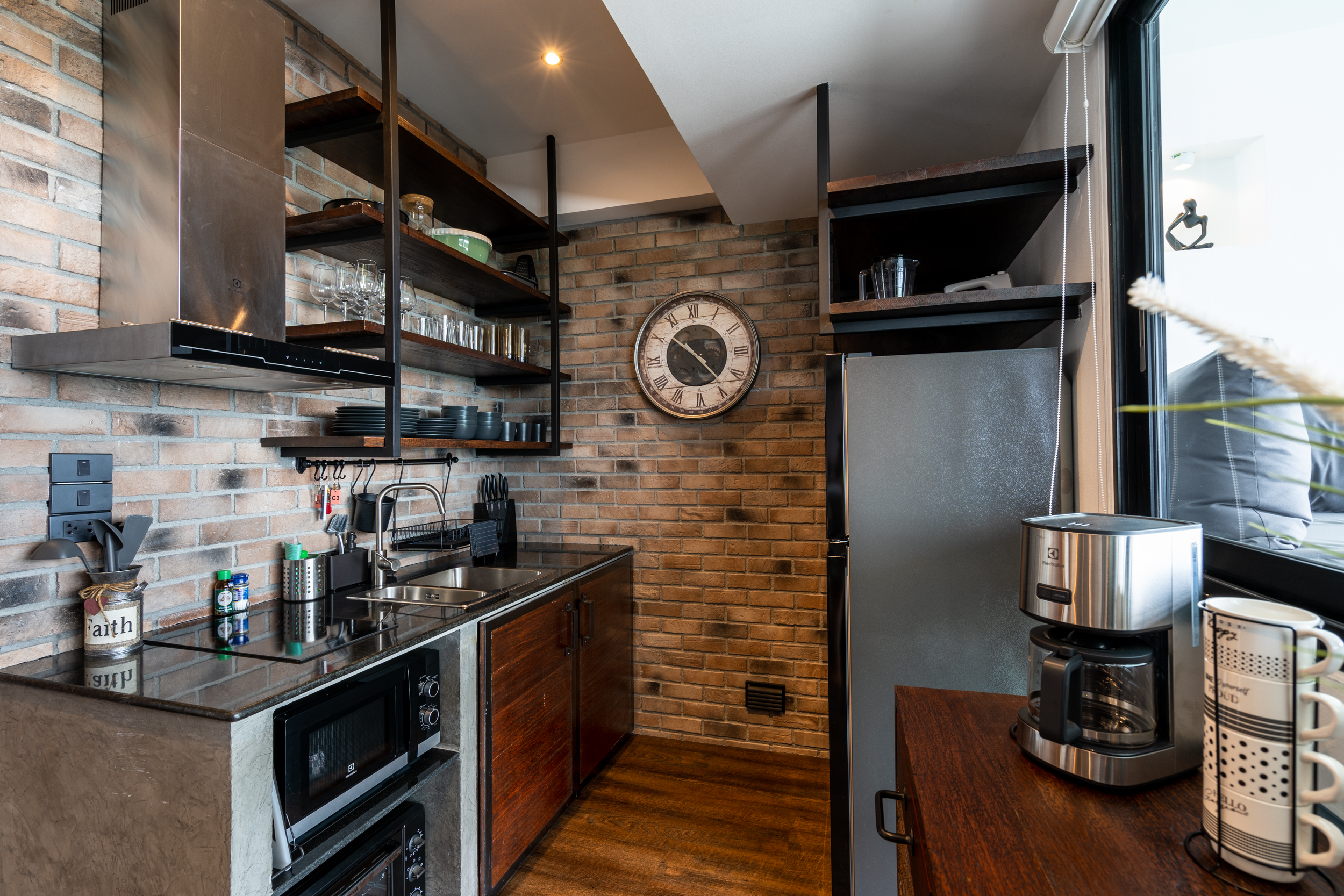 The fully equipped kitchen includes everything you need for a seamless stay, from a two-burner cooktop, oven, and microwave to a full-size refrigerator, toaster, coffee machine, and all essential cookware and utensils. A washer/dryer is also included for added convenience.