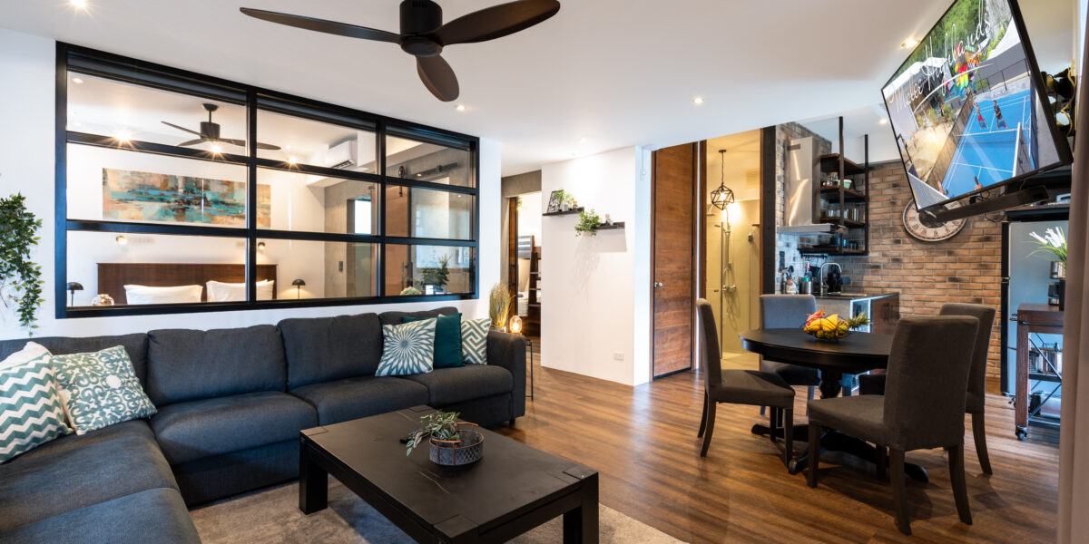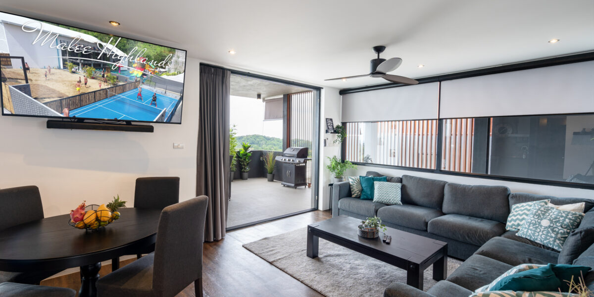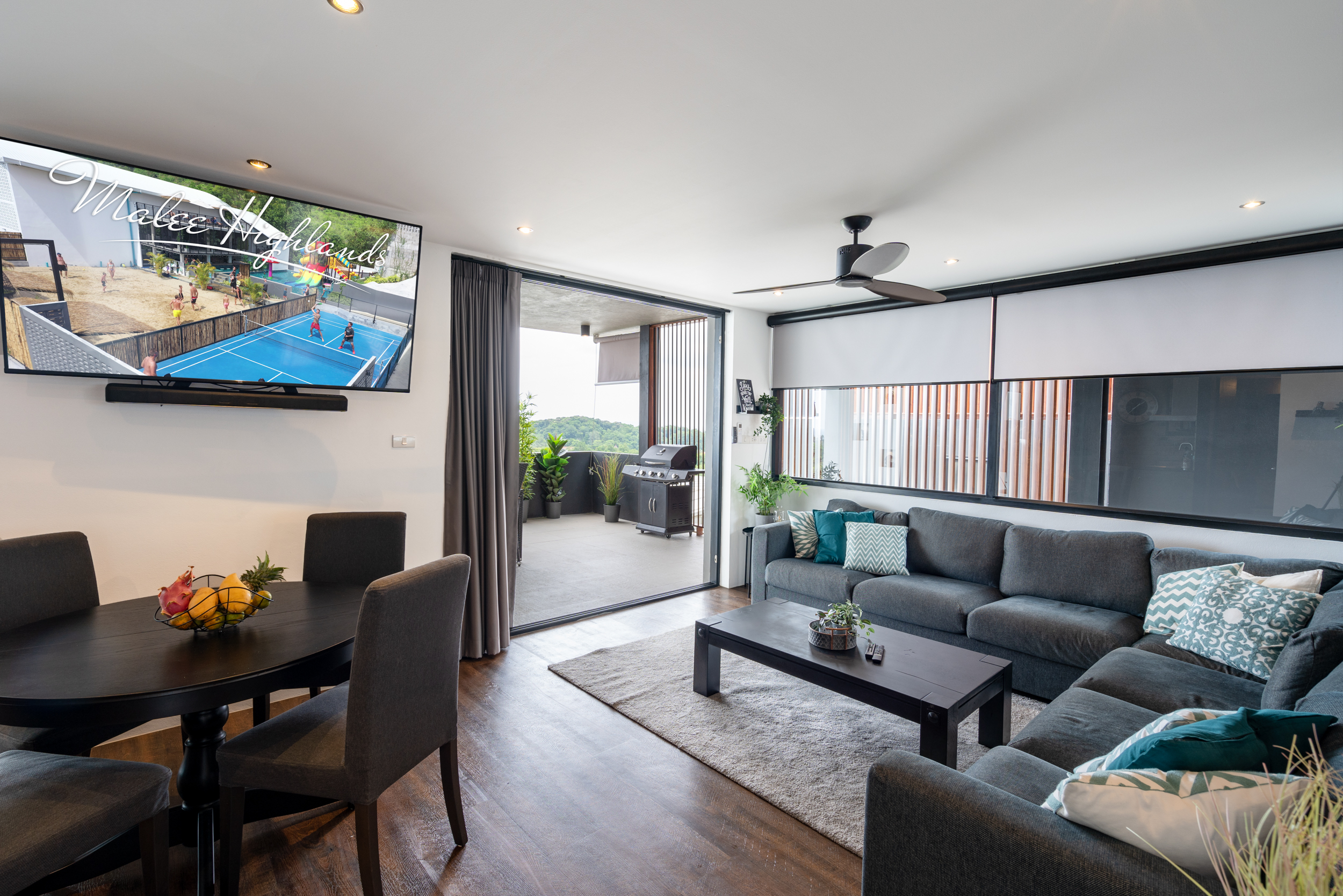 The living area is designed for comfort and entertainment, with a massive 65-inch smart TV that can be positioned for optimal viewing from anywhere in the room. A large, cozy sofa invites you to relax, while the sliding glass doors open fully, allowing for uninterrupted ocean views and refreshing sea breezes. The dining area offers flexible seating, so you can choose to dine inside or outside on the sea-view terrace.