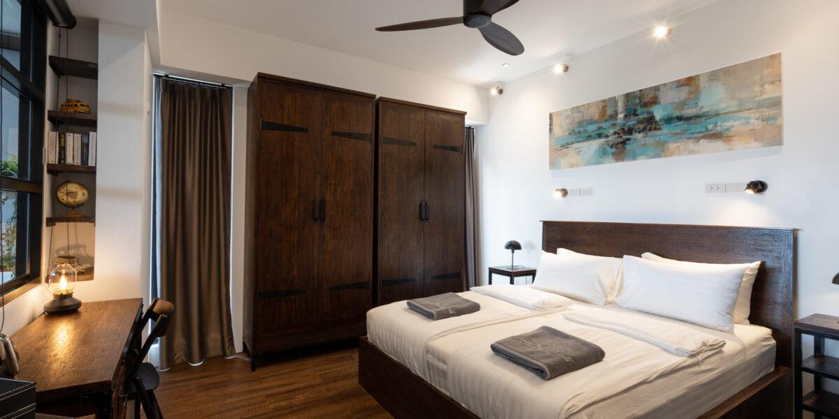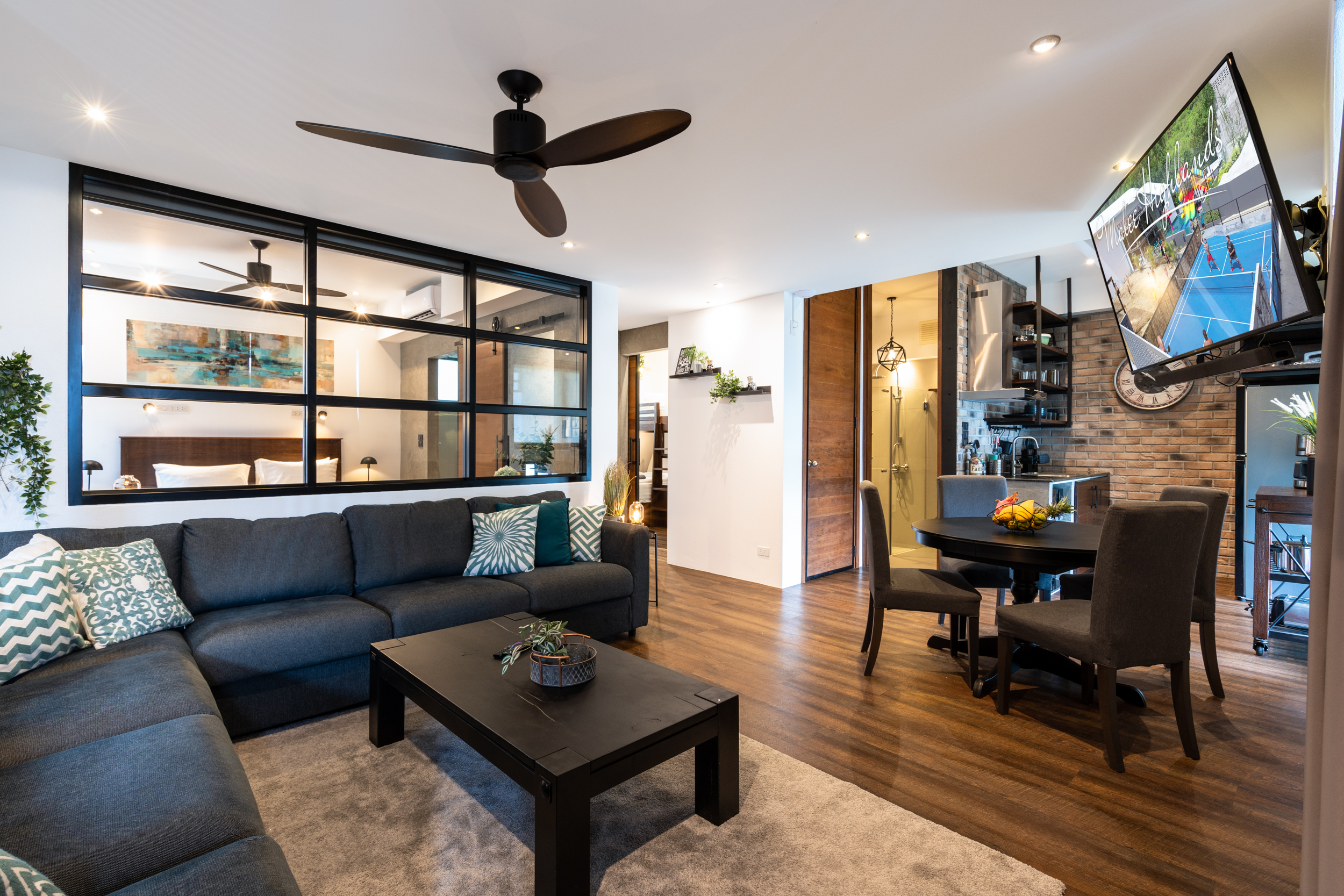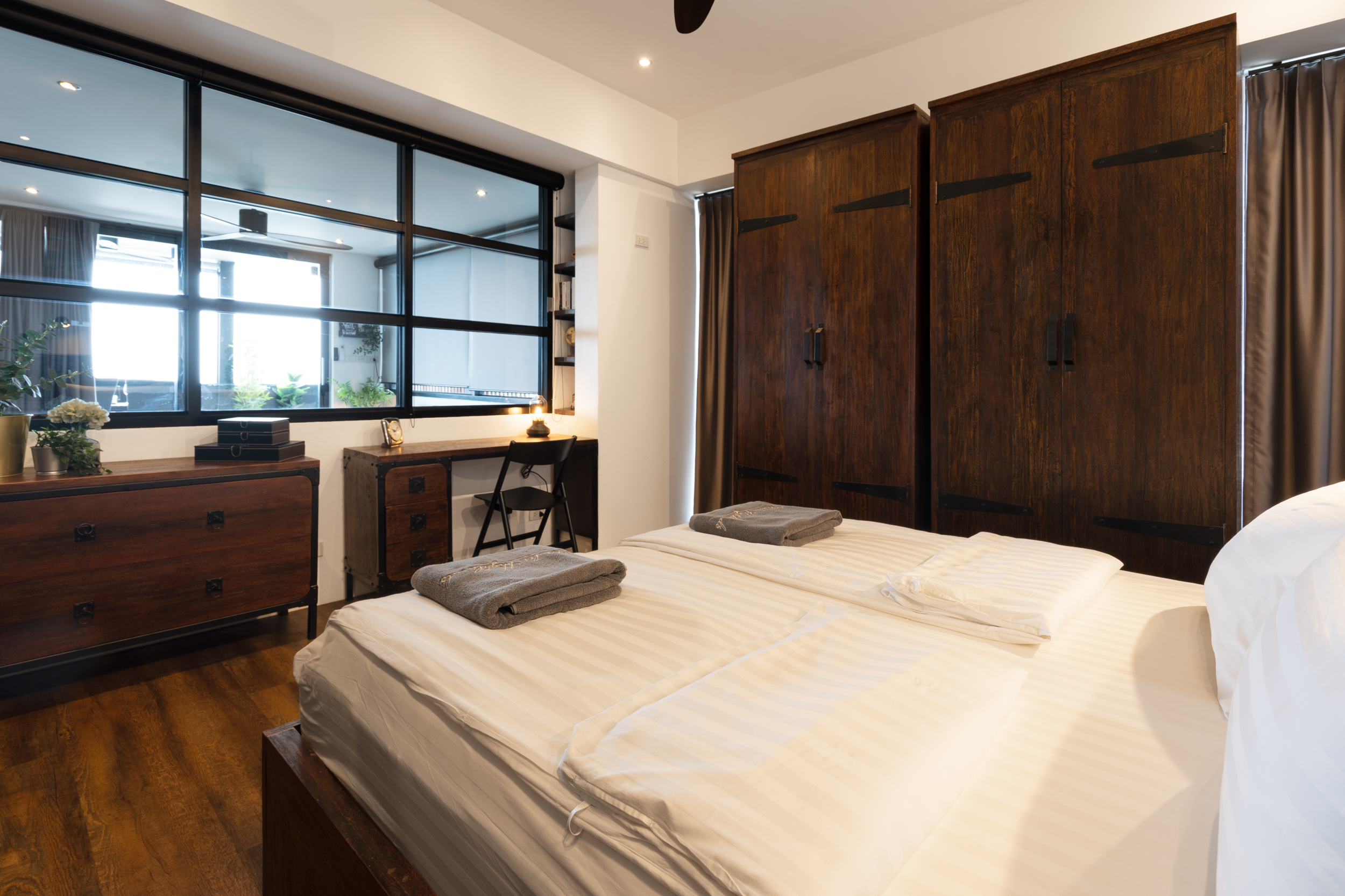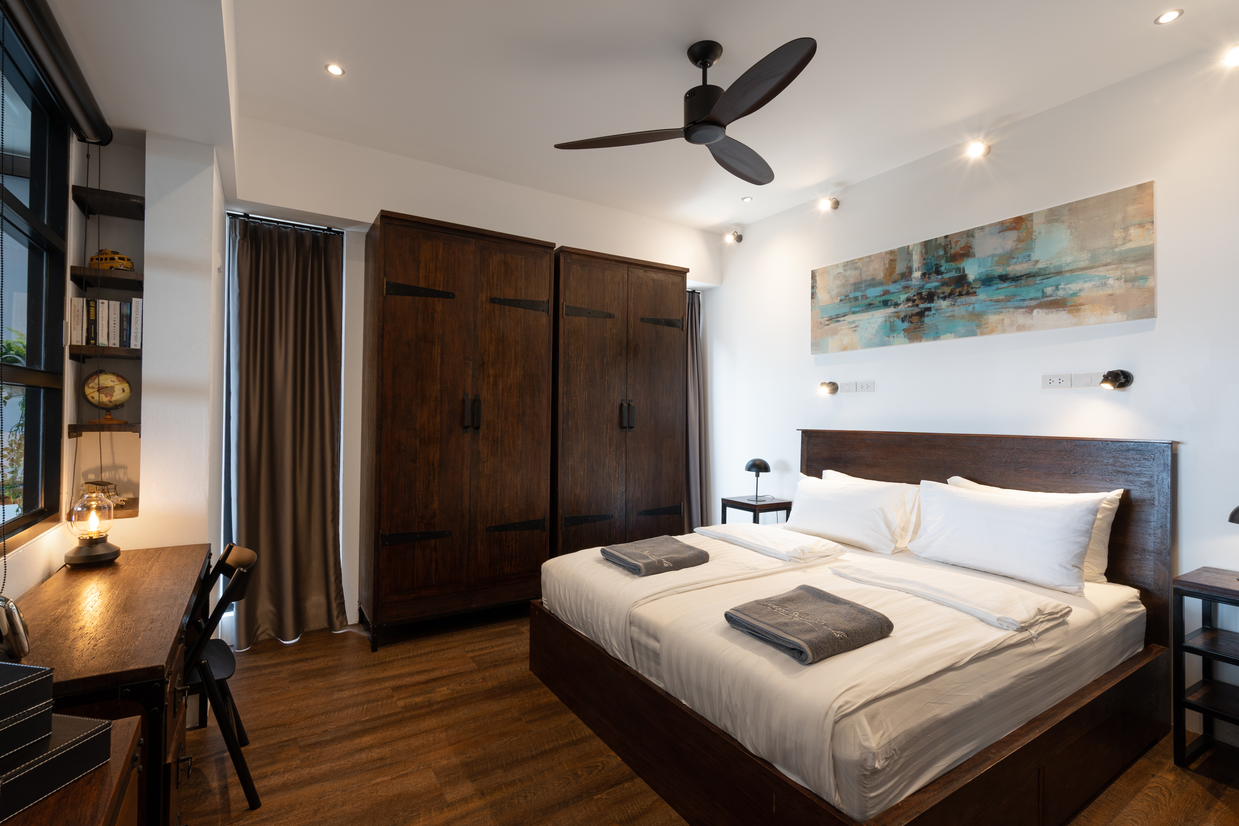 The master bedroom features a king-size bed, a work desk, and an en-suite bathroom. A large interior window enhances the spacious feel of the room by providing a stunning view through the living area and out to the ocean. It also has a working desk and a 24 inch screen, a perfect place to work.