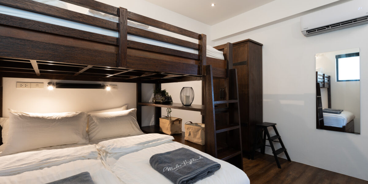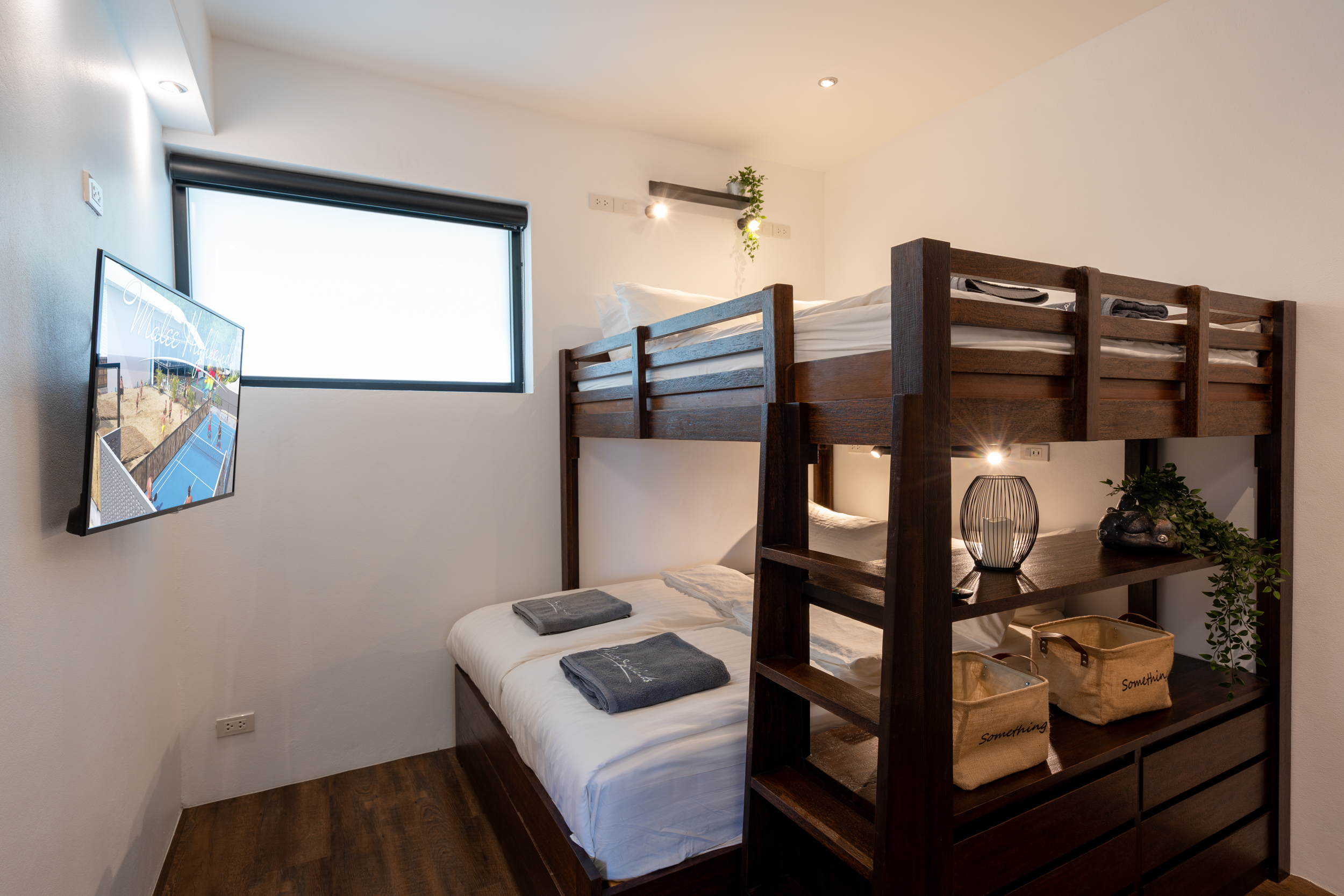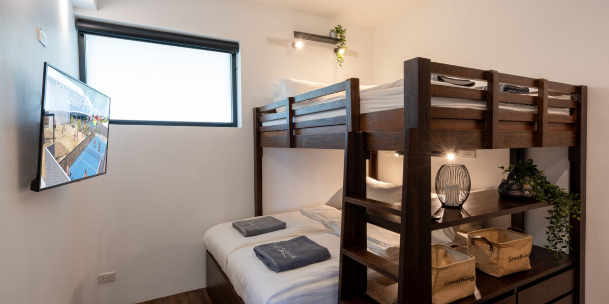 The second bedroom has a space saving queen-size bunk bed and TV. All beds are fitted with high-quality IKEA mattresses and premium linens to ensure a restful night’s sleep.