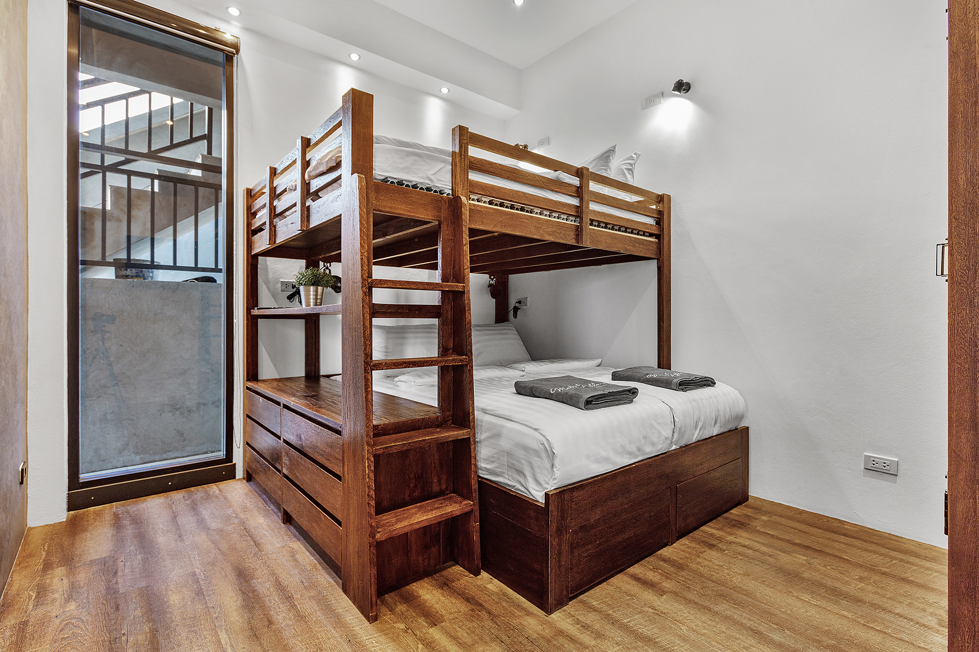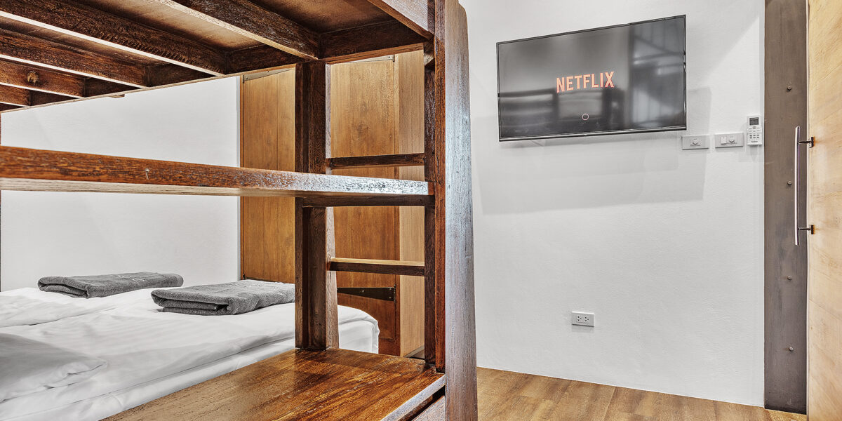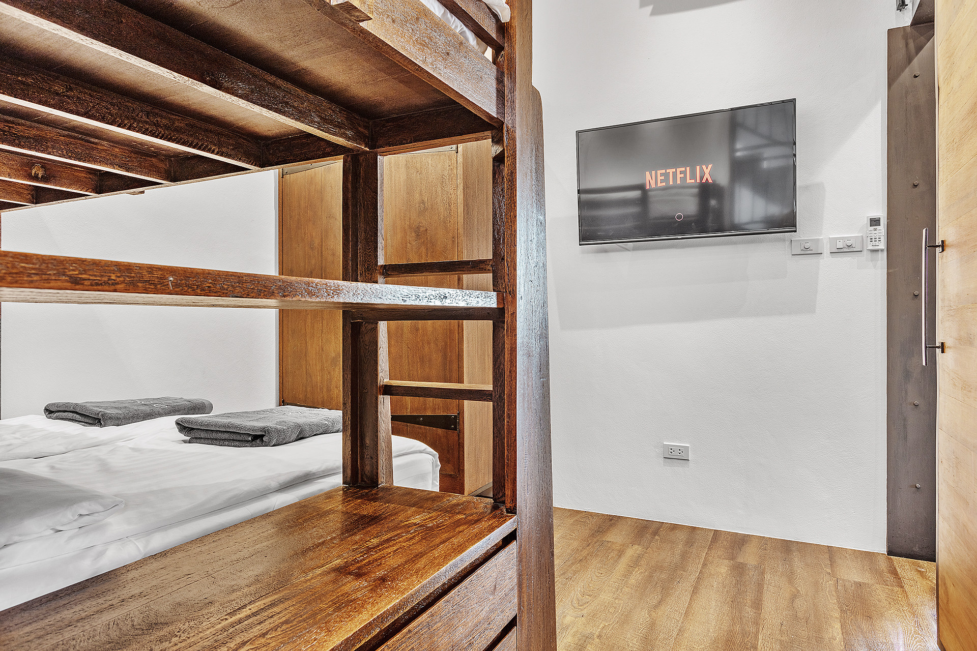 The second bedroom includes a clever space-saving queen-size bunk bed, a 43-inch TV, air conditioning, and its own adjacent bathroom—ideal for kids or extra guests.