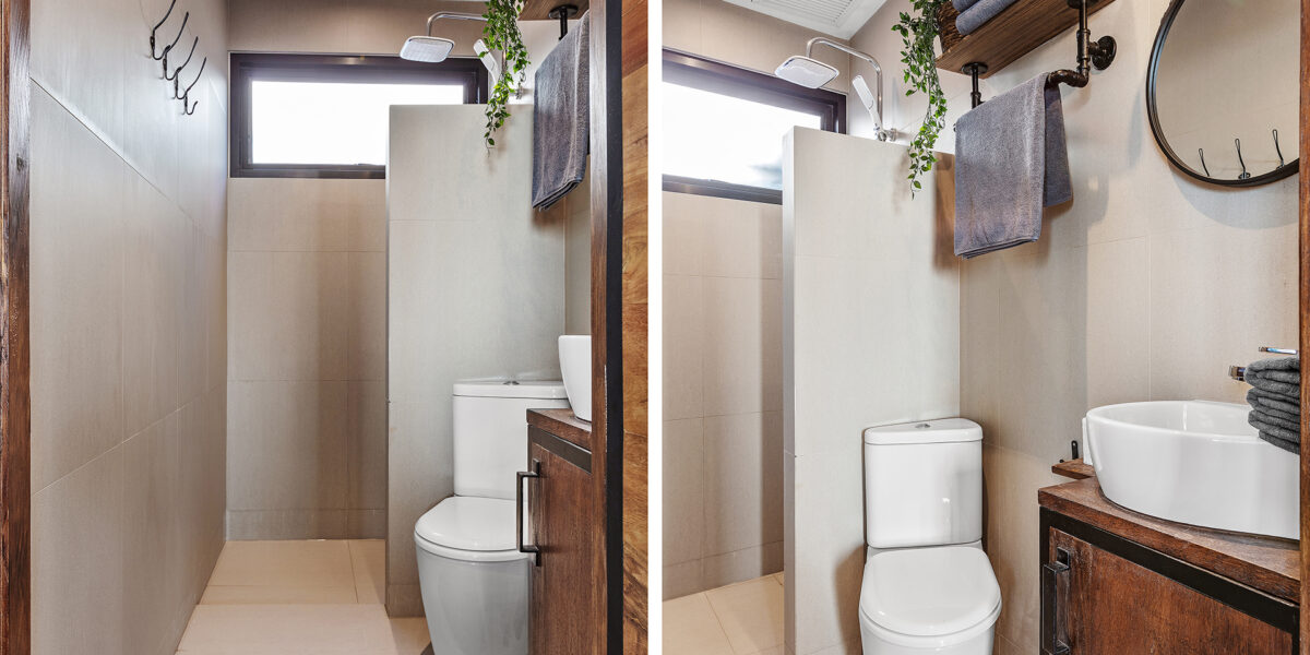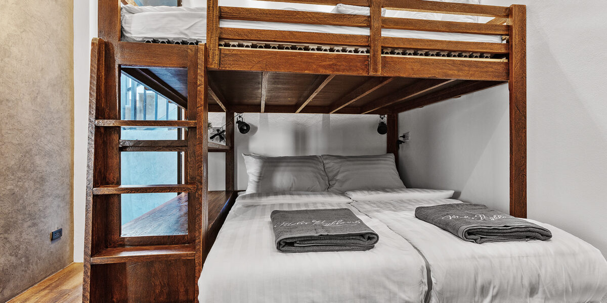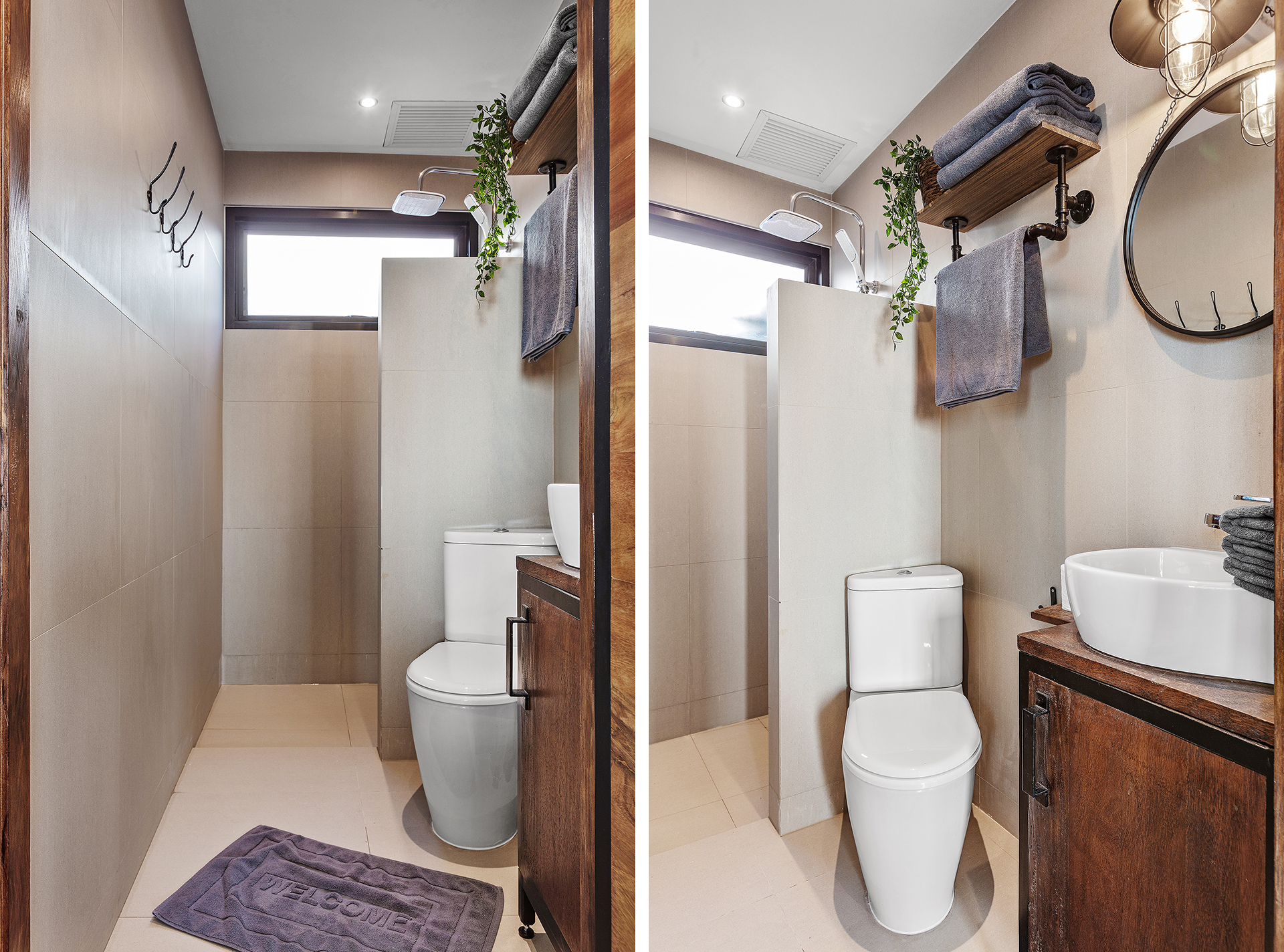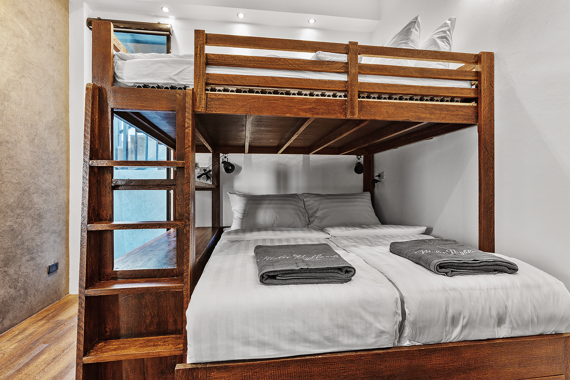 The second bedroom includes a clever space-saving queen-size bunk bed, a 43-inch TV, air conditioning, and its own adjacent bathroom—ideal for kids or extra guests.