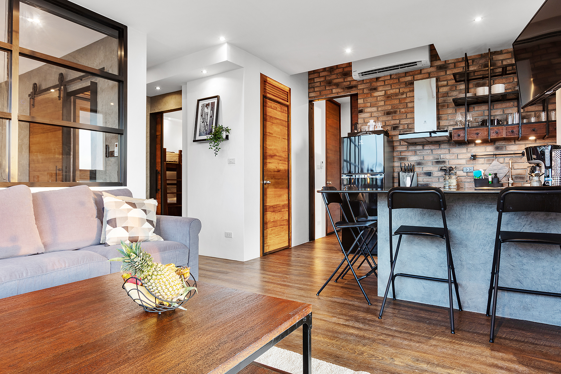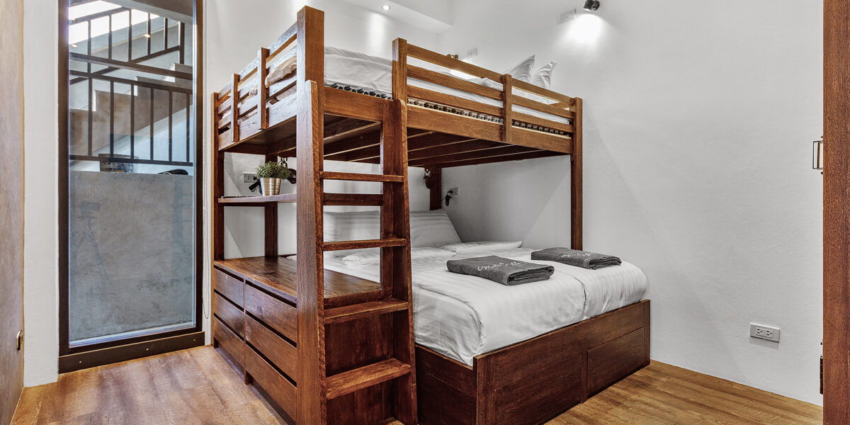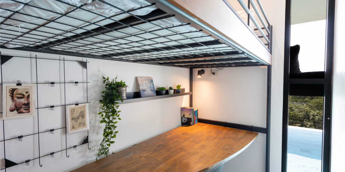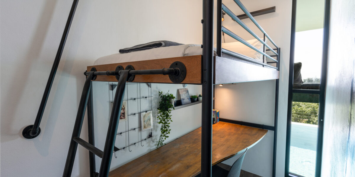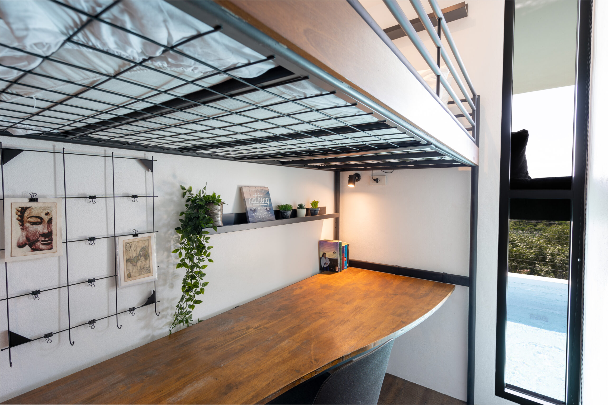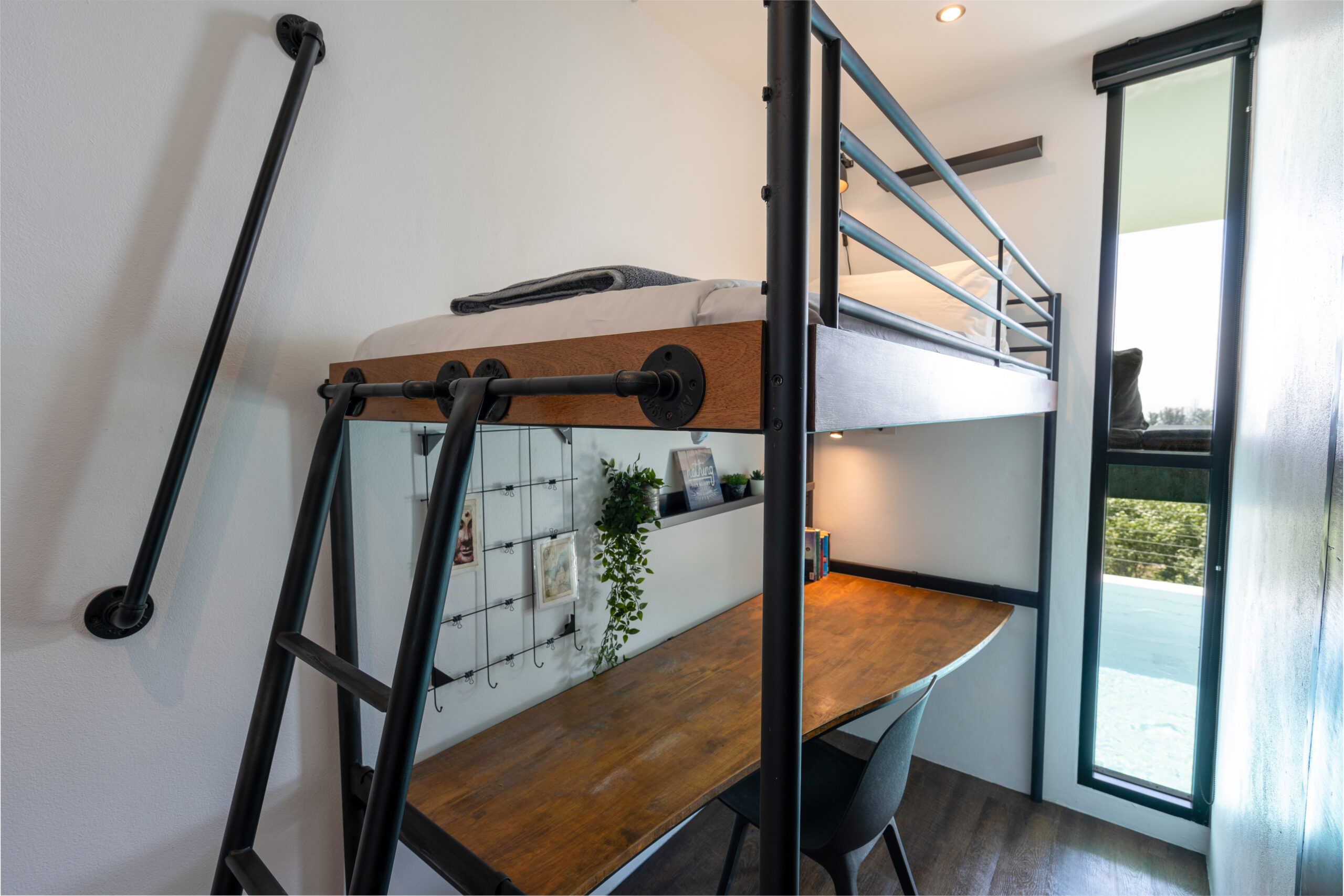 The third bedroom offers a single loft bed above a well-designed workstation complete with a 24-inch monitor, making it a great spot for both rest and remote work.