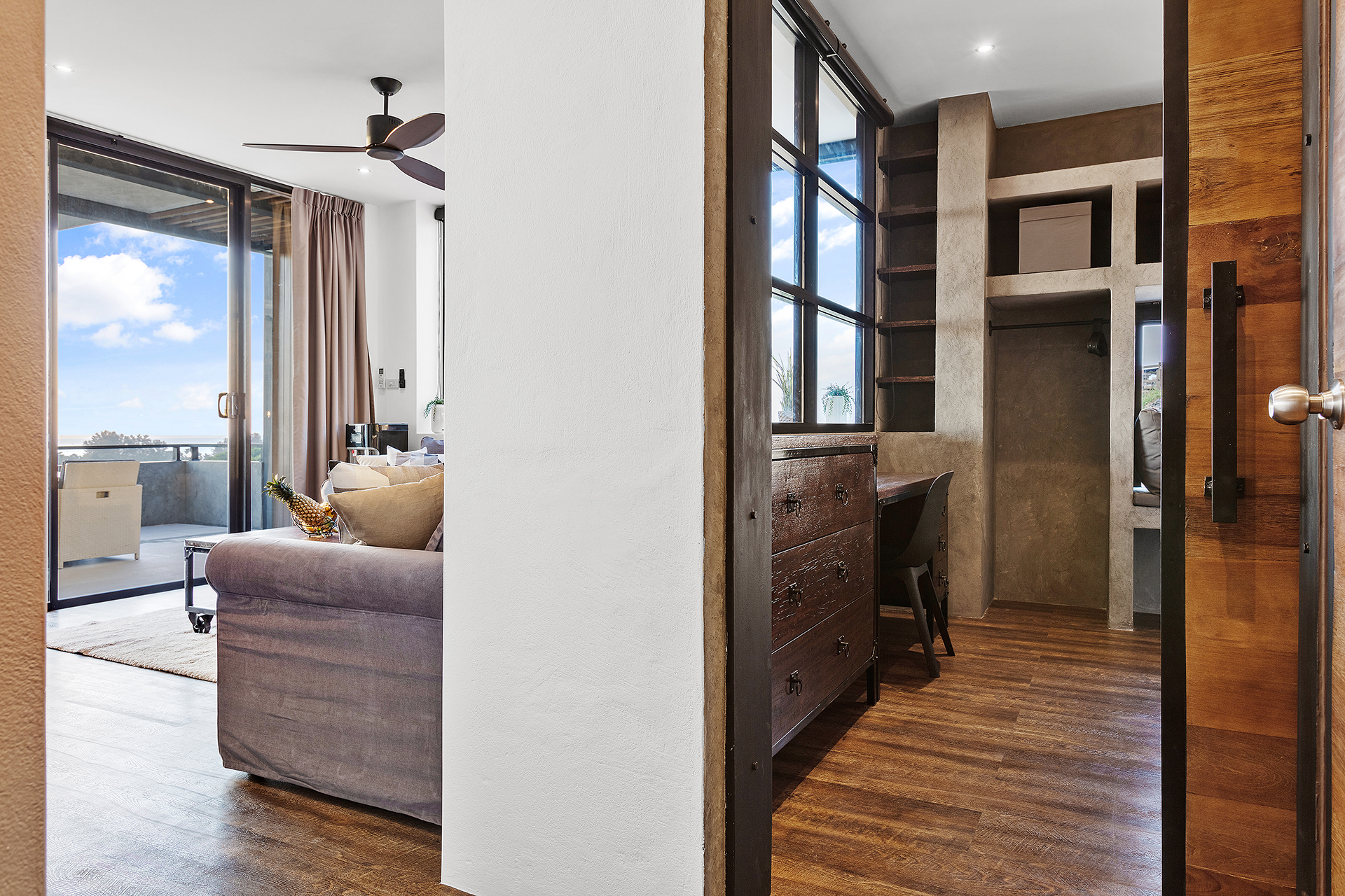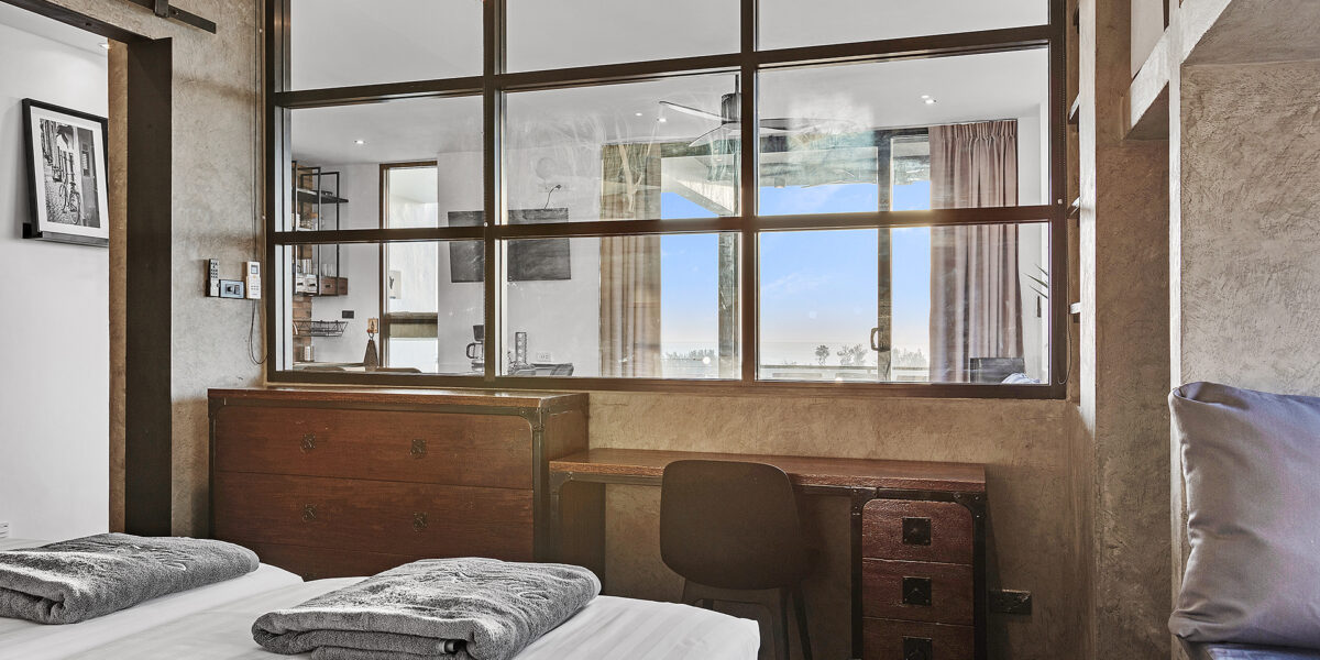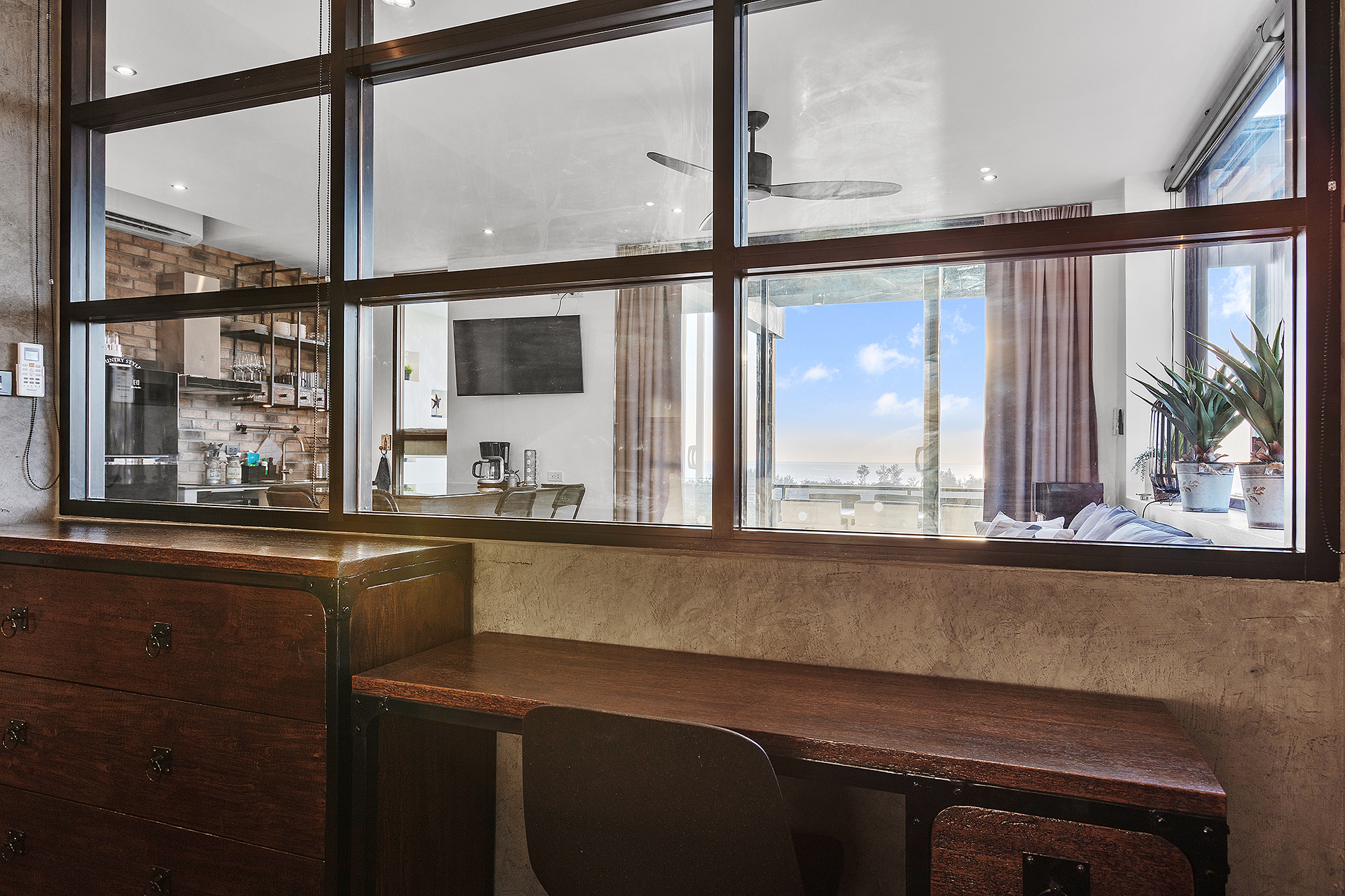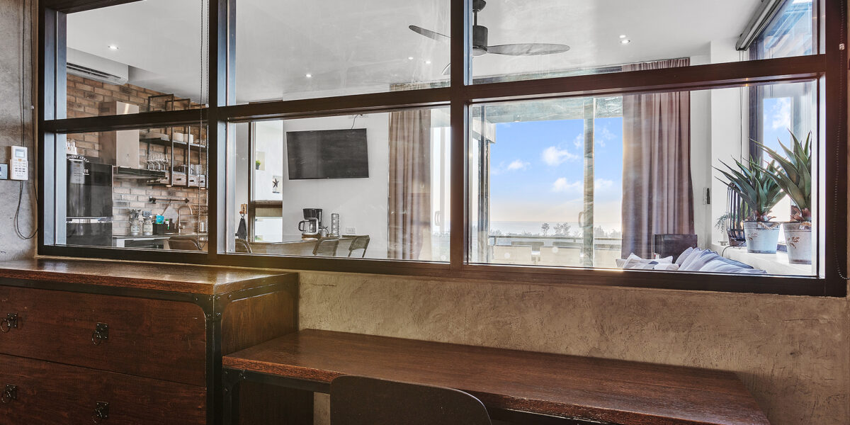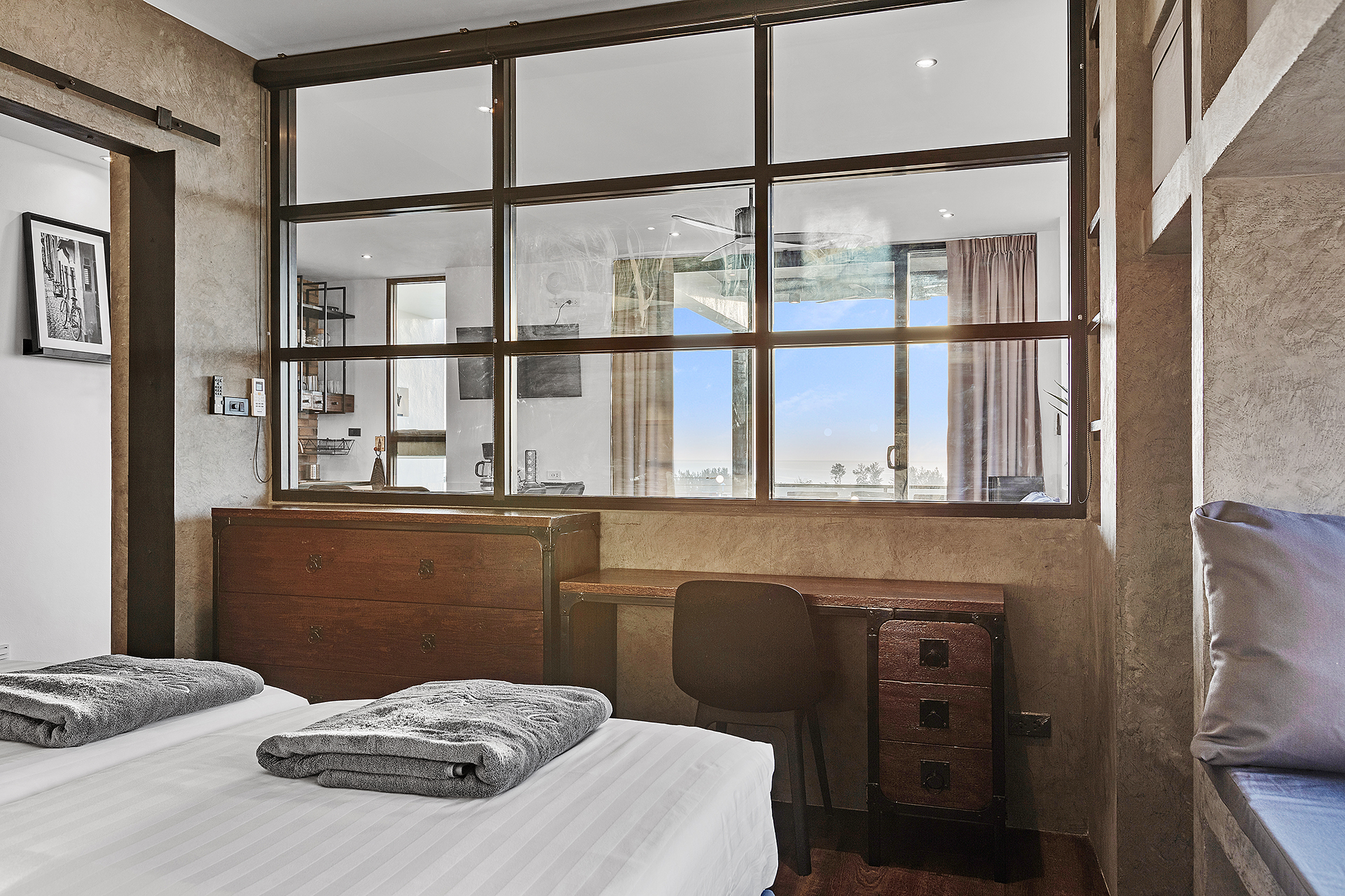 The master bedroom is both functional and serene, featuring a king-size bed, a cozy daybed by the window, a work desk, air conditioning, and a nearby bathroom. A large interior window provides a view through the living space out to the sea, adding depth and light to the room.