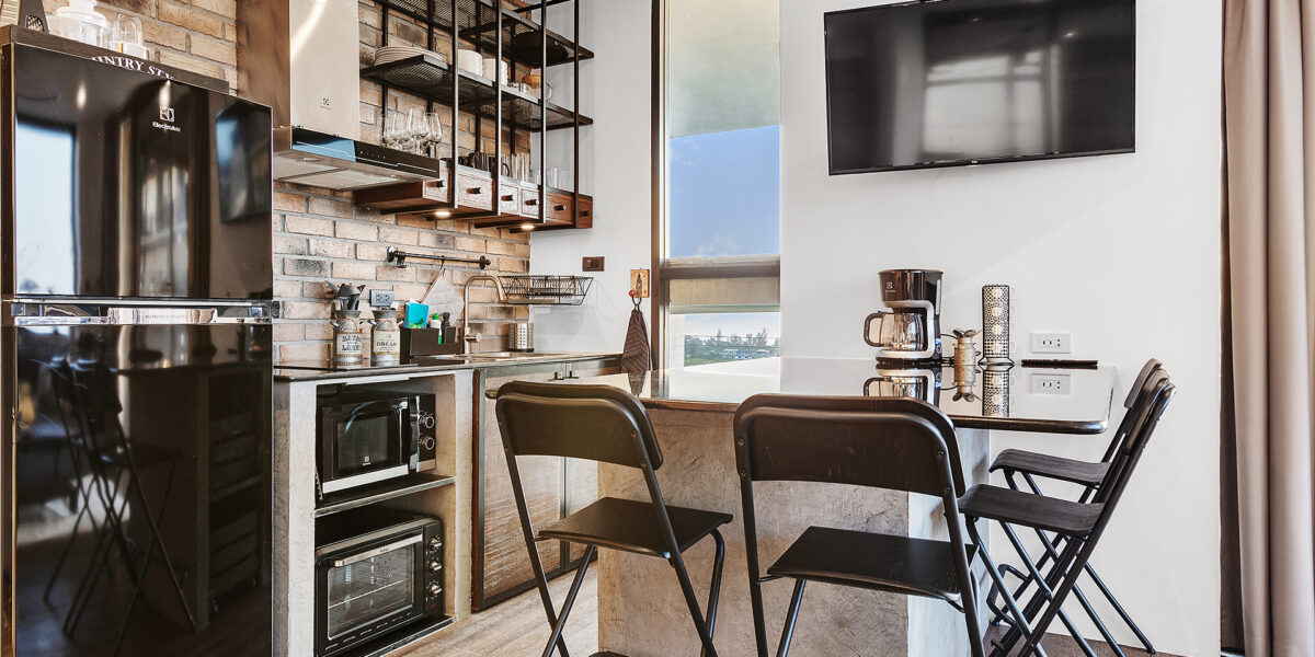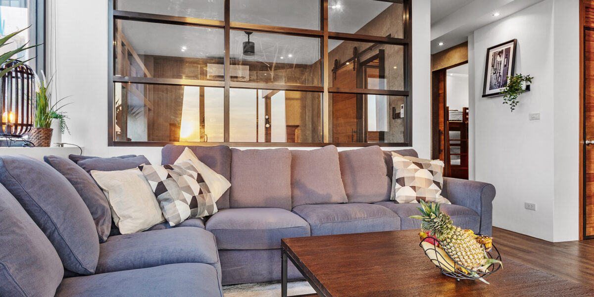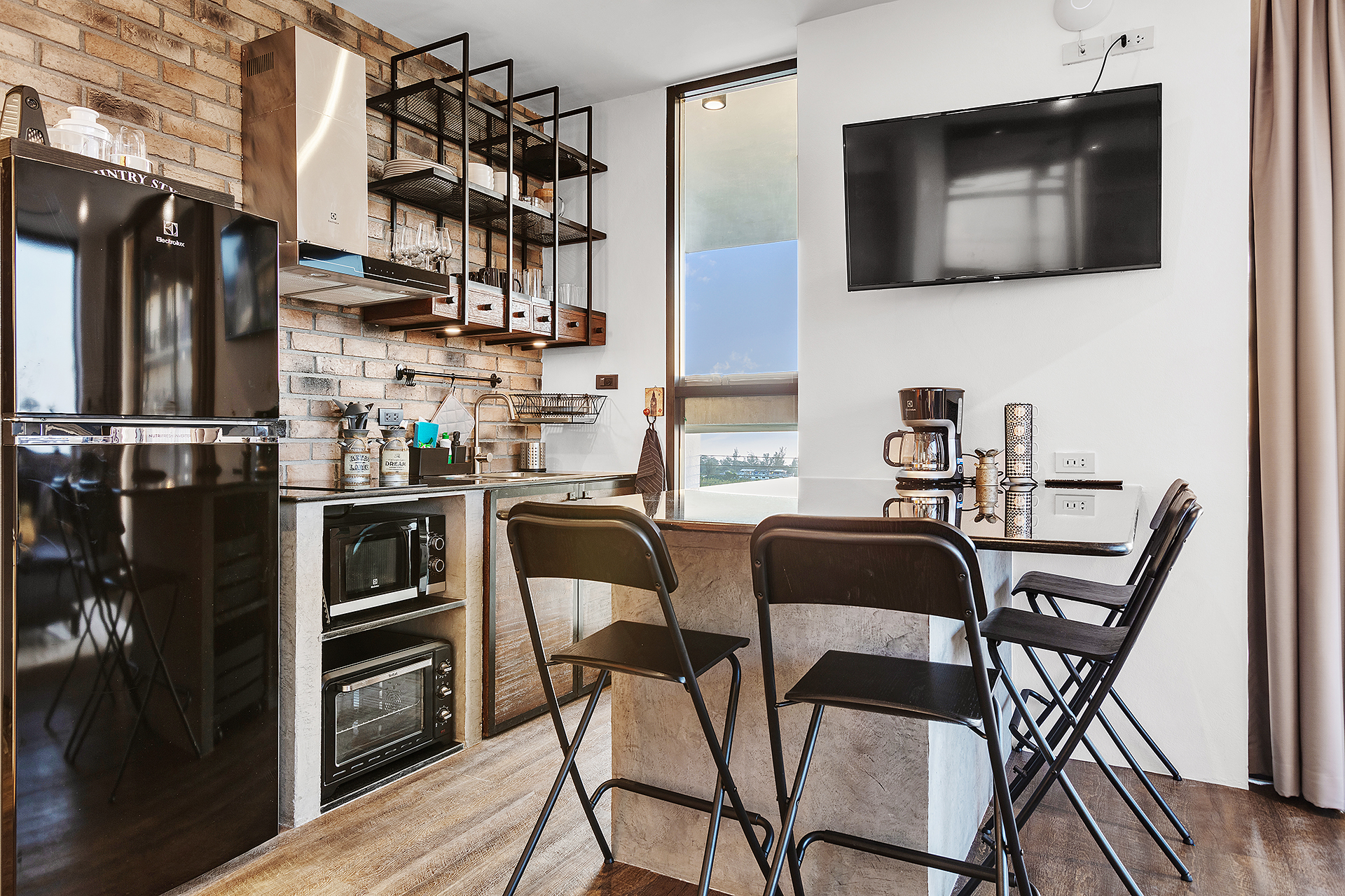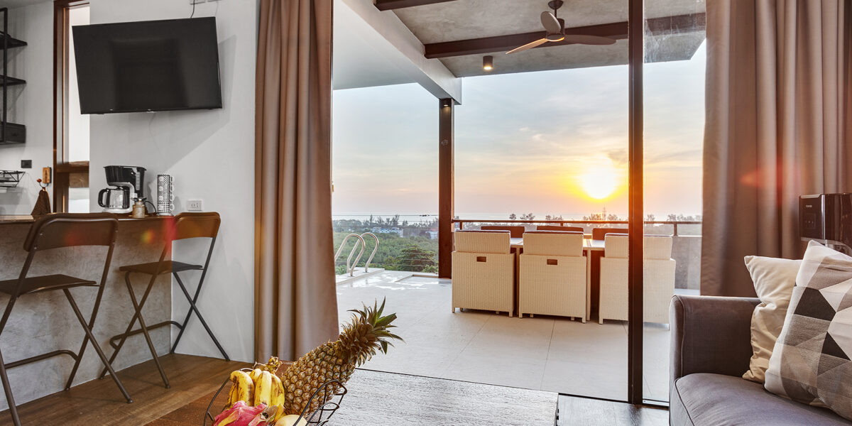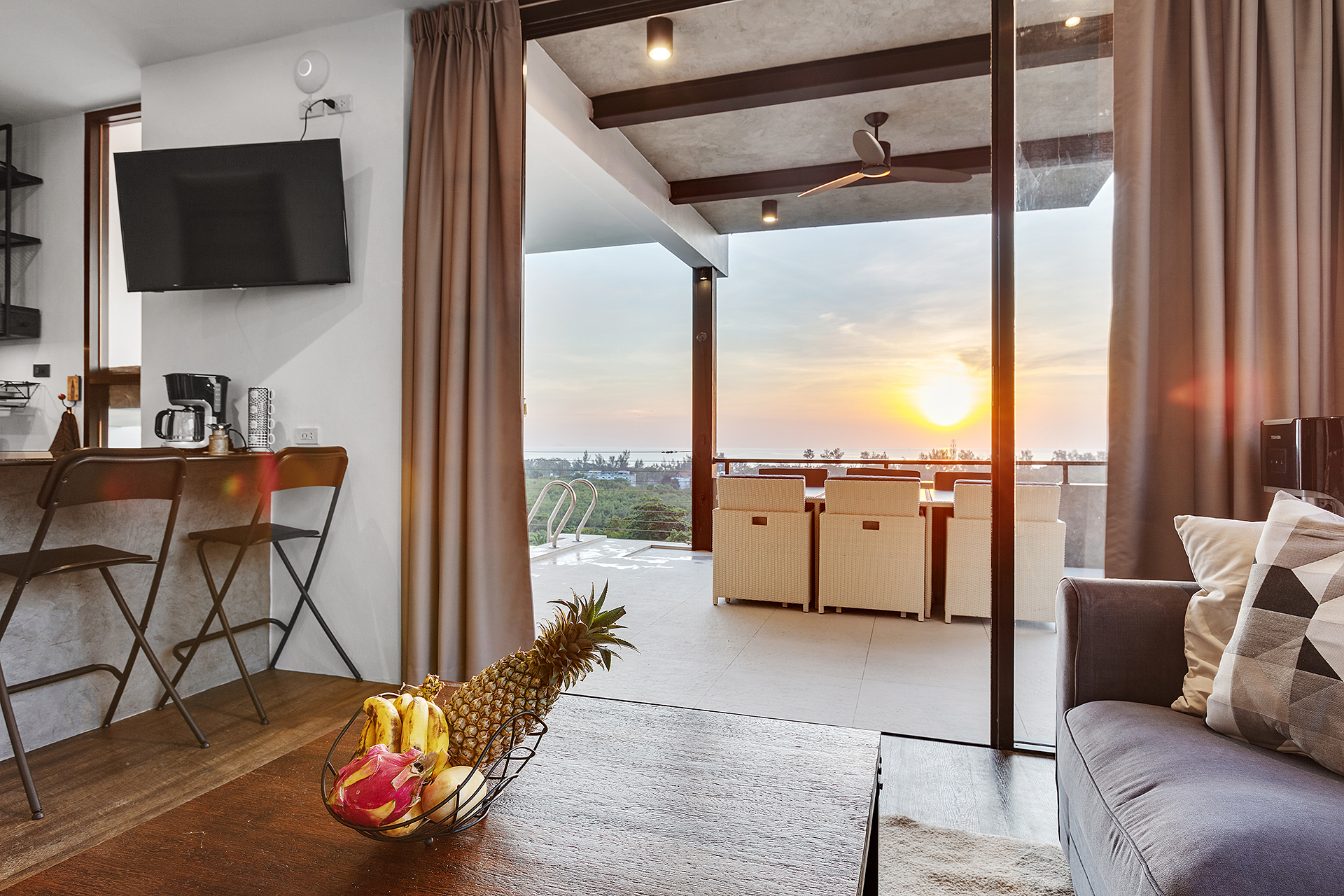 The open-plan living area features a large, ultra-comfortable sofa and a 43-inch smart TV, perfect for relaxing after a day of exploring. Floor-to-ceiling sliding glass doors open fully to the sea-view terrace, allowing for seamless indoor-outdoor living and refreshing ocean breezes.