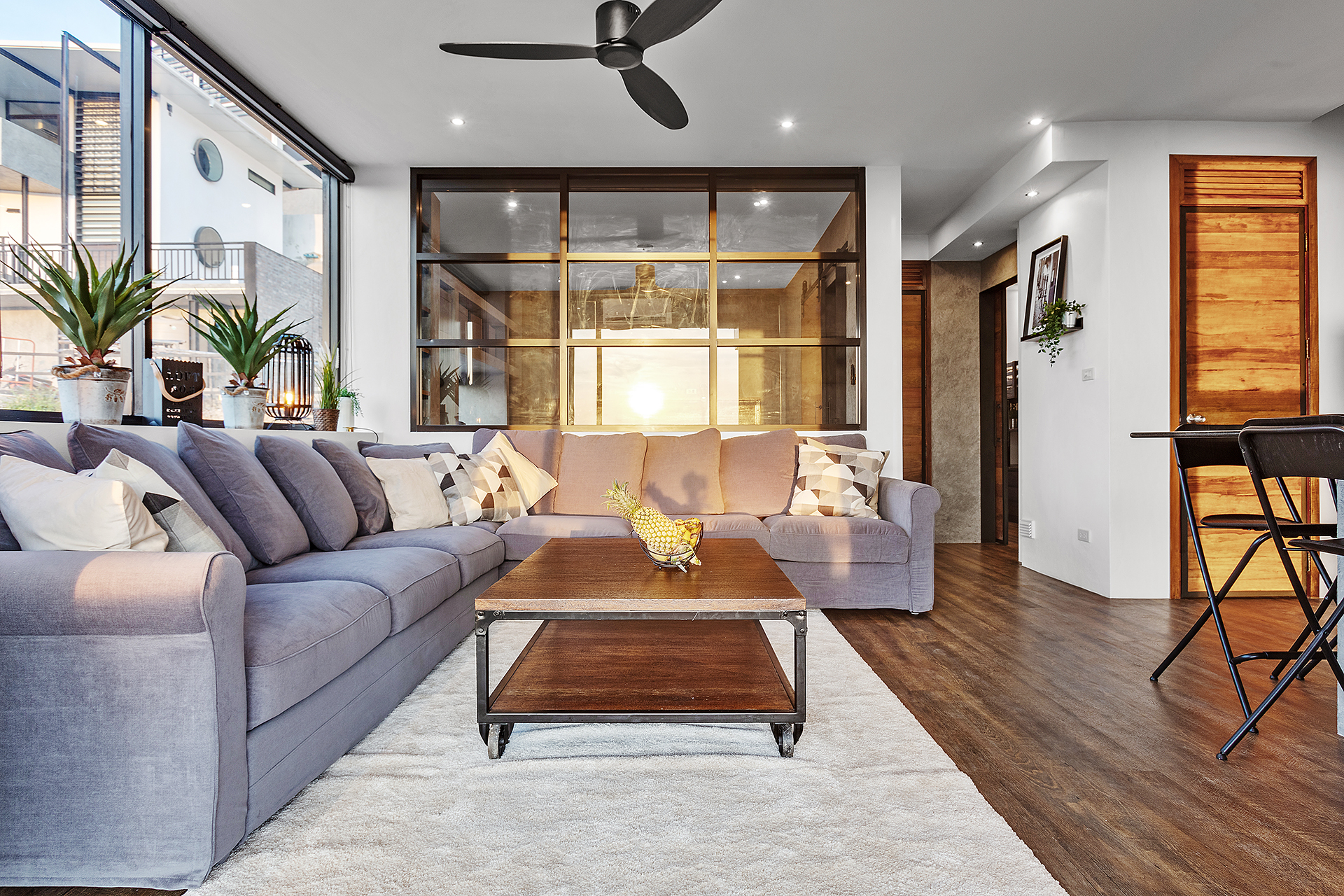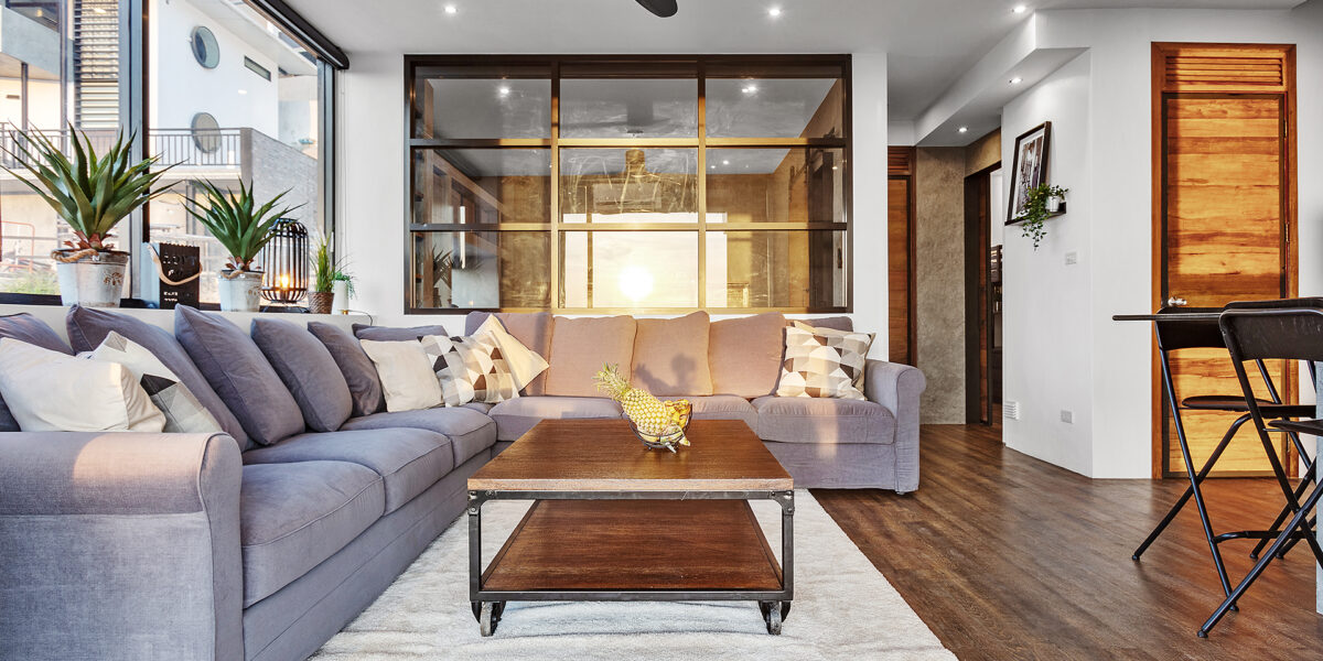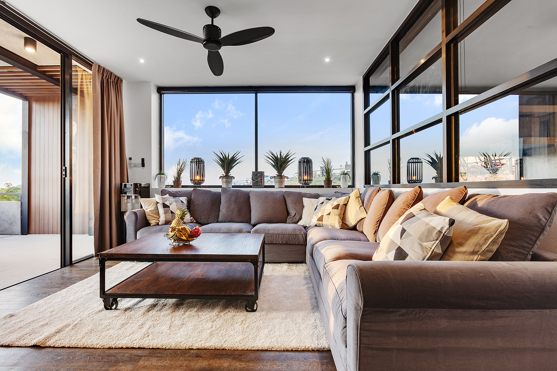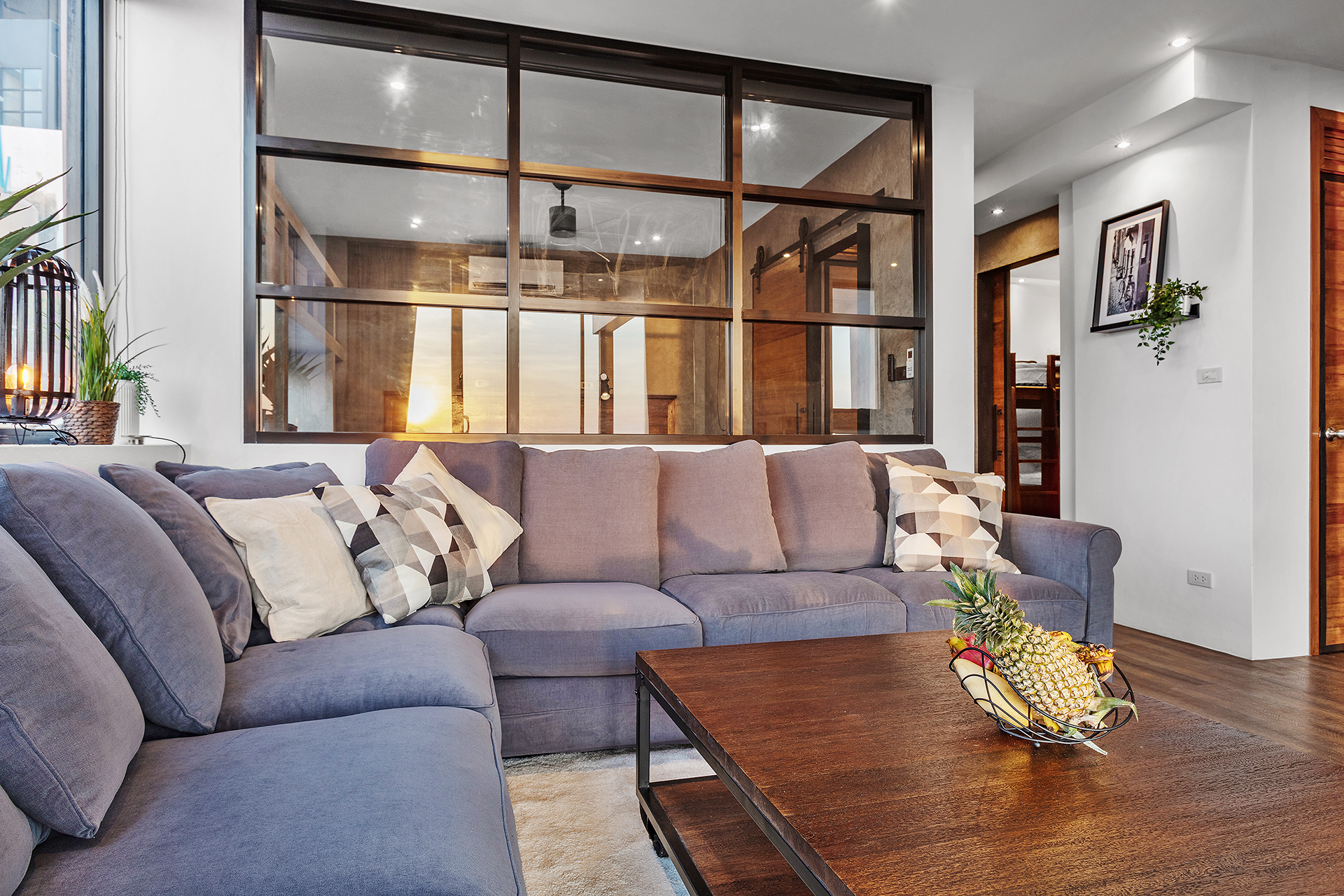 The open-plan living area features a large, ultra-comfortable sofa and a 43-inch smart TV, perfect for relaxing after a day of exploring. Floor-to-ceiling sliding glass doors open fully to the sea-view terrace, allowing for seamless indoor-outdoor living and refreshing ocean breezes.