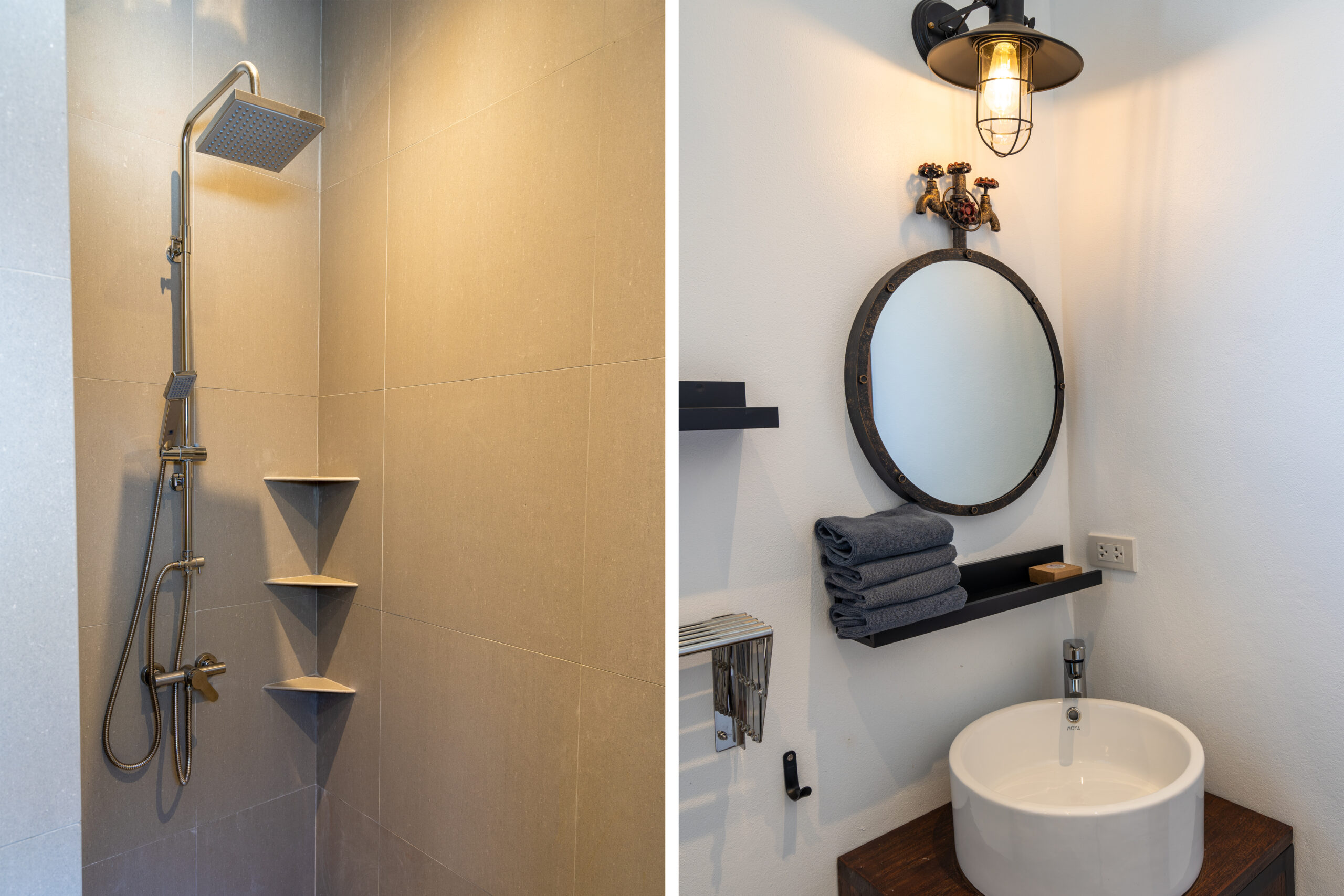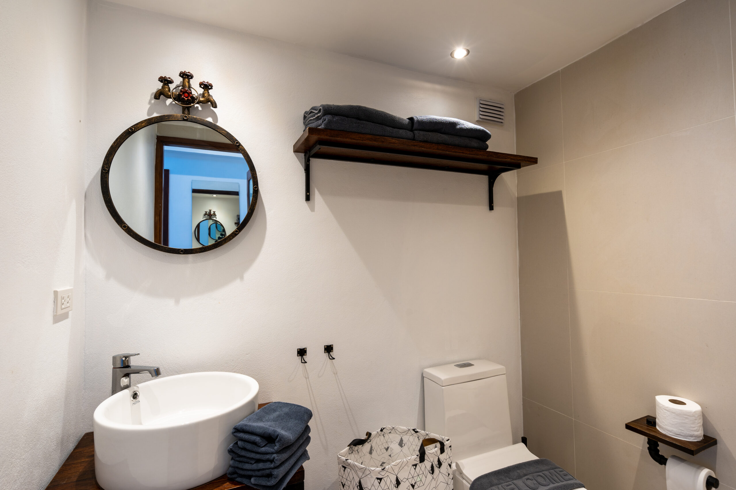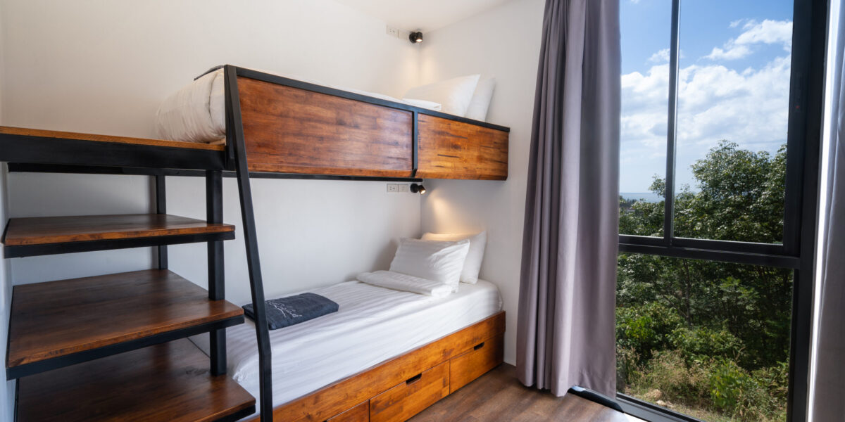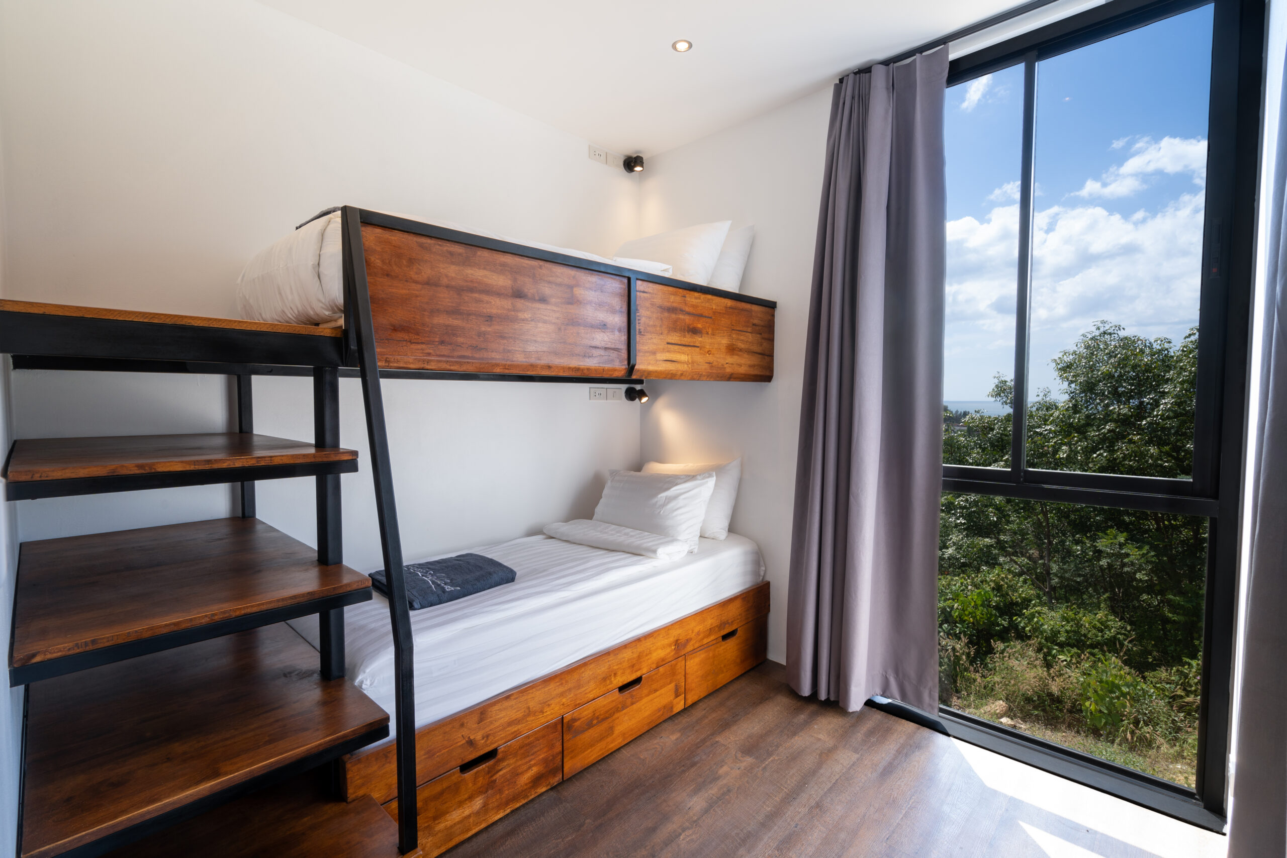 On the lower level, you’ll find the master bedroom, which includes a king-size bed, a TV, and access to a private balcony with sea views. Next to it, the second bedroom features a bunk bed with a desk and a laptop monitor. This level also has a bathroom for added convenience.