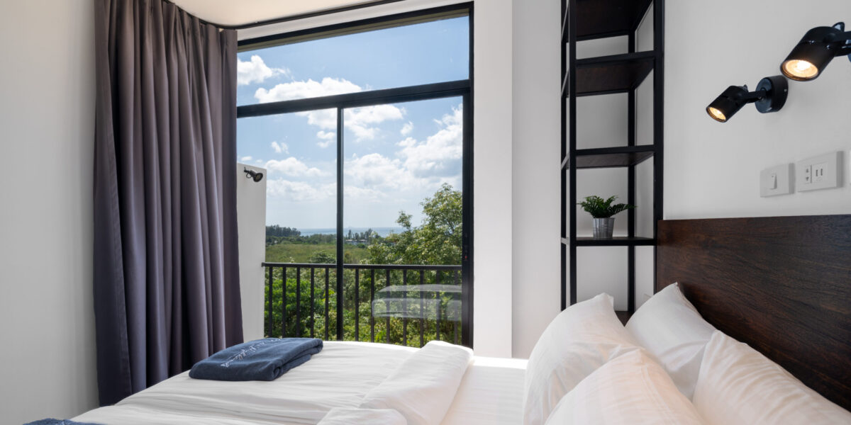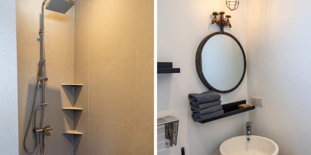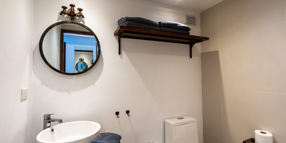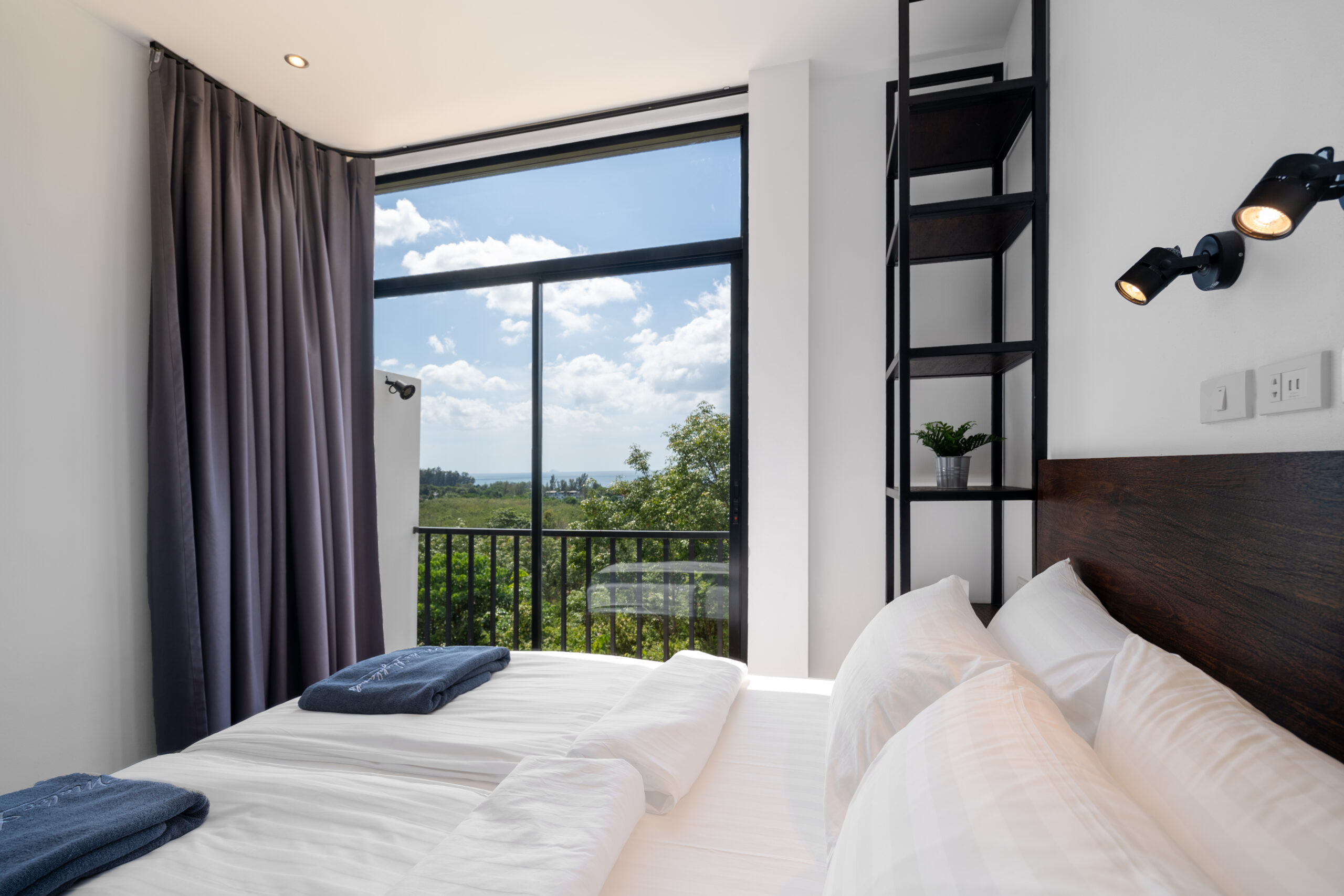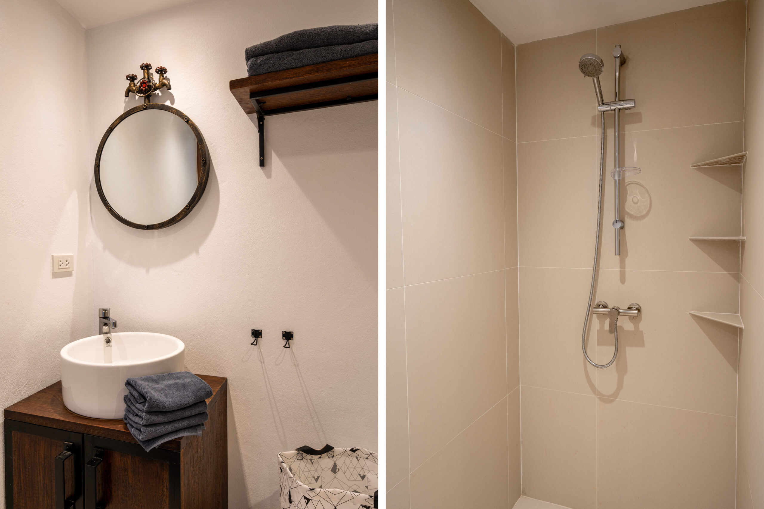 On the lower level, you’ll find the master bedroom, which includes a king-size bed, a TV, and access to a private balcony with sea views. Next to it, the second bedroom features a bunk bed with a desk and a laptop monitor. This level also has a bathroom for added convenience.