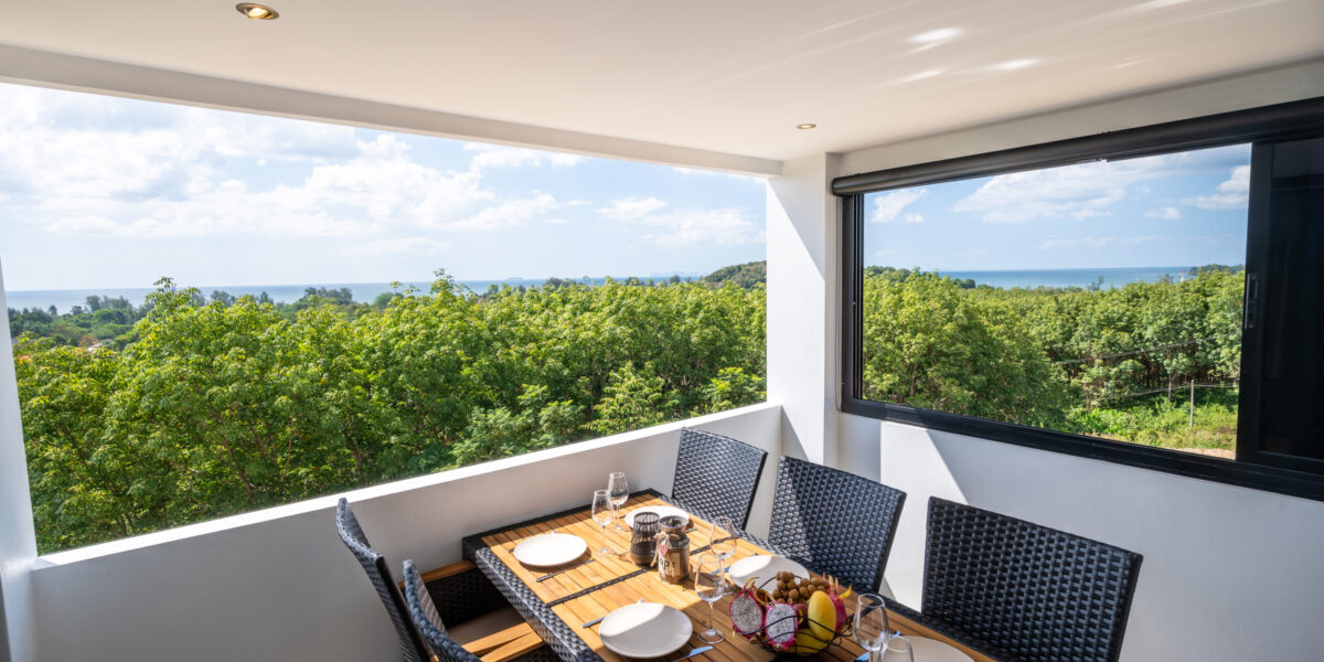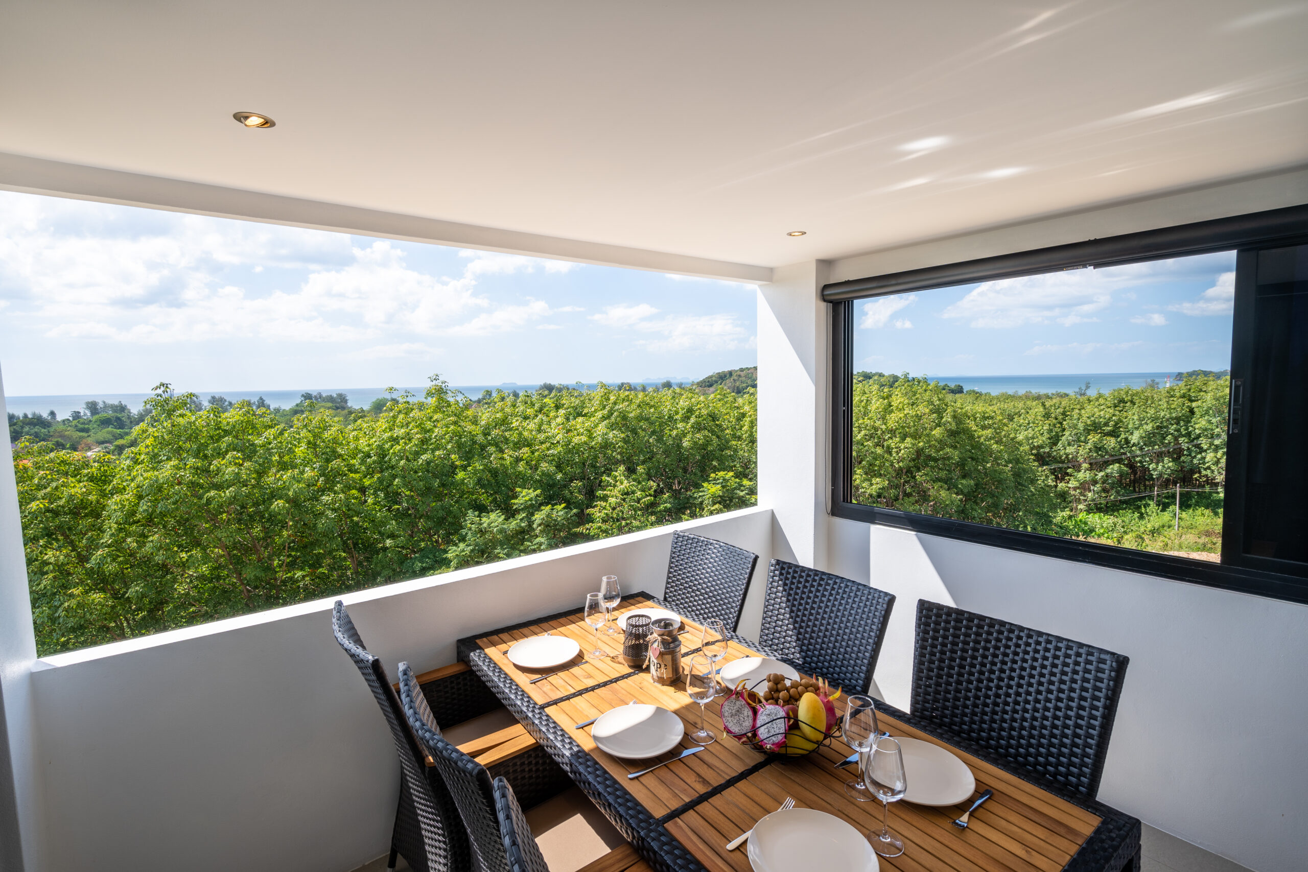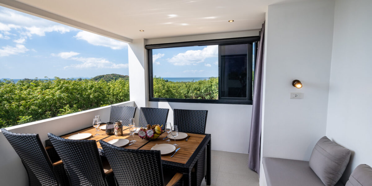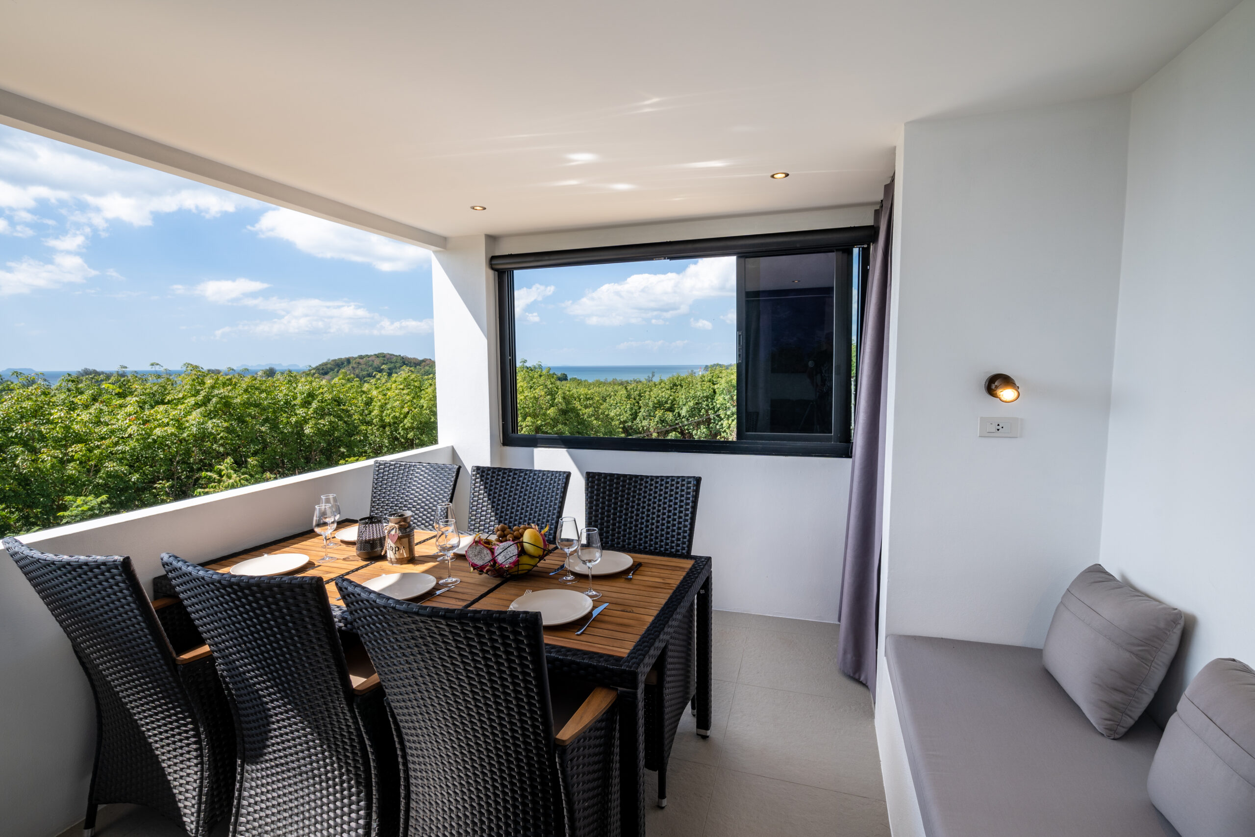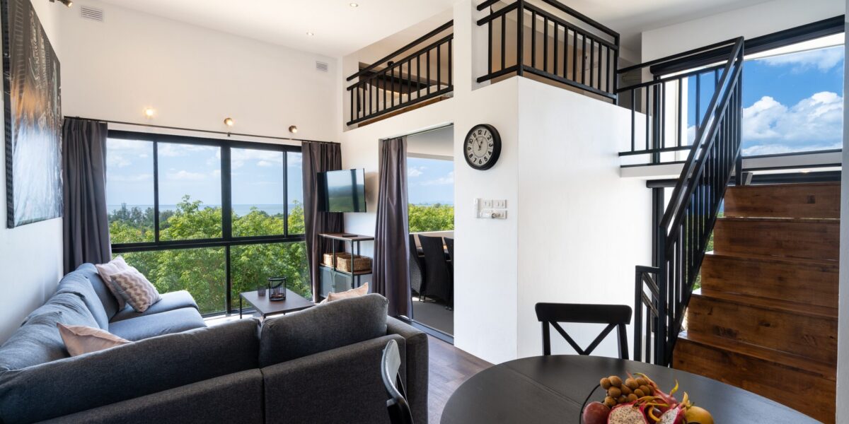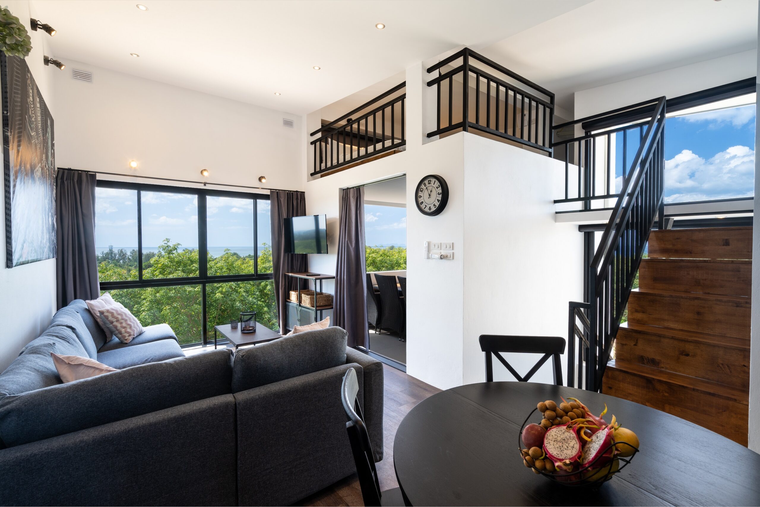 As you enter, you are welcomed into the open-plan kitchen, dining, and living area, where large windows frame the ocean views. The living area features a spacious sofa and a 43-inch smart TV, making it the perfect place to relax while enjoying the scenery.