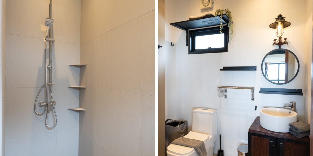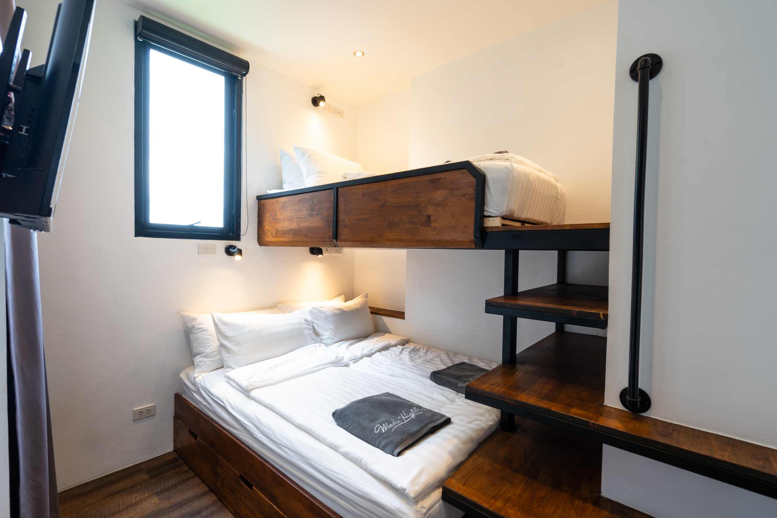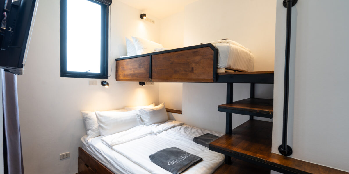 On the lower level, you’ll find the master bedroom, which includes a king-size bed, a TV, and access to a private balcony with sea views. Next to it, the second bedroom features a bunk bed with a lower queen-size bed and the upper is a single bed.. This level also has a bathroom for added convenience.