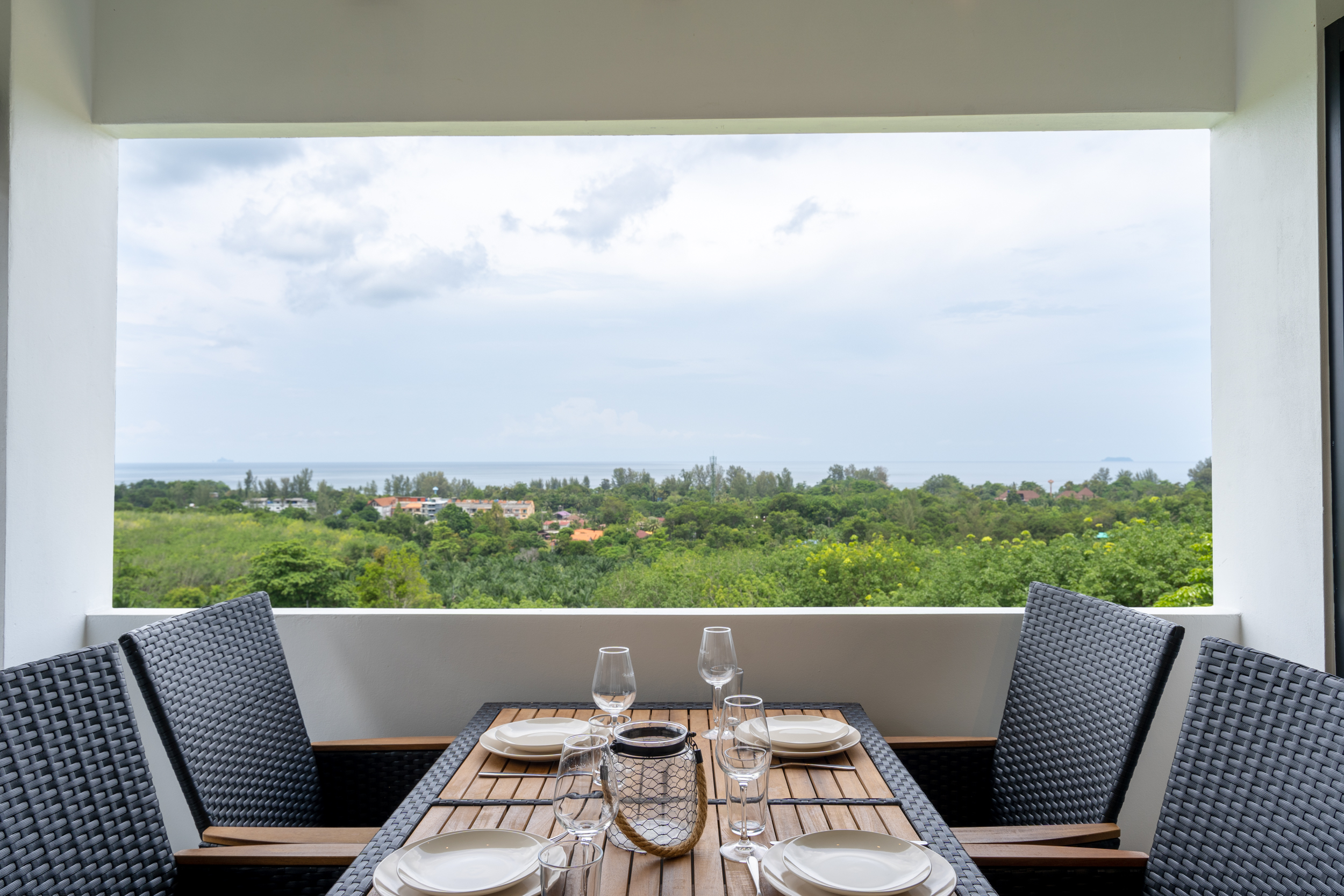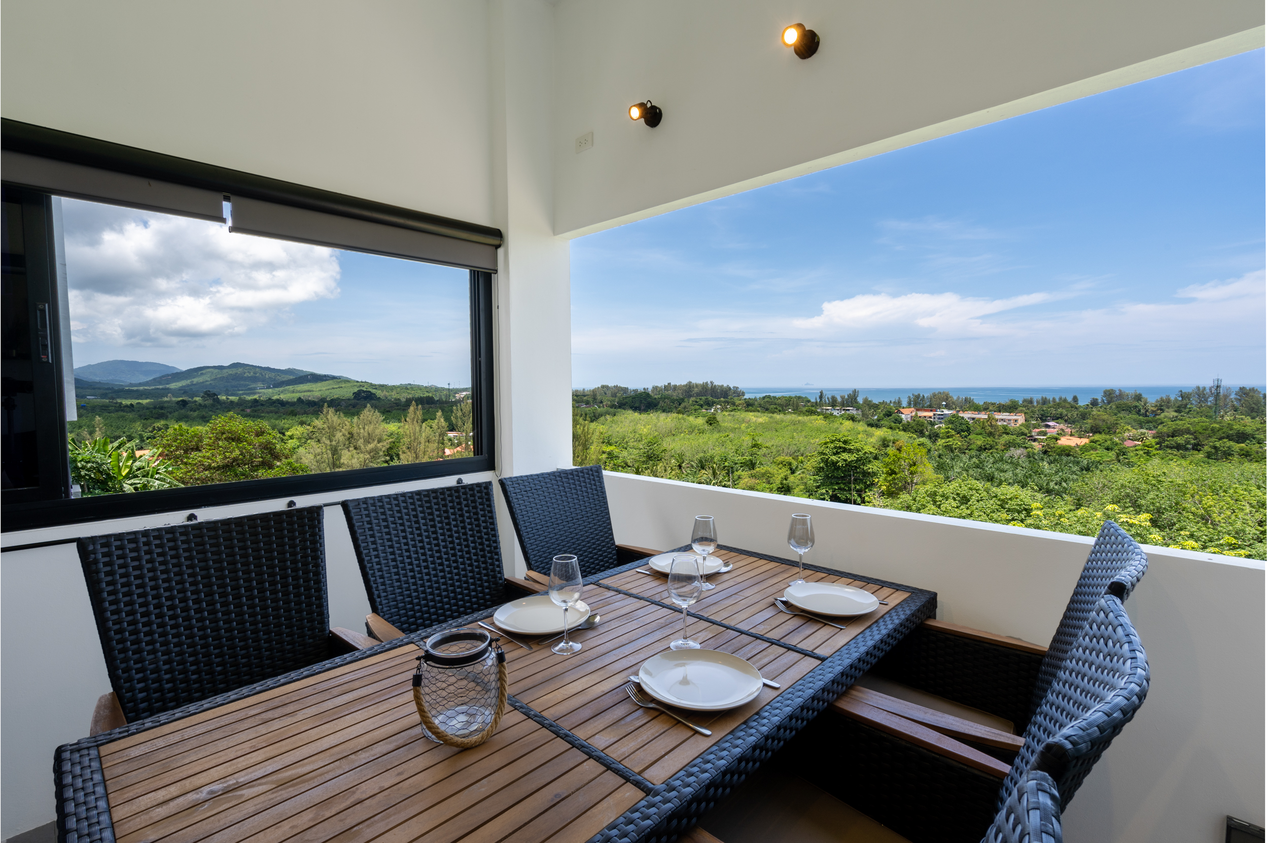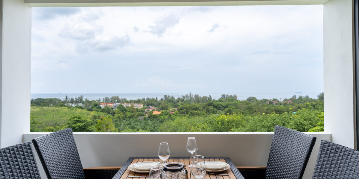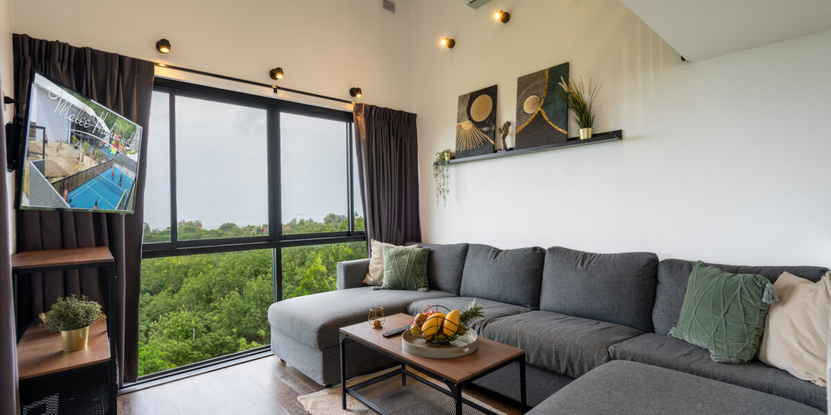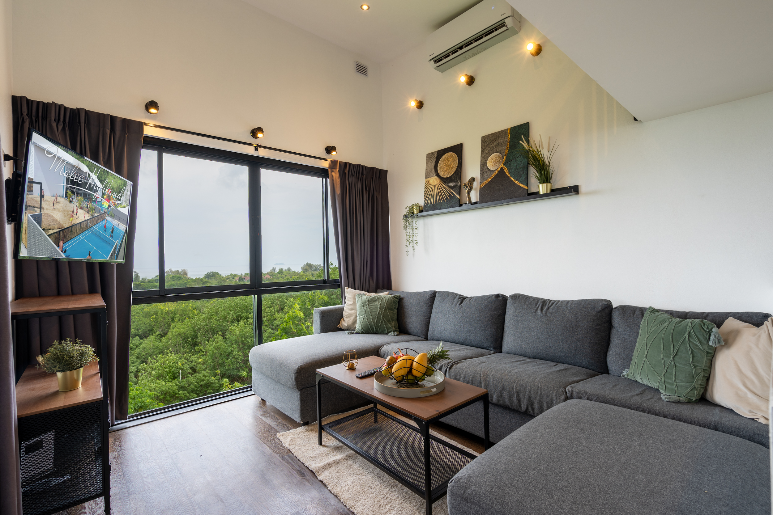As you enter, you are welcomed into the open-plan kitchen, dining, and living area, where large windows frame the ocean views. The living area features a spacious sofa and a 43-inch smart TV, making it the perfect place to relax while enjoying the scenery.