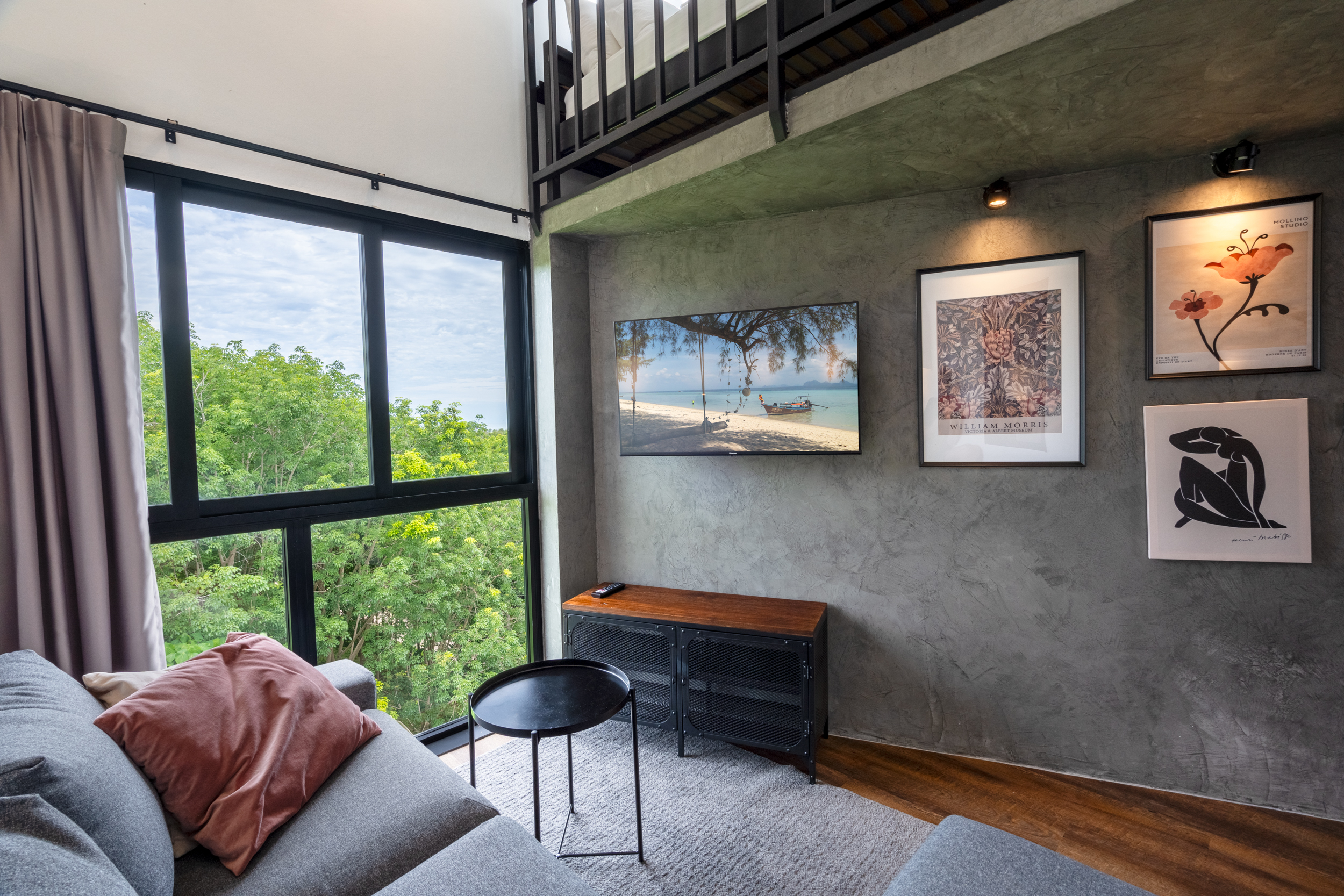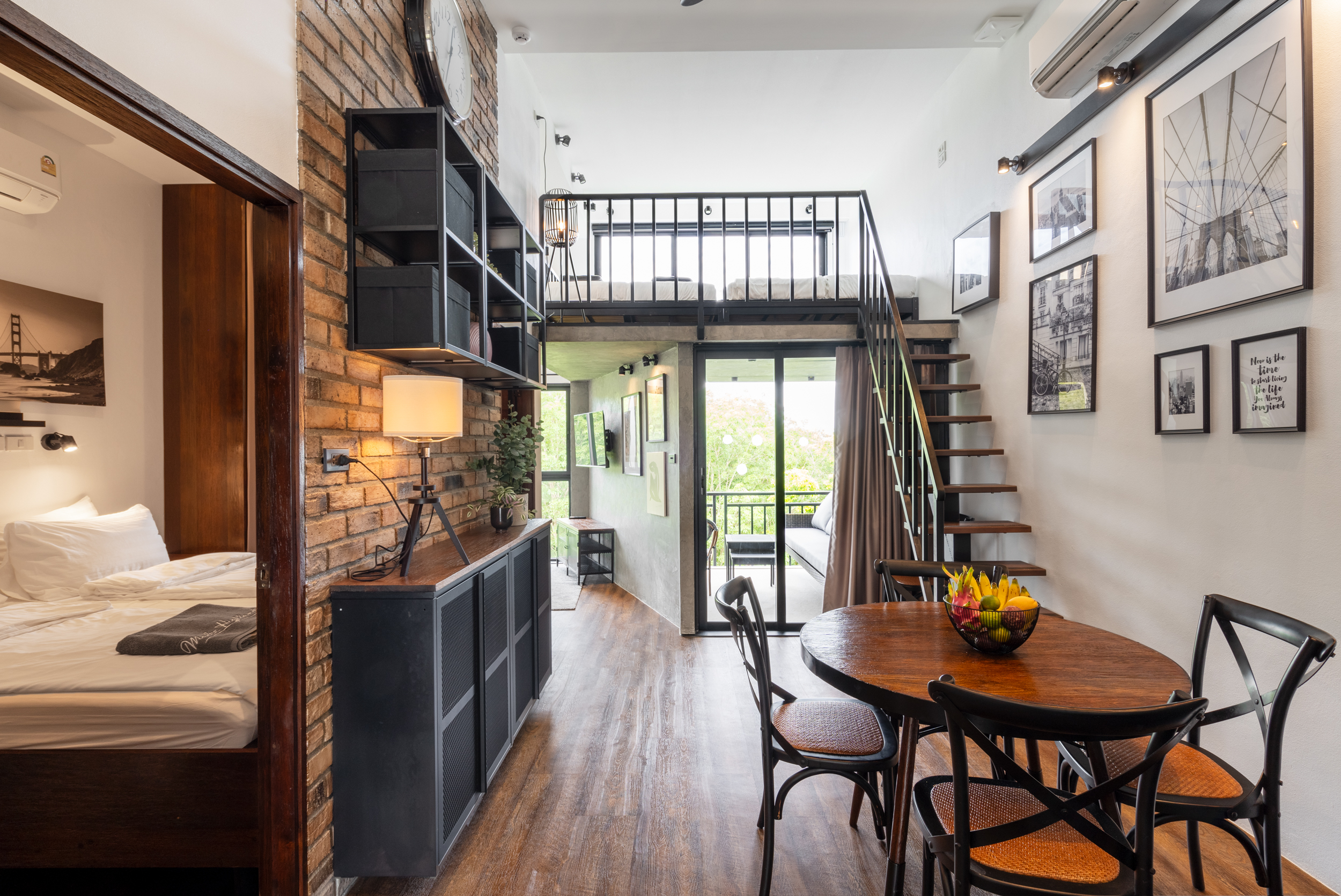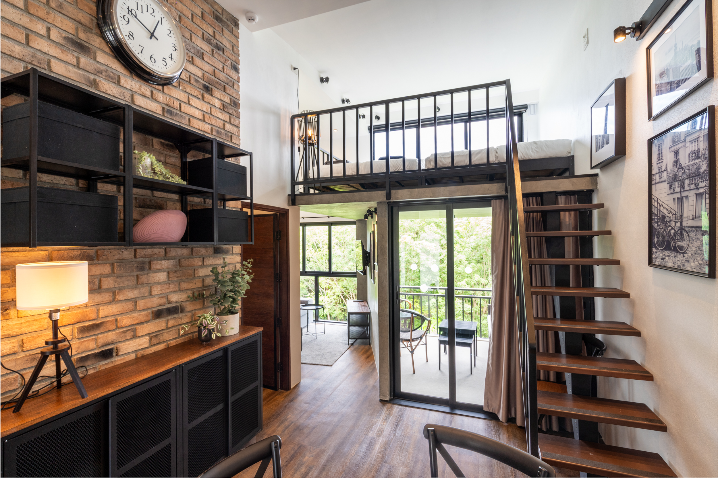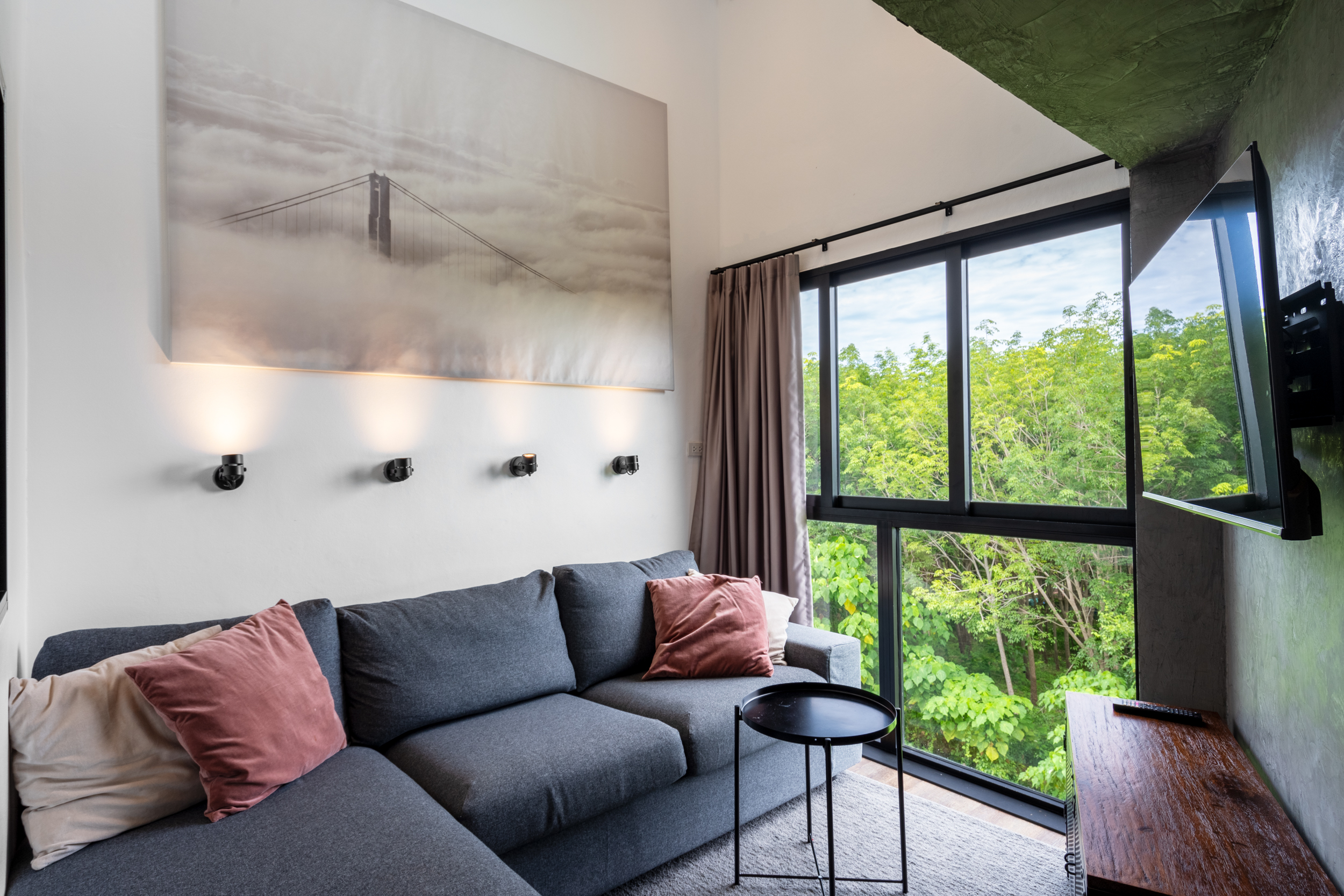 Welcome to Apartment I3 – a 57 sqm split-level home that blends industrial design with modern comfort, perfect for a medium-sized family or group. With high ceilings, large windows, and a cozy loft, this thoughtfully designed space offers a bright, airy atmosphere and stunning views of the surrounding jungle.