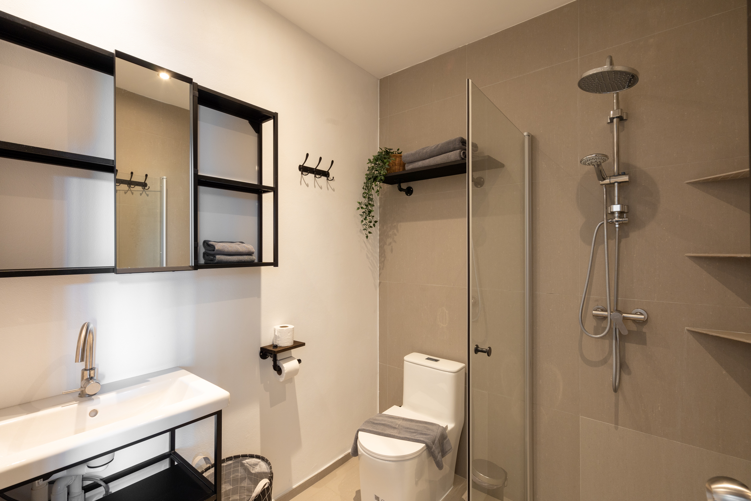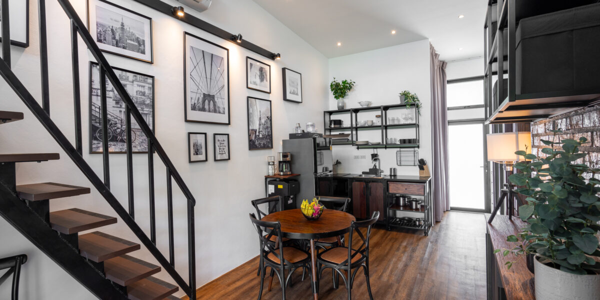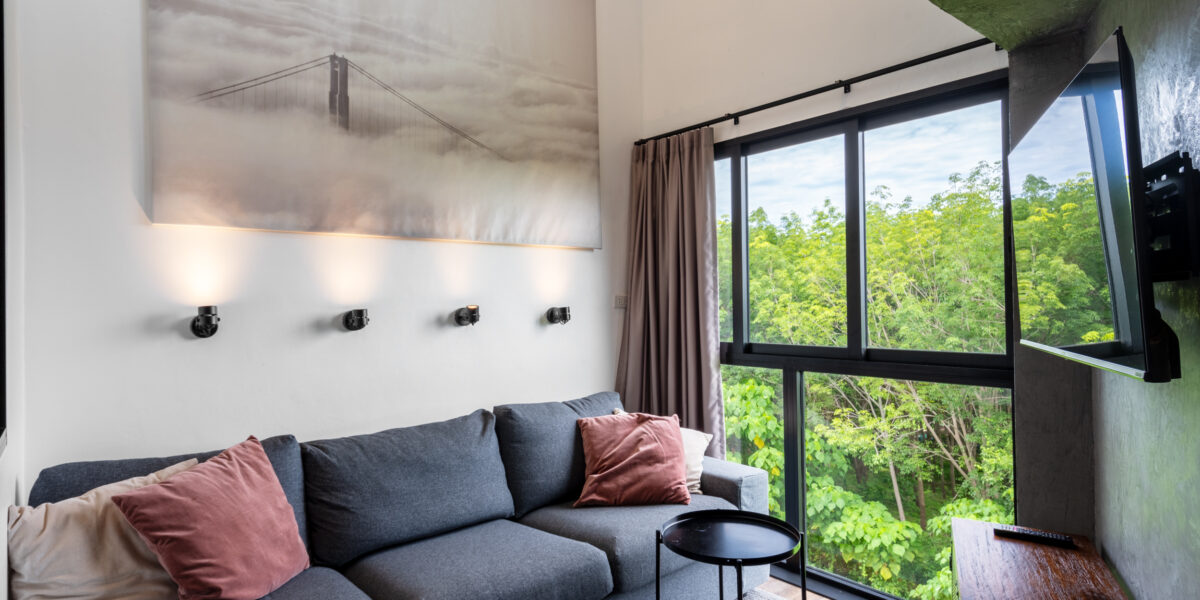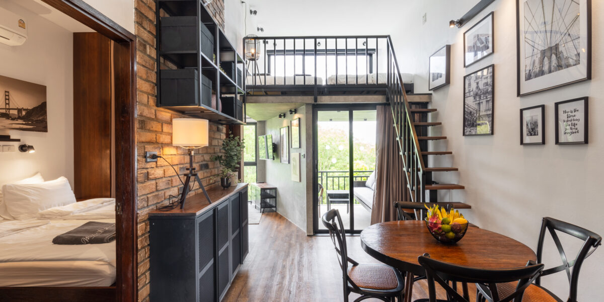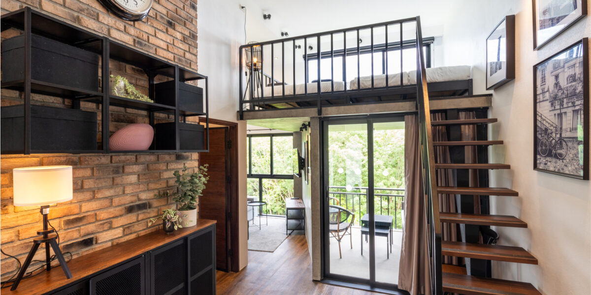 Welcome to Apartment I3 – a 57 sqm split-level home that blends industrial design with modern comfort, perfect for a medium-sized family or group. With high ceilings, large windows, and a cozy loft, this thoughtfully designed space offers a bright, airy atmosphere and stunning views of the surrounding jungle.