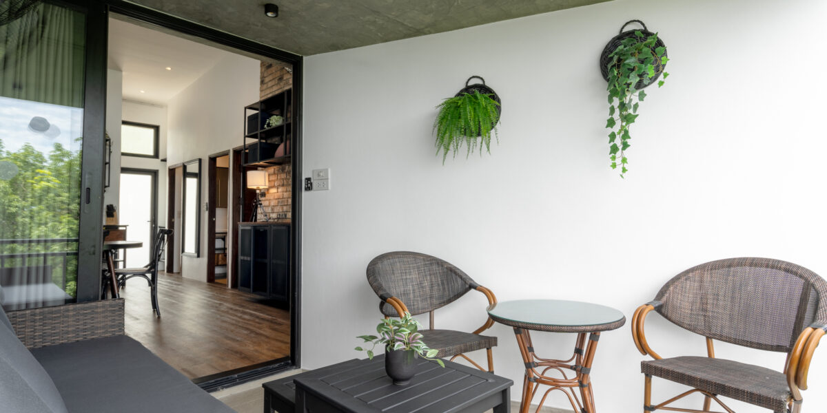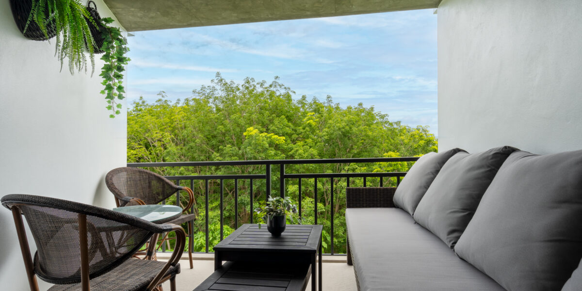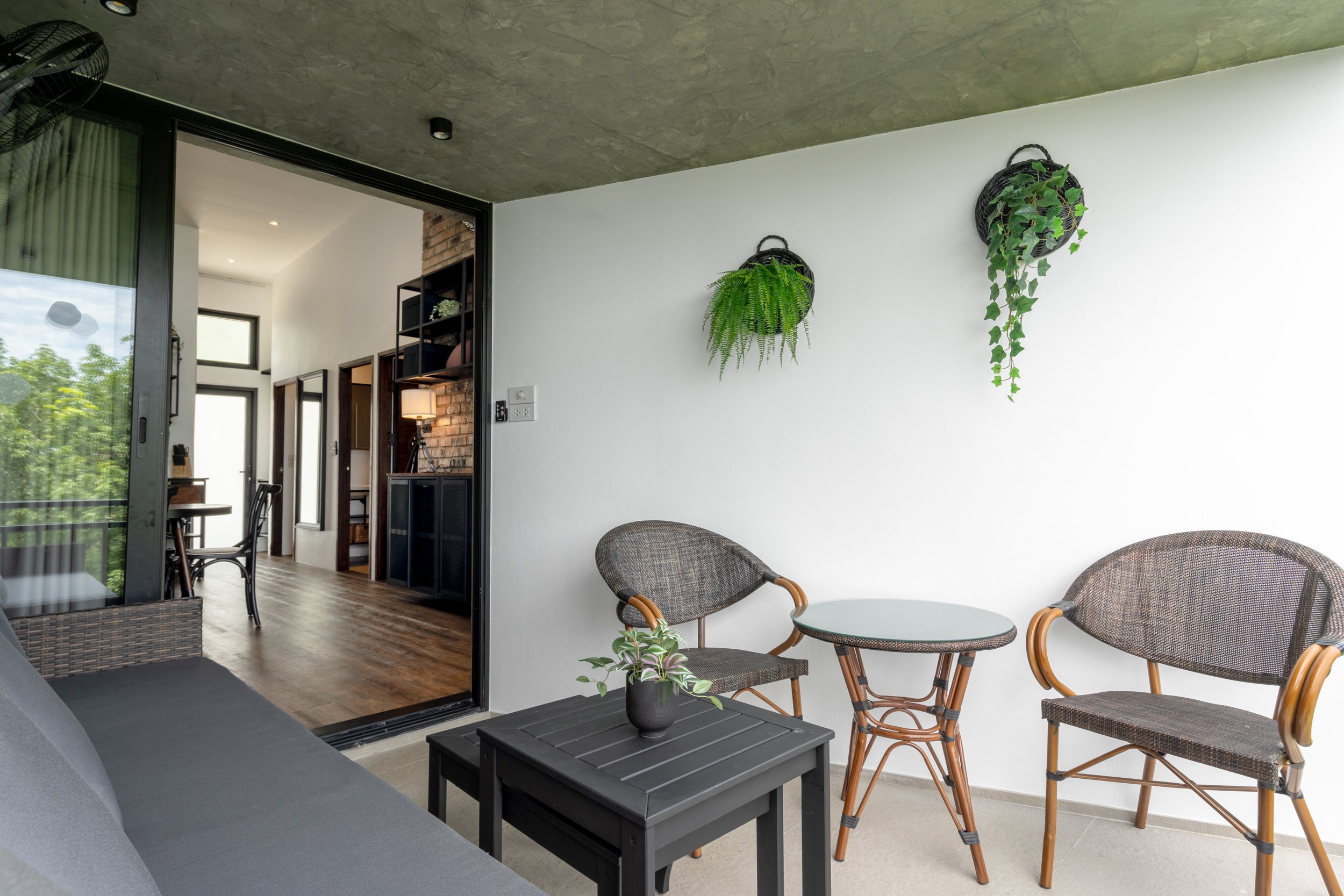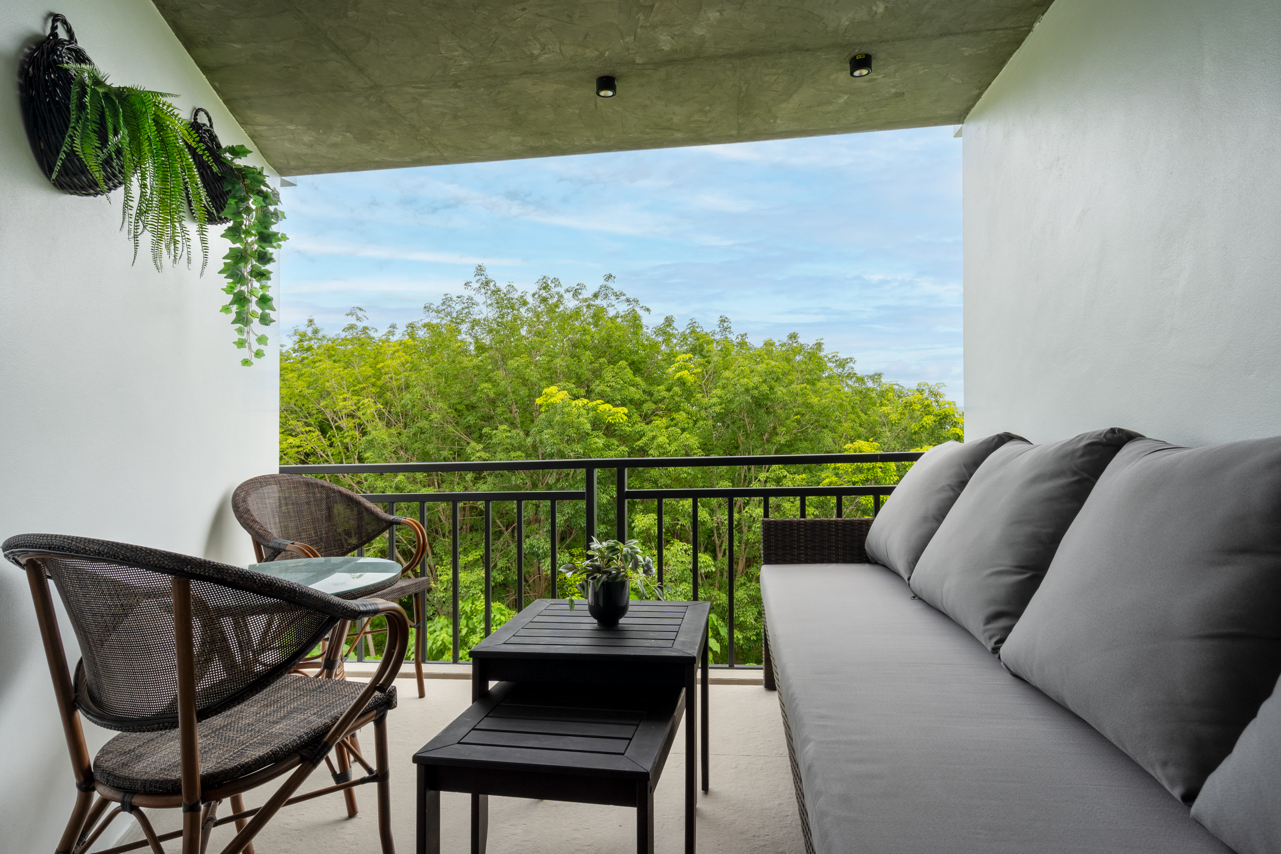 Step out onto the private terrace overlooking the jungle, where a comfortable sofa, coffee table, and wall-mounted fan create an inviting space to relax and enjoy the natural surroundings.