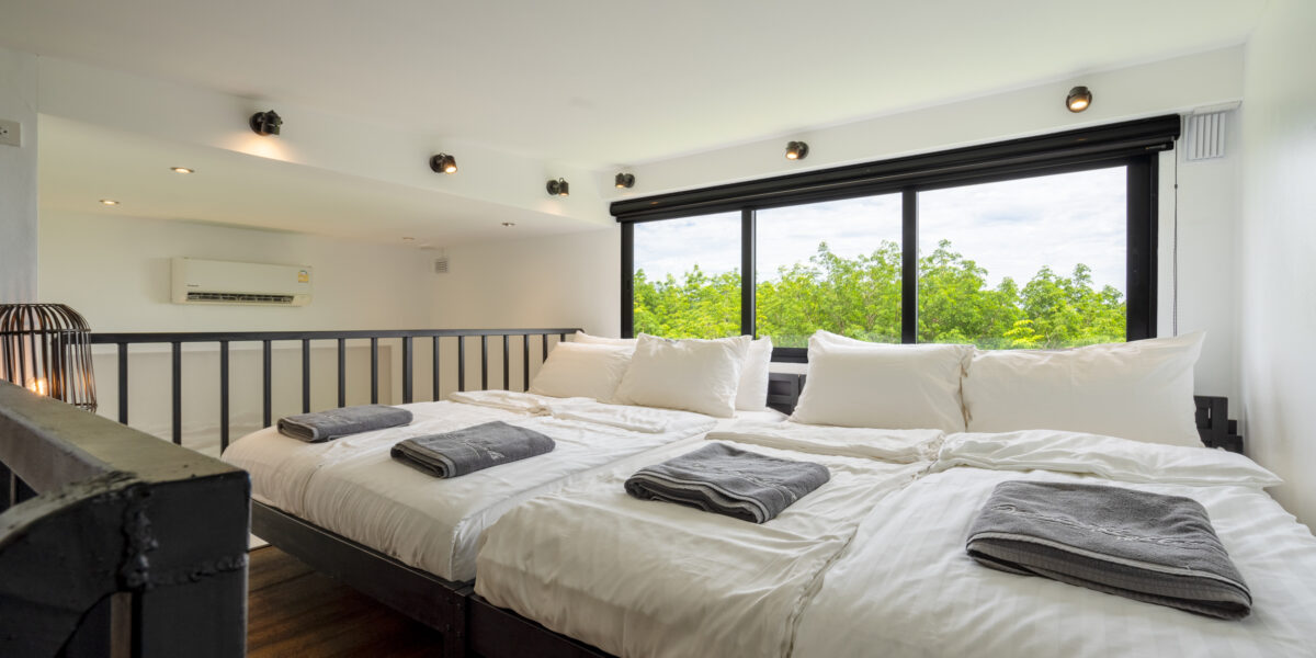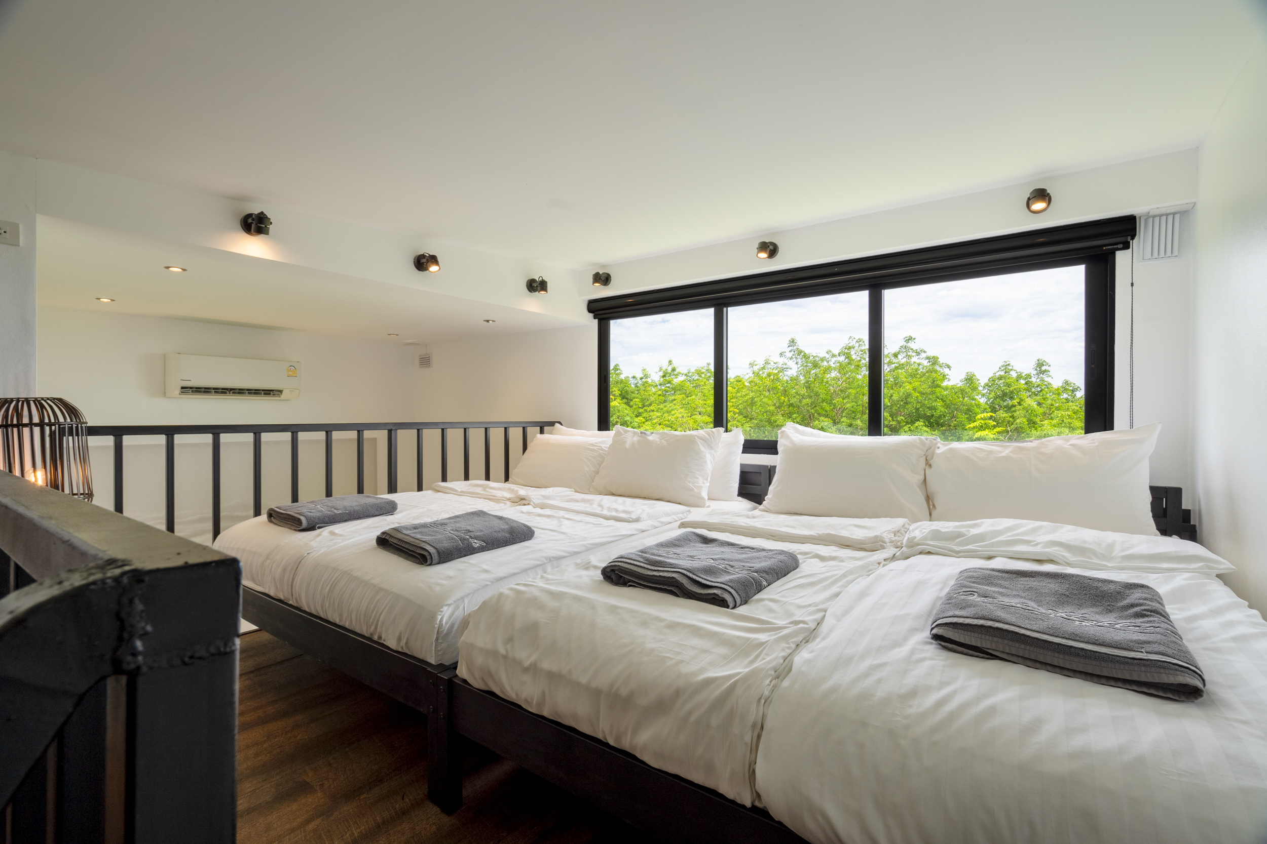 The master bedroom offers a peaceful retreat with a king-sized bed, air conditioning, and wardrobes on either side for ample storage. The loft serves as a second sleeping area, complete with two queen-size beds and a large window showcasing beautiful views. All beds feature IKEA mattresses and high-quality linens to ensure a restful night’s sleep.