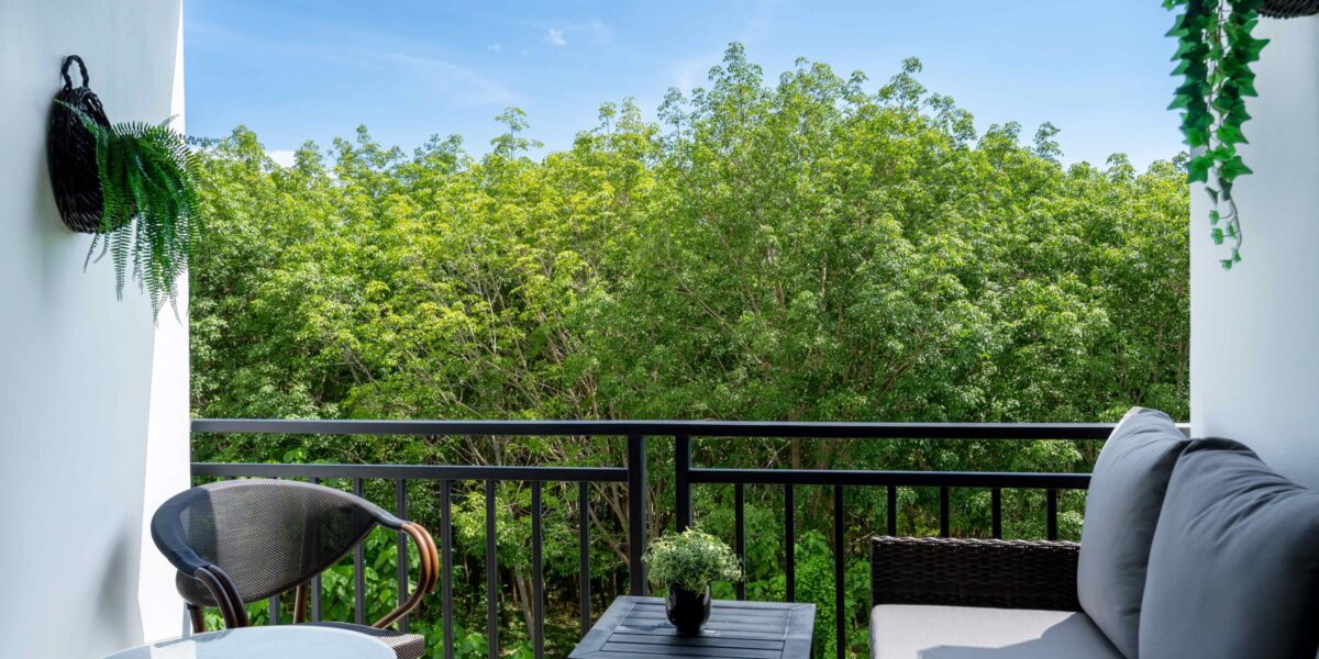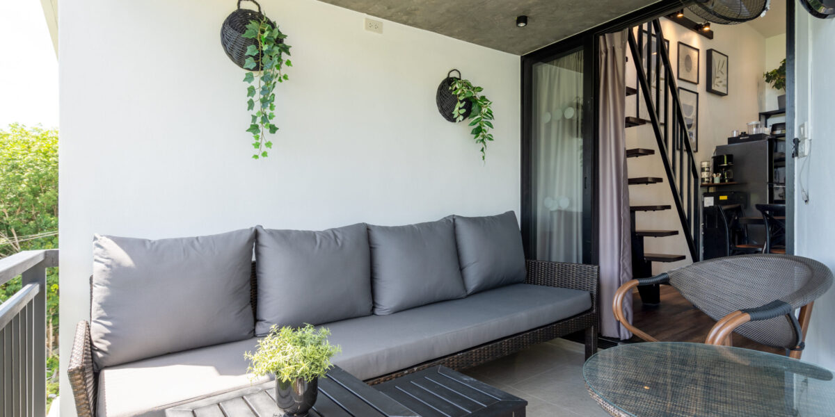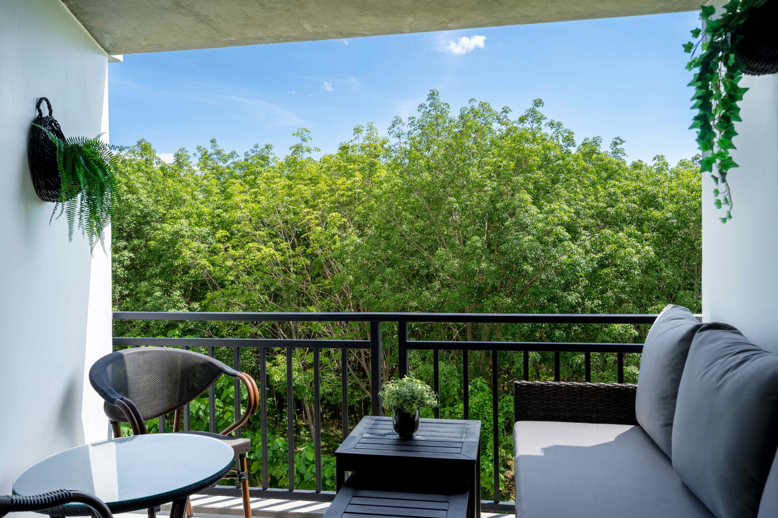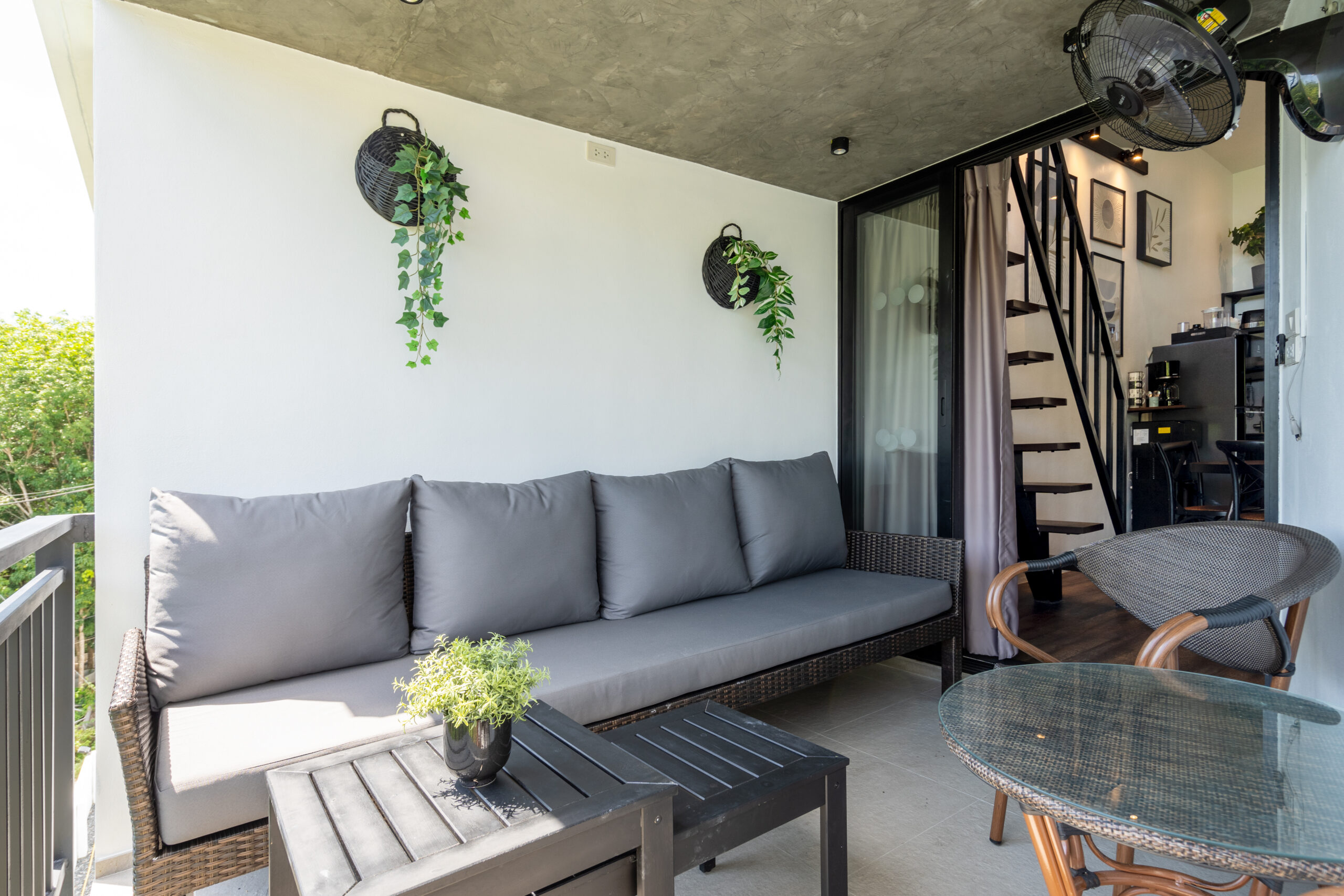 Step out onto the private terrace with jungle views, where a cozy outdoor sofa, coffee table, and wall-mounted fan create the perfect spot to relax and enjoy the natural surroundings.