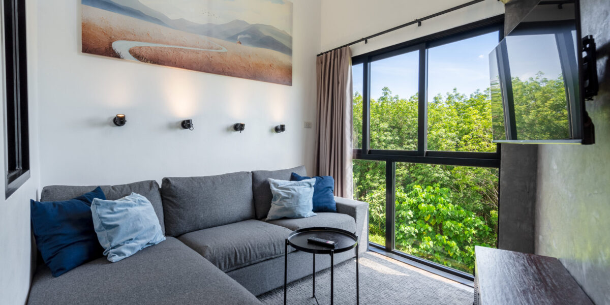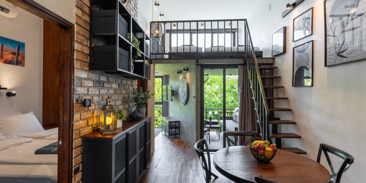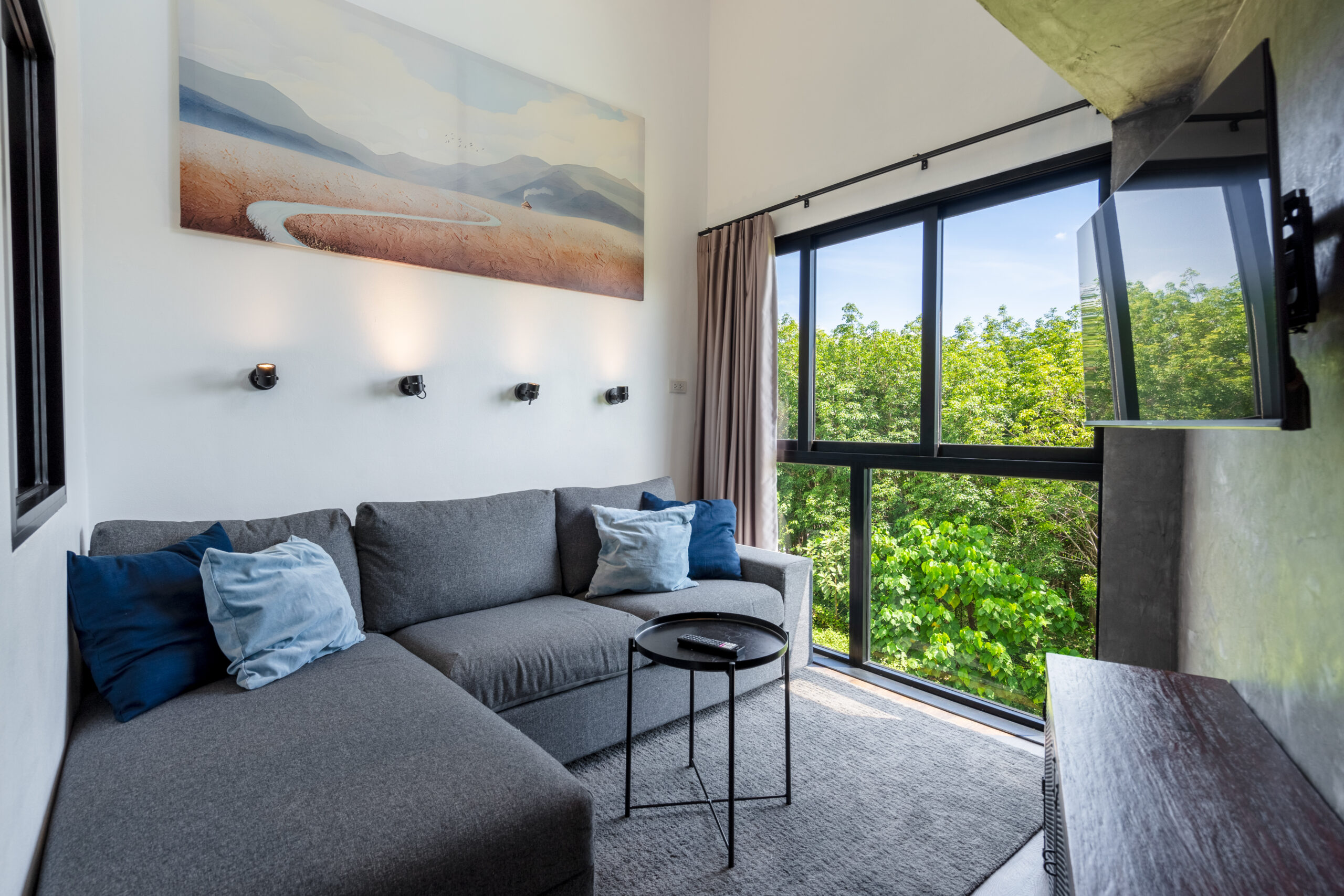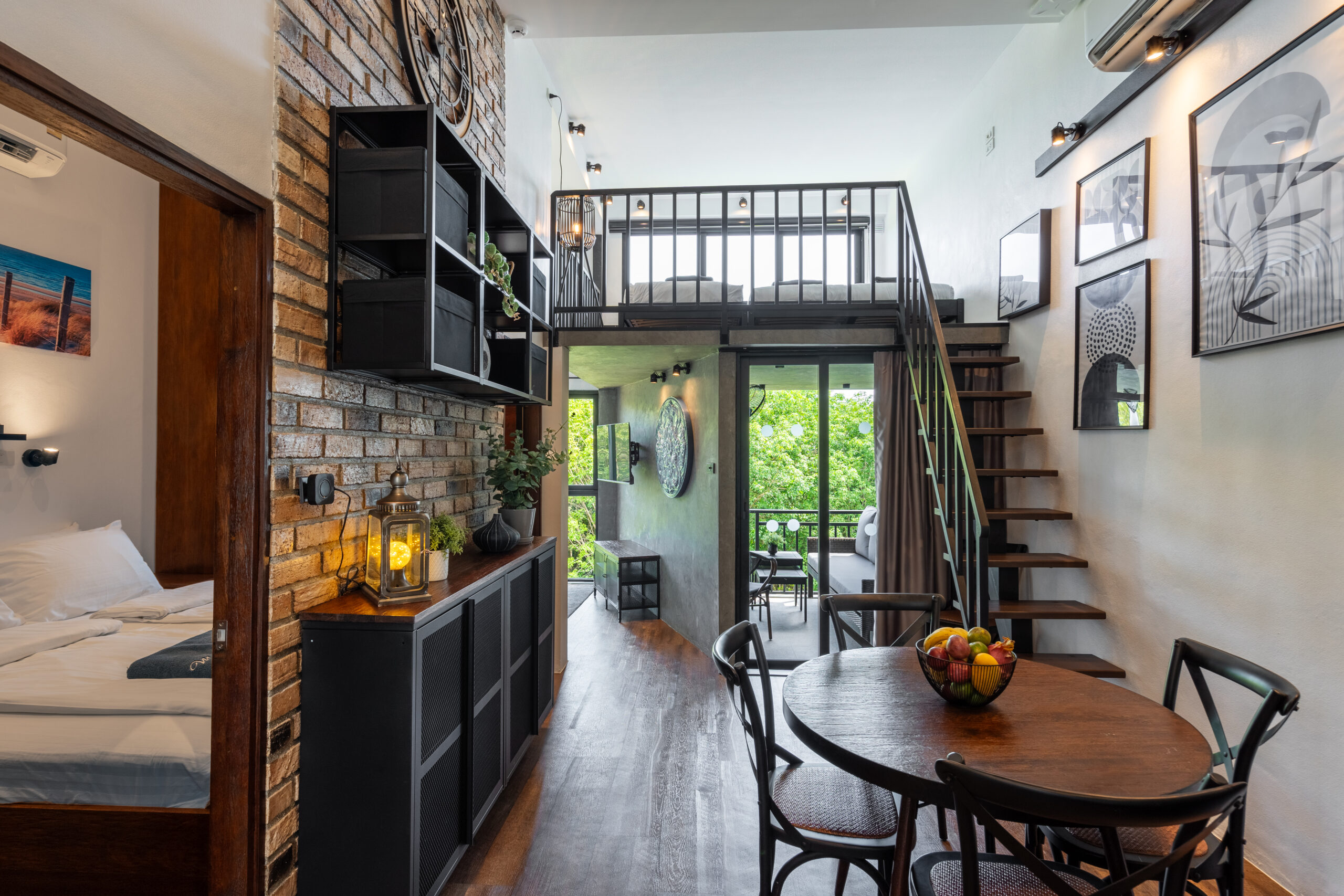 Welcome to Apartment I4 – a 57 sqm split-level home that blends industrial design with modern comfort, perfect for a medium-sized family or group. With high ceilings, large windows, and a cozy loft, this thoughtfully designed space offers a bright, airy atmosphere and stunning views of the surrounding jungle.