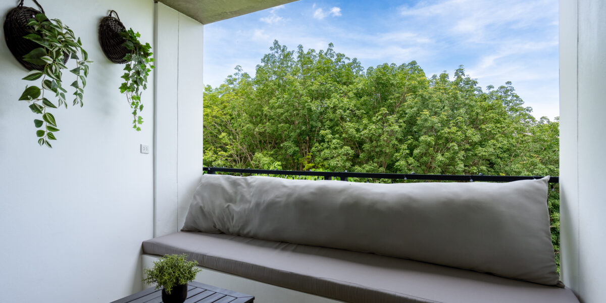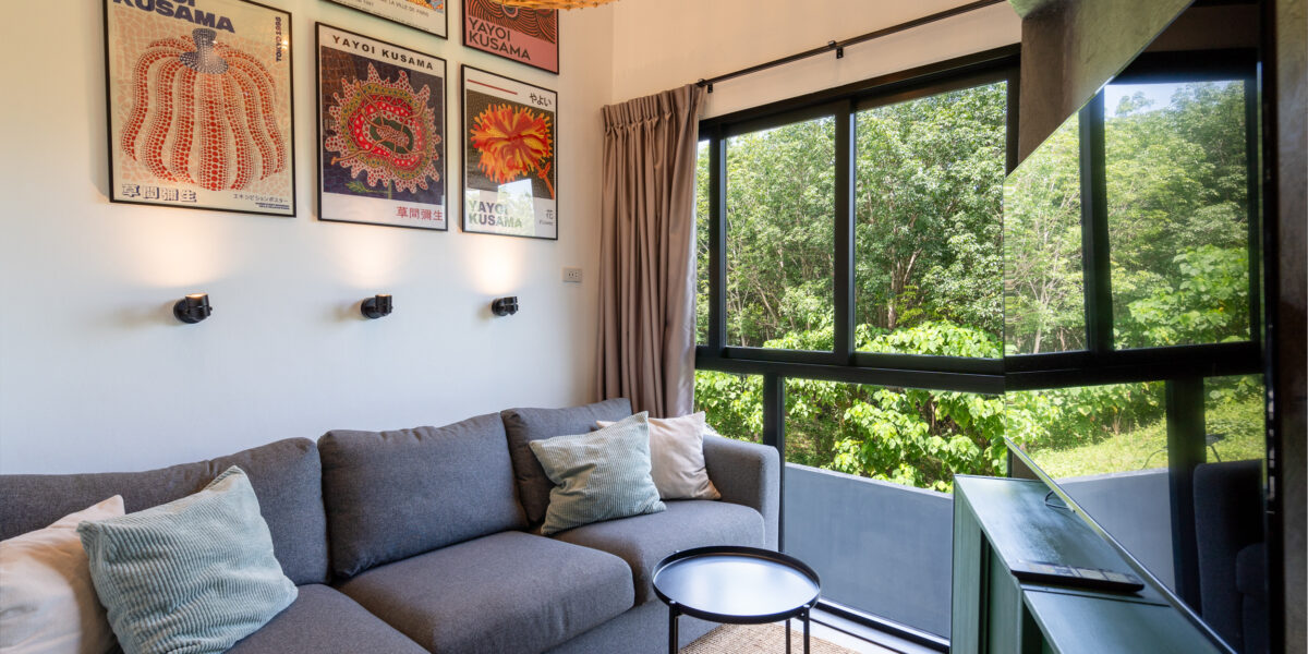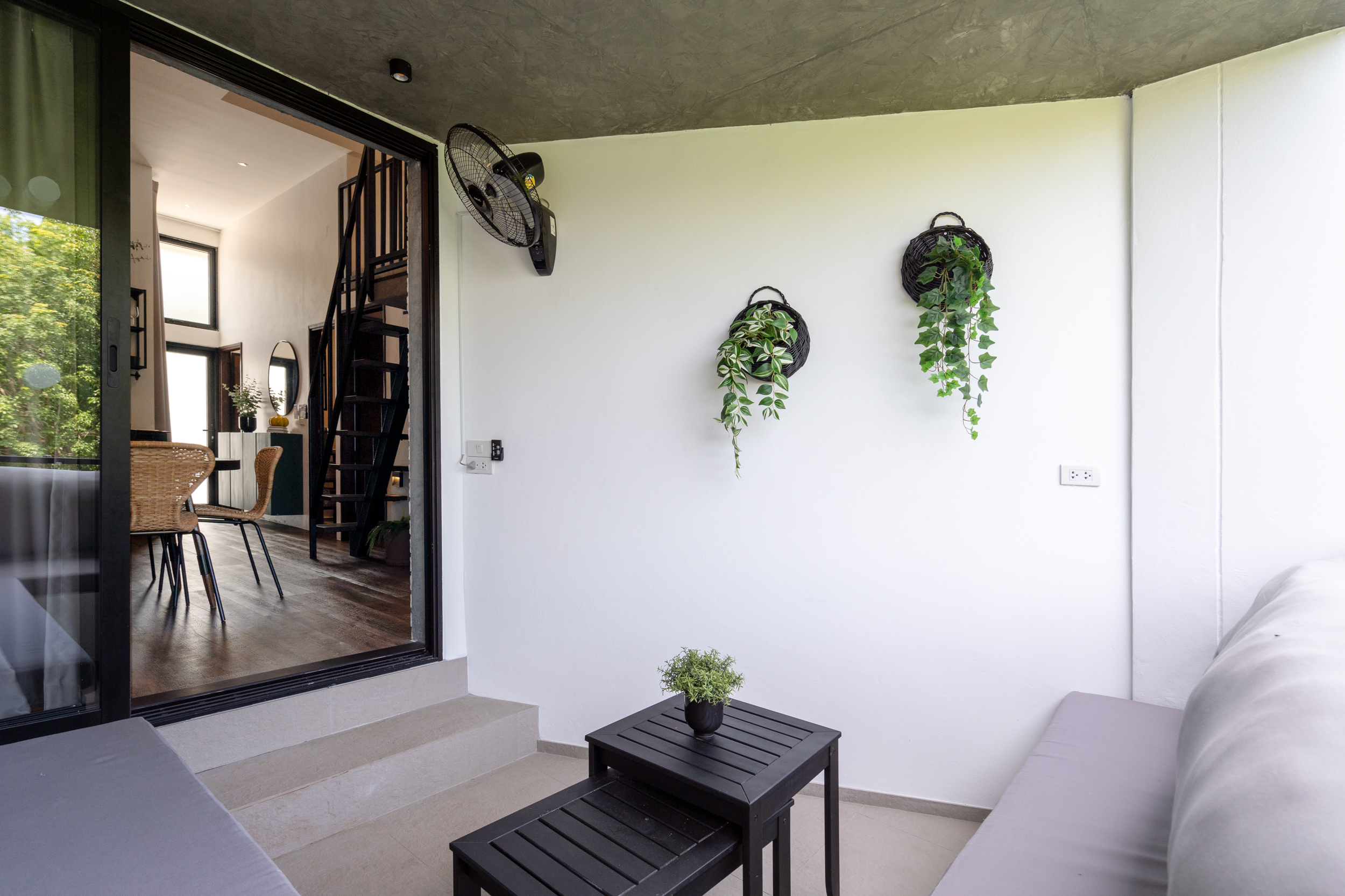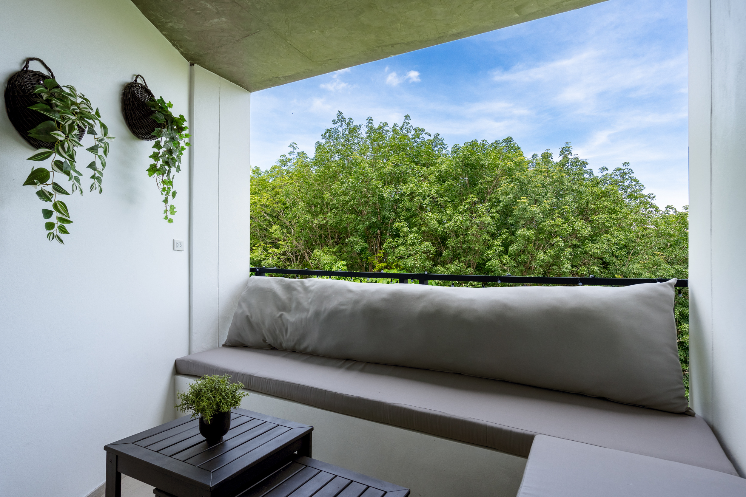 Step out onto the private jungle-view terrace, where a large L-shaped sofa, coffee table, and wall-mounted fan create an inviting outdoor lounge space to relax and soak in the natural surroundings.