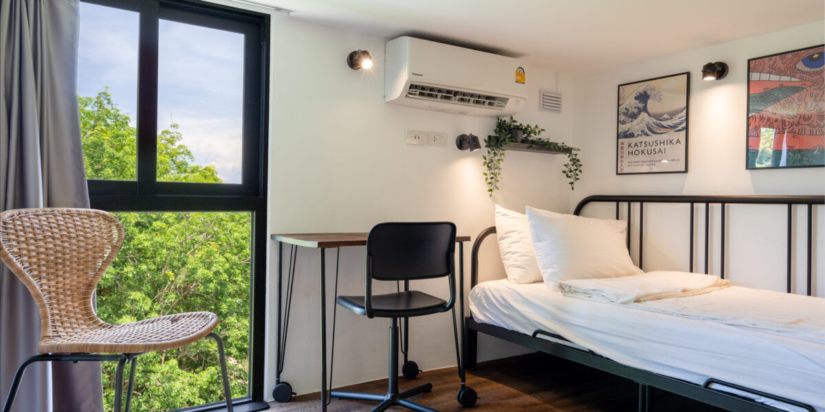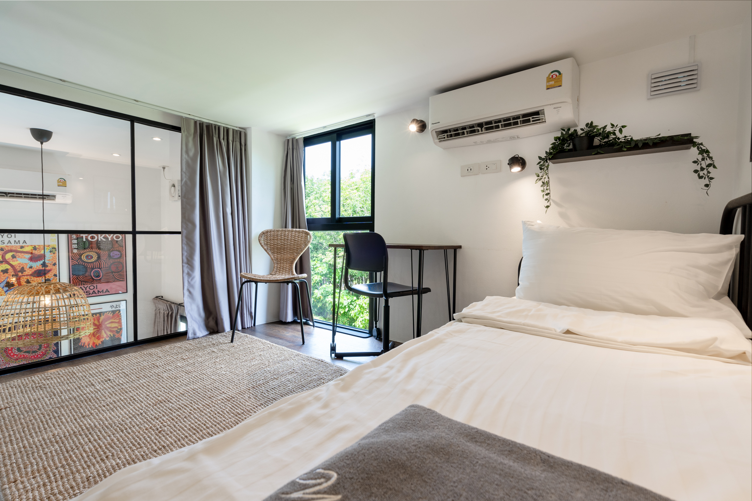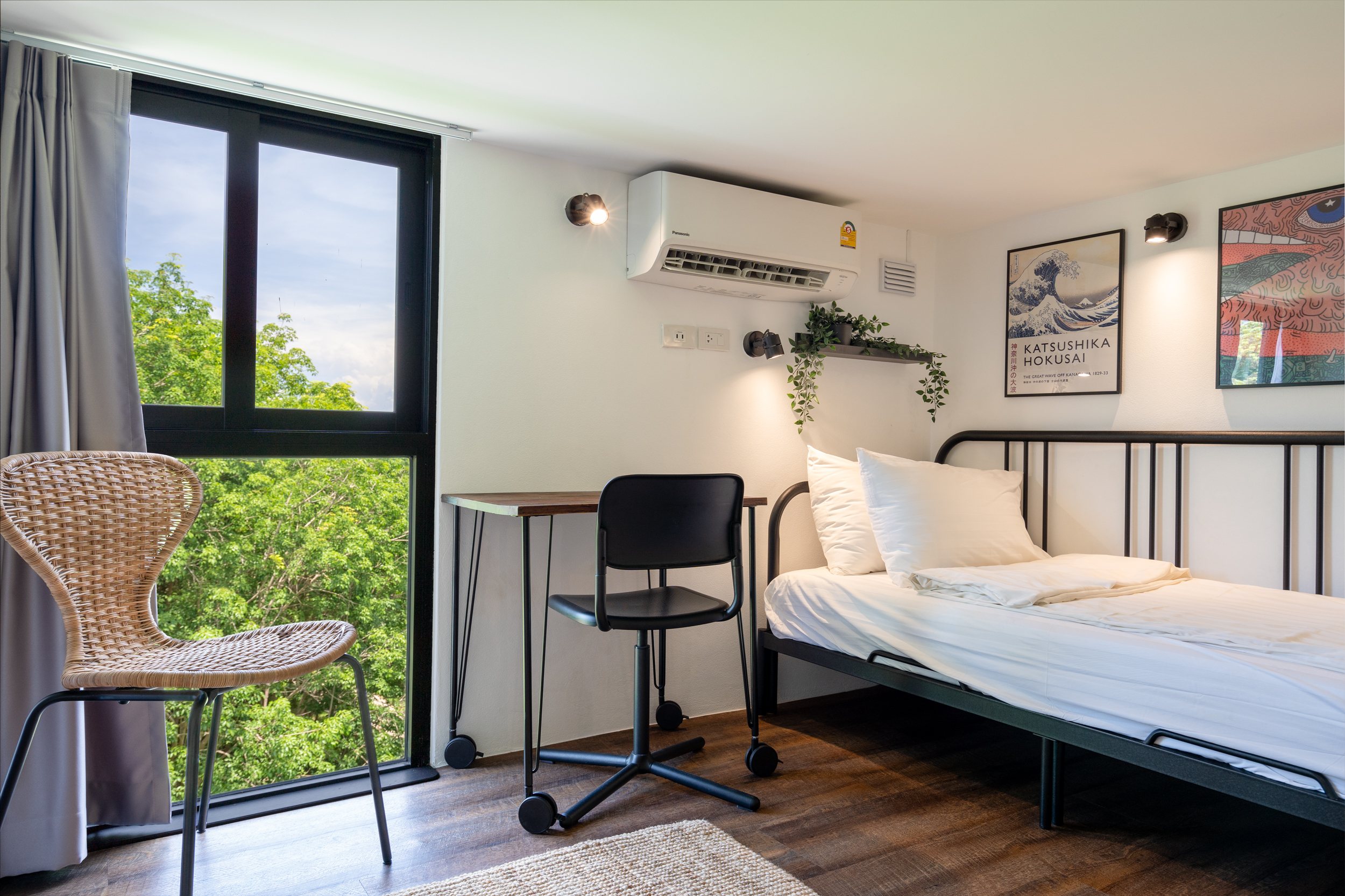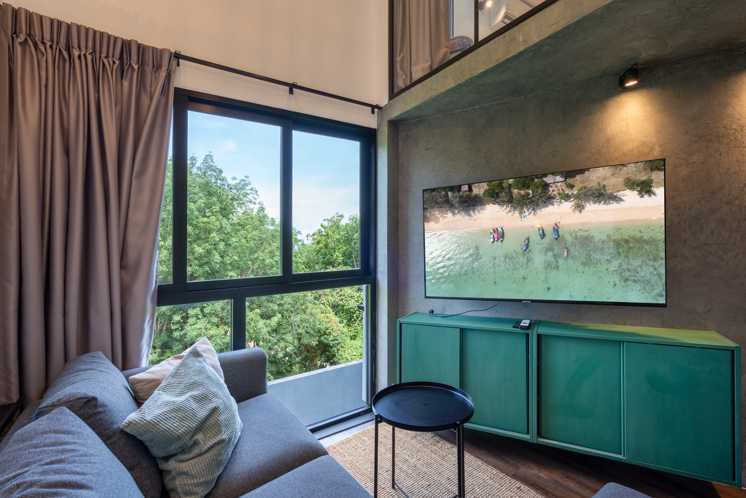 The master bedroom is designed for total relaxation, offering a king-size bed, air conditioning, and a 43-inch smart TV. One loft bedroom features two single beds and a workspace for two. The second loft bedroom includes a single bed, air conditioning, a dedicated work desk with a 24-inch screen, and windows with views of the jungle and the living area. All beds are fitted with high-quality IKEA mattresses and premium linens to ensure a restful night’s sleep.