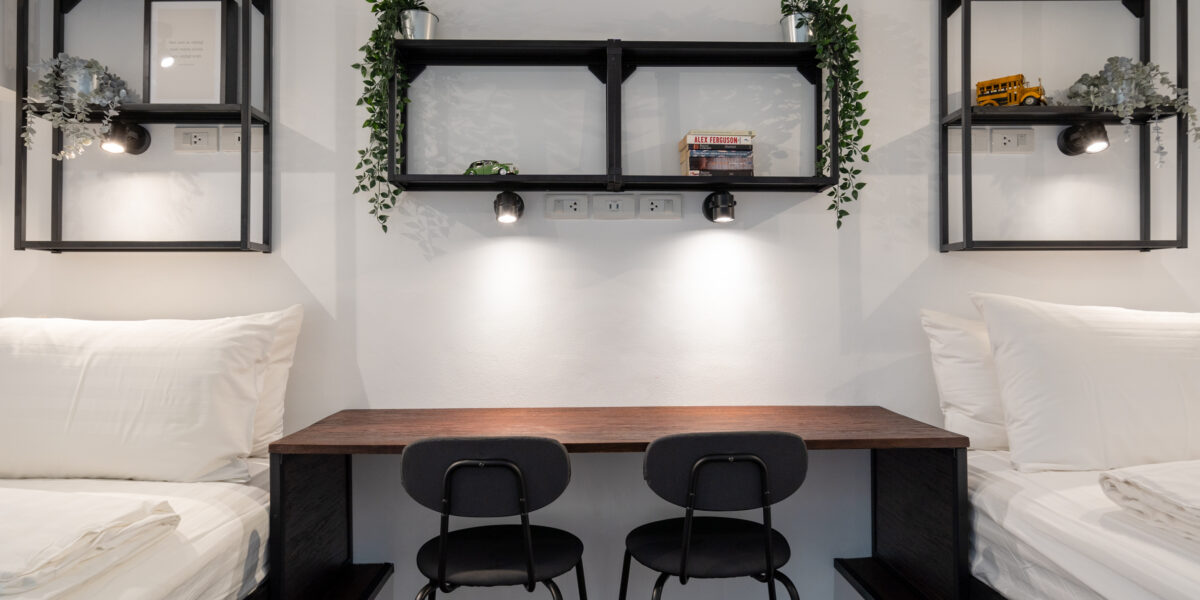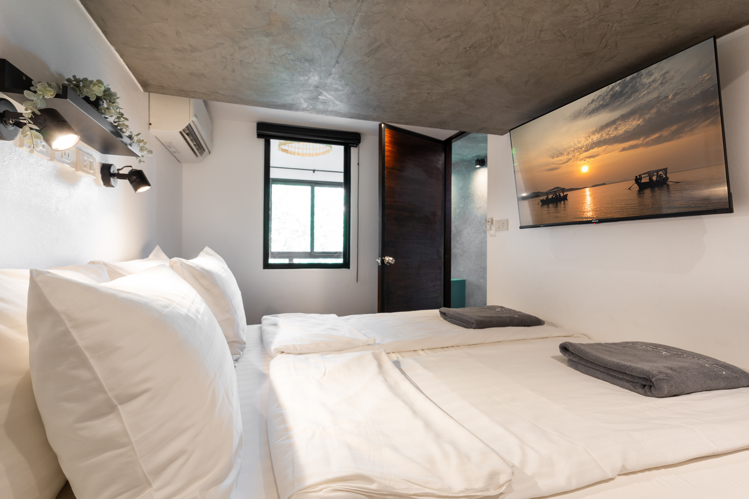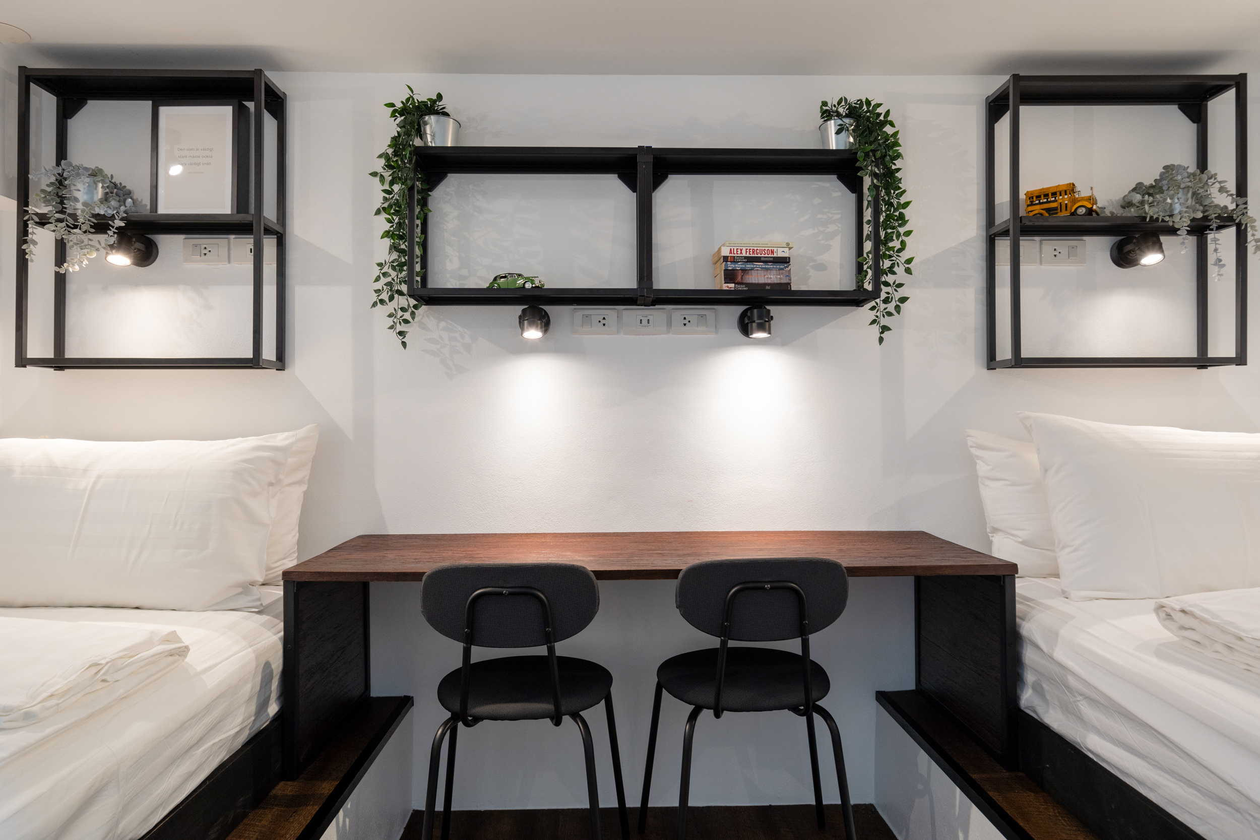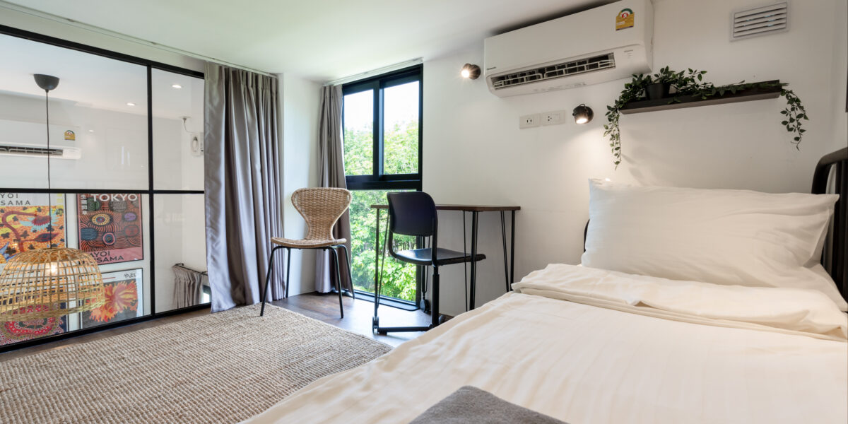 The master bedroom is designed for total relaxation, offering a king-size bed, air conditioning, and a 43-inch smart TV. One loft bedroom features two single beds and a workspace for two. The second loft bedroom includes a single bed, air conditioning, a dedicated work desk with a 24-inch screen, and windows with views of the jungle and the living area. All beds are fitted with high-quality IKEA mattresses and premium linens to ensure a restful night’s sleep.