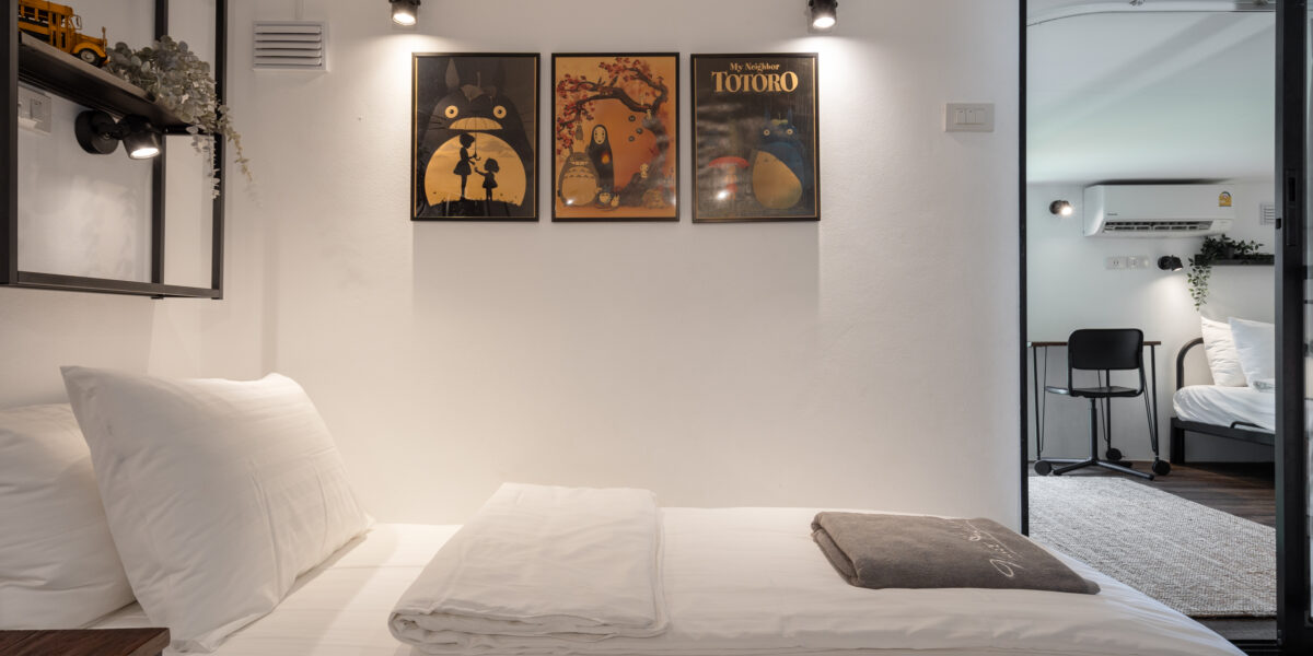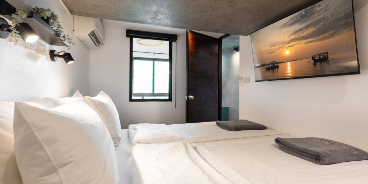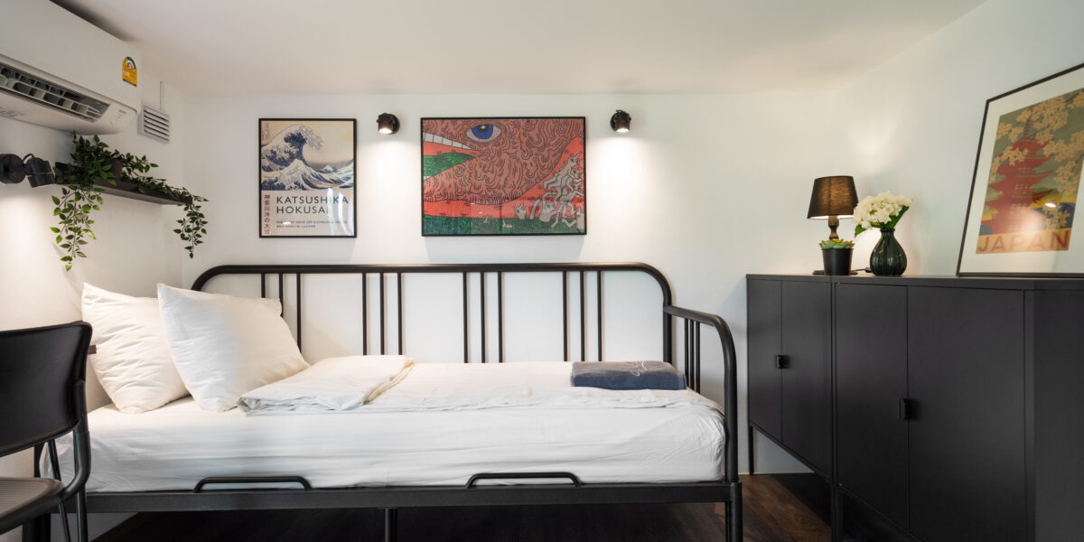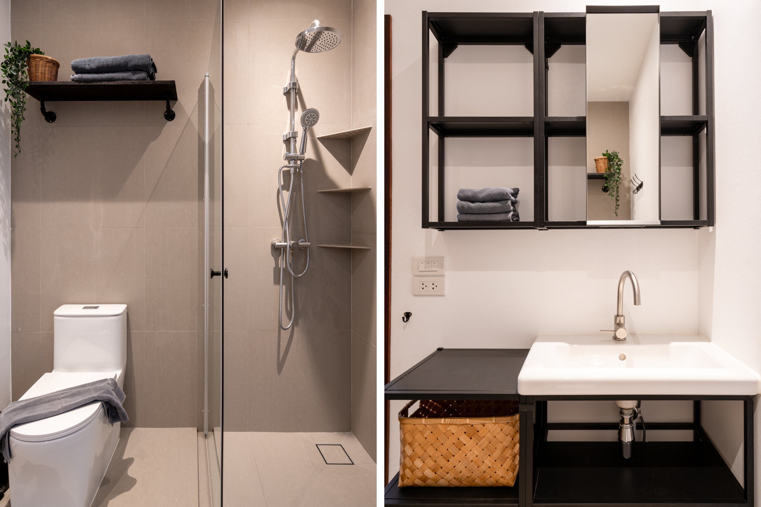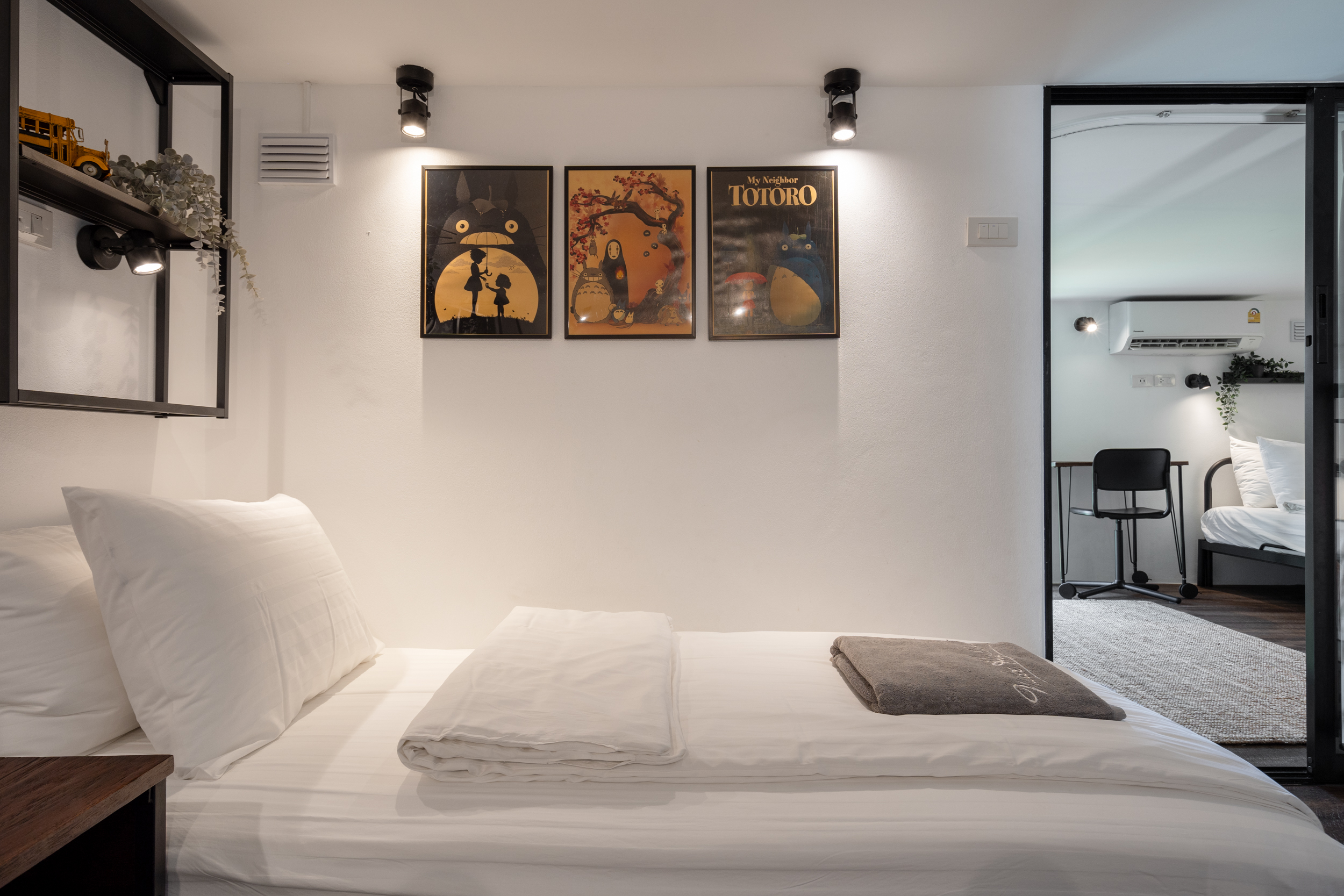 The master bedroom is designed for total relaxation, offering a king-size bed, air conditioning, and a 43-inch smart TV. One loft bedroom features two single beds and a workspace for two. The second loft bedroom includes a single bed, air conditioning, a dedicated work desk with a 24-inch screen, and windows with views of the jungle and the living area. All beds are fitted with high-quality IKEA mattresses and premium linens to ensure a restful night’s sleep.