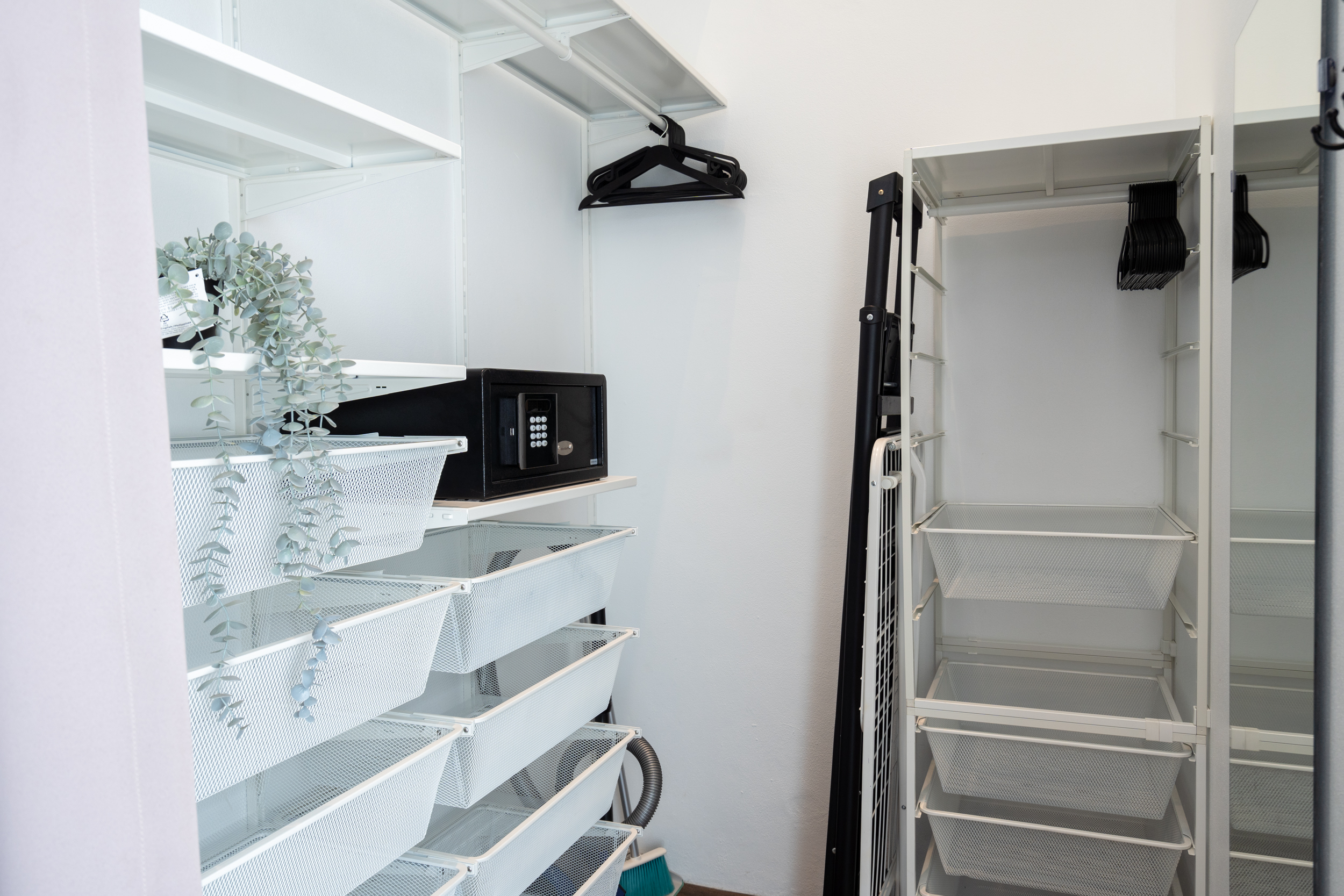 The apartment features one spacious bathroom with a shower and a second, smaller toilet room for added convenience. A large storage closet provides ample space for your personal items.