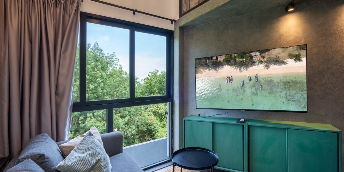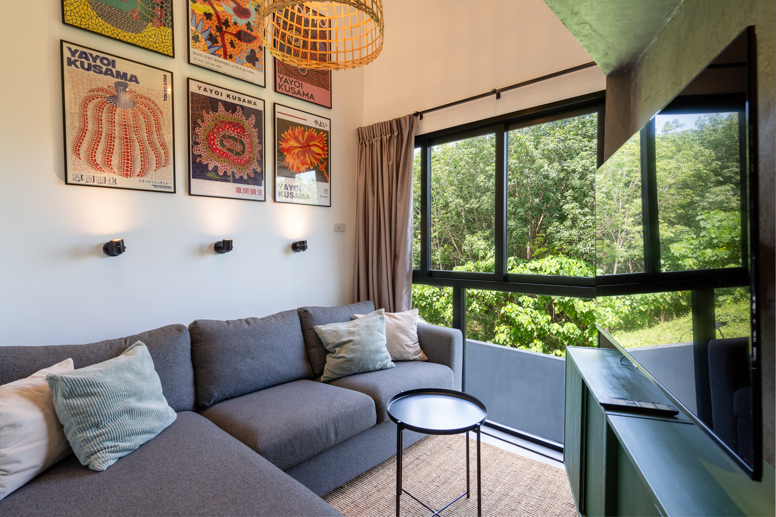 The open-plan living and kitchen area offers a bright, airy ambiance, thanks to expansive windows that flood the space with natural light and provide views of the surrounding jungle. The living room features a comfortable L-shaped sofa and a 43-inch smart TV—perfect for relaxing after a day of adventure.