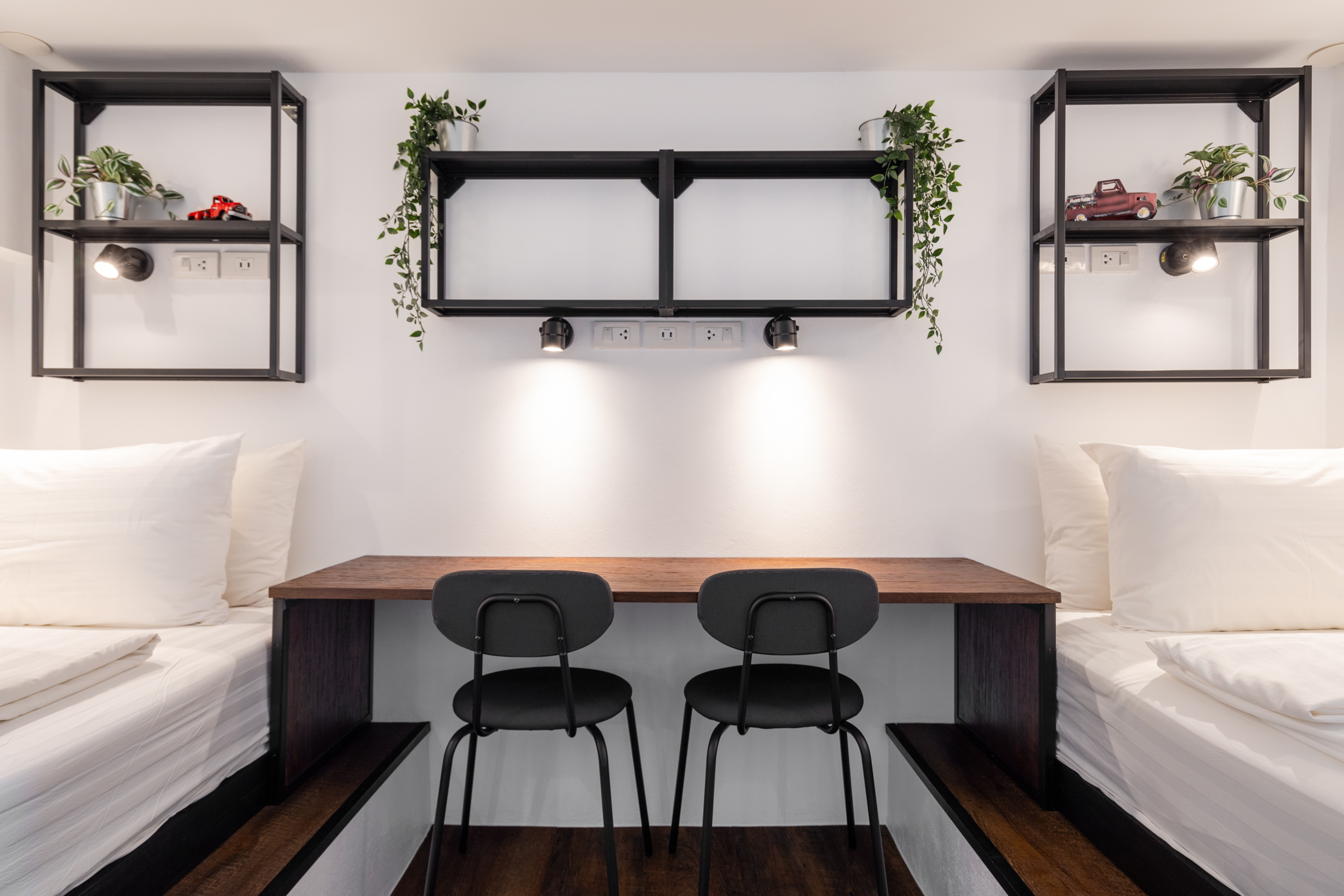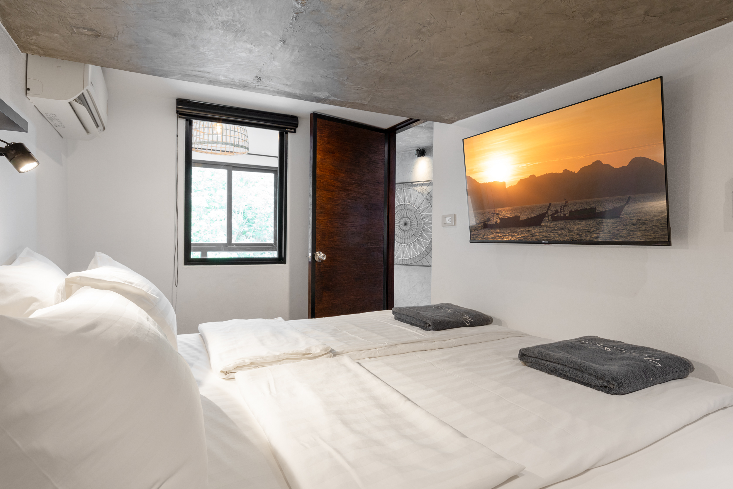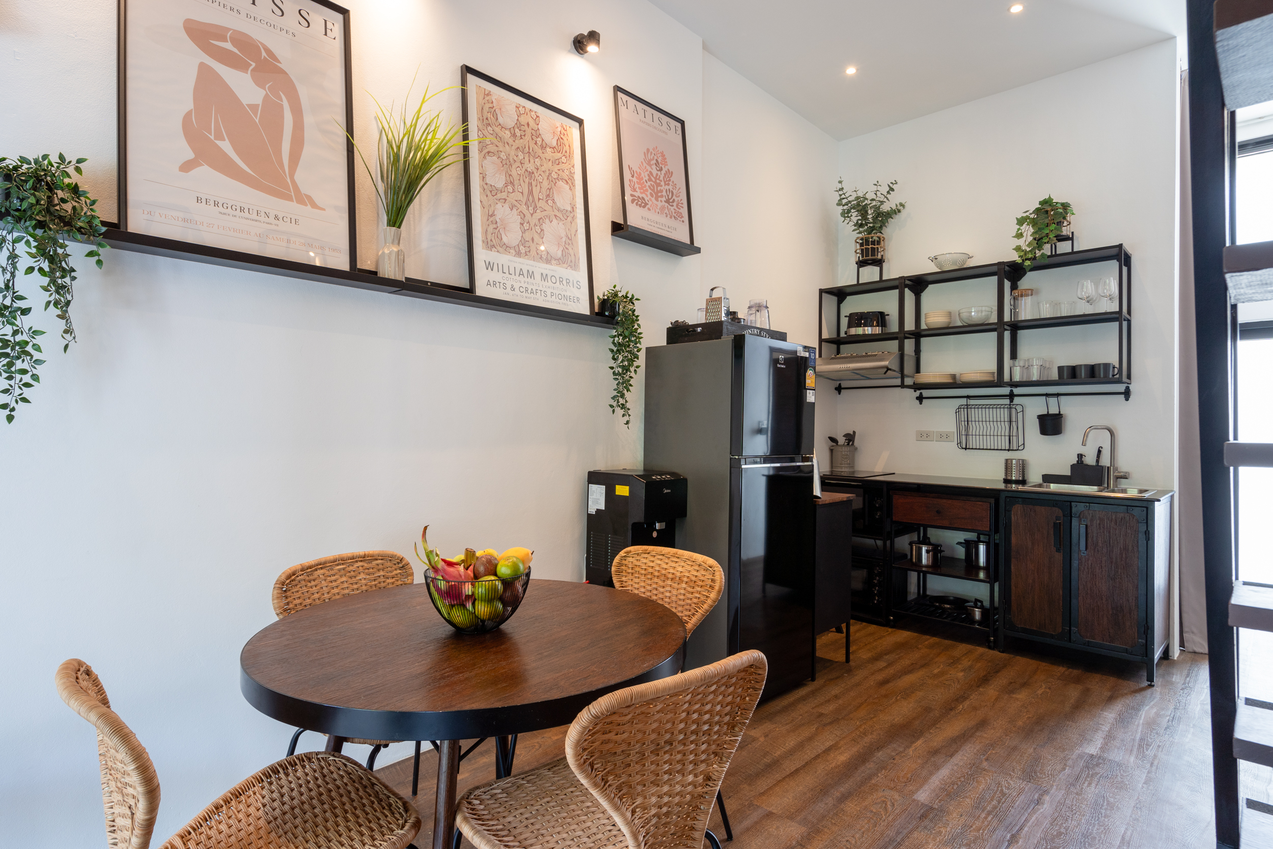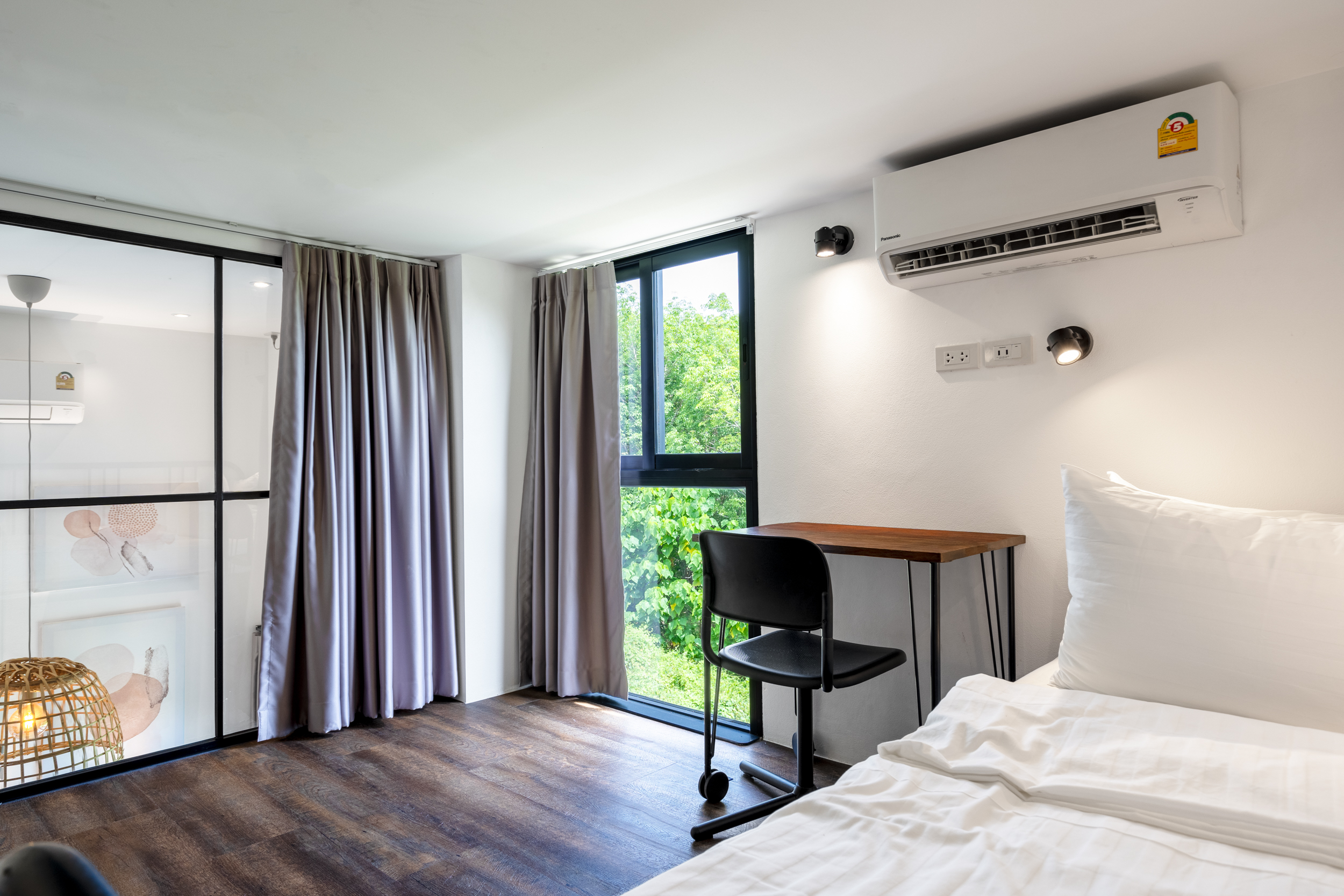 The master bedroom is designed for total relaxation, offering a king-size bed, air conditioning, and a 43-inch smart TV. One loft bedroom features two single beds and a workspace for two. The second loft bedroom includes a single bed, air conditioning, a dedicated work desk with a 24-inch screen, and windows with views of the jungle and the living area. All beds are fitted with high-quality IKEA mattresses and premium linens to ensure a restful night’s sleep.