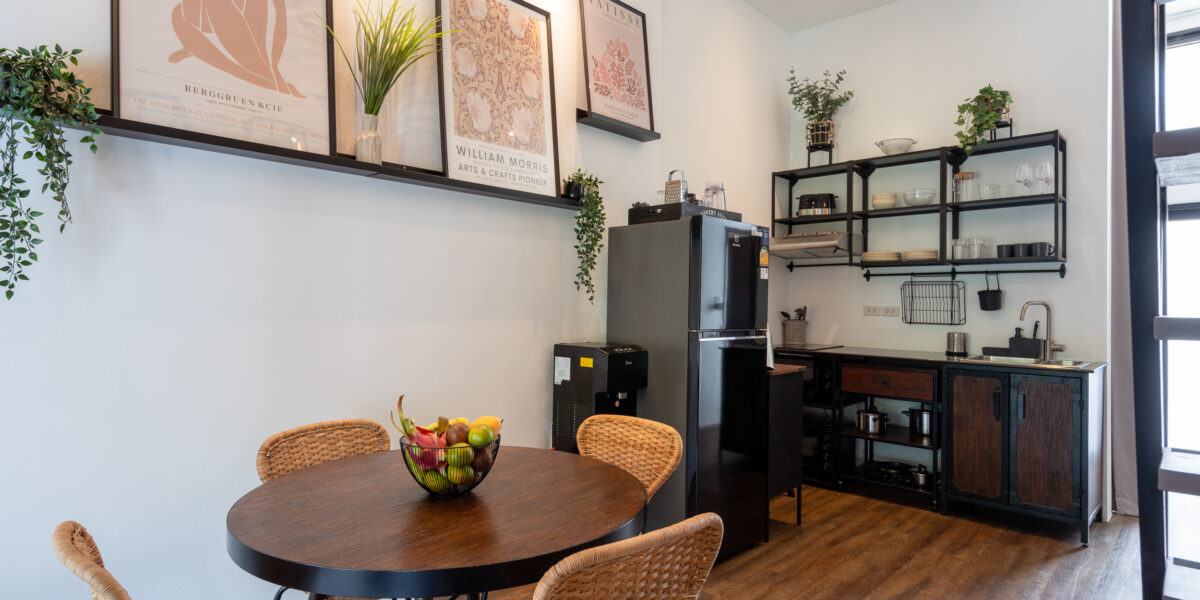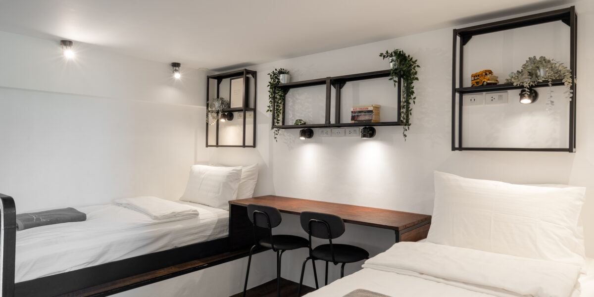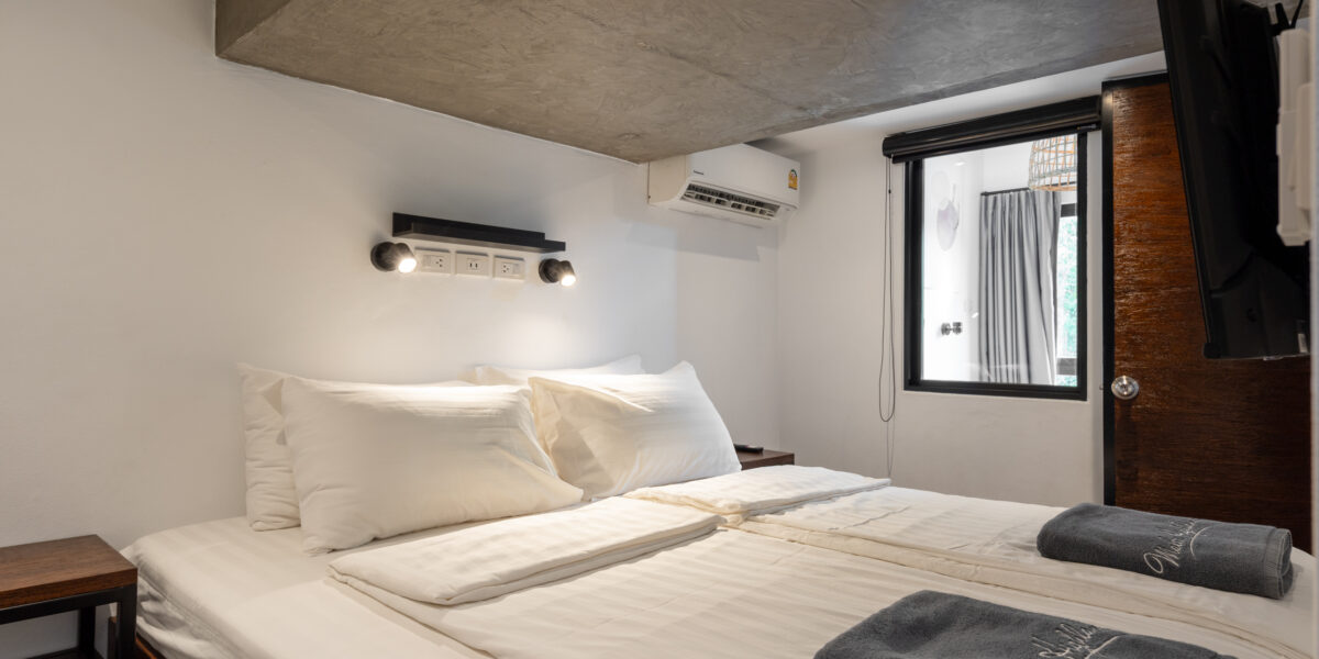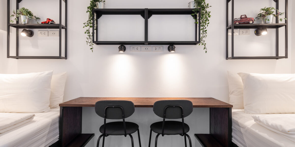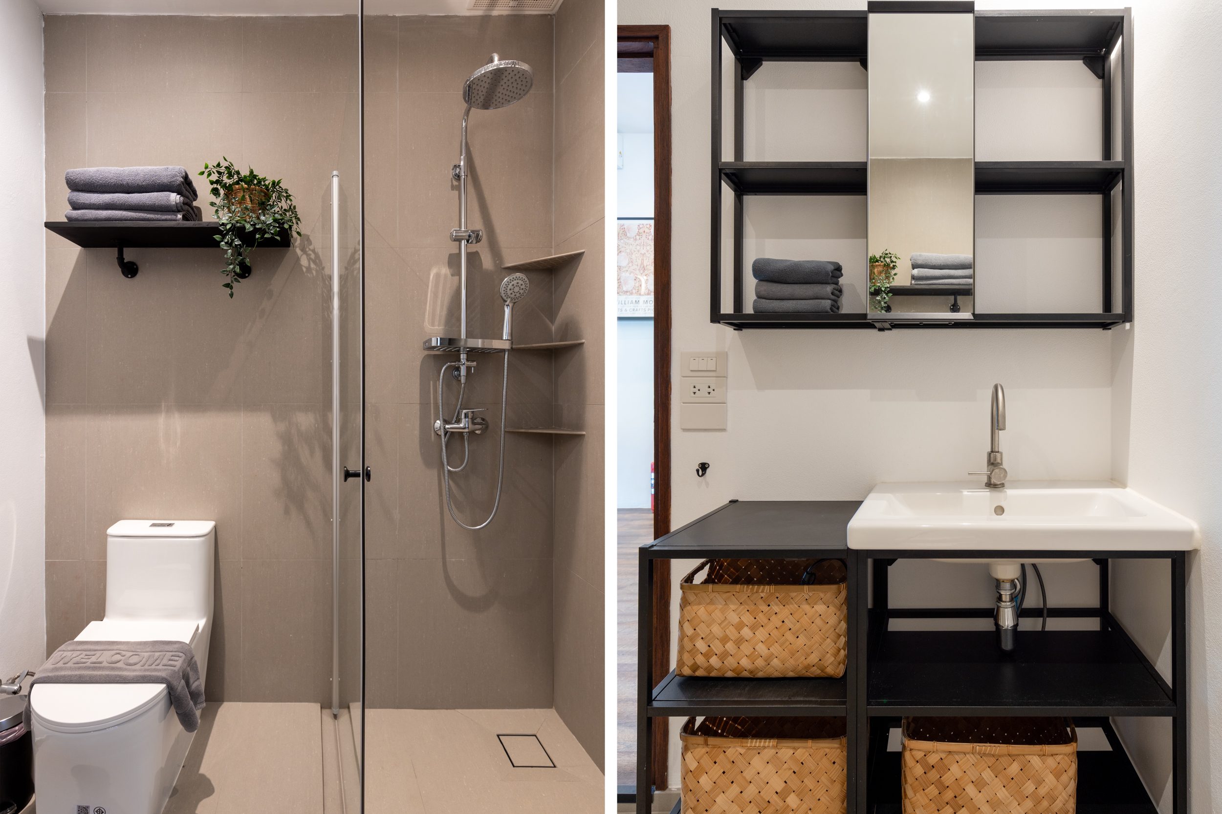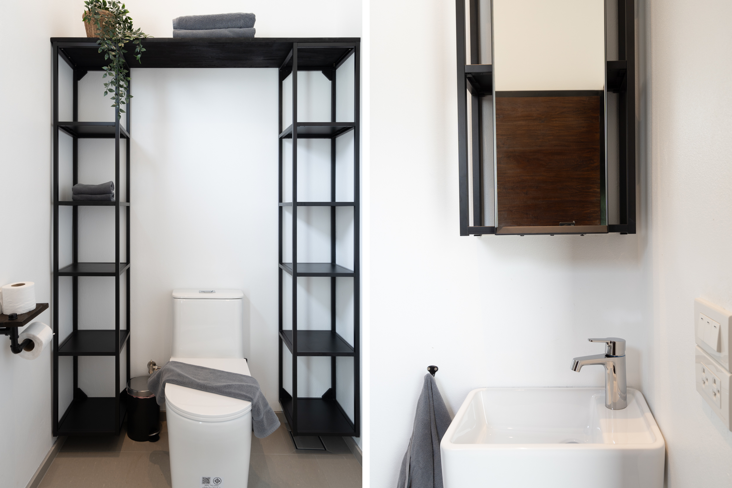 The master bedroom is designed for total relaxation, offering a king-size bed, air conditioning, and a 43-inch smart TV. One loft bedroom features two single beds and a workspace for two. The second loft bedroom includes a single bed, air conditioning, a dedicated work desk with a 24-inch screen, and windows with views of the jungle and the living area. All beds are fitted with high-quality IKEA mattresses and premium linens to ensure a restful night’s sleep.