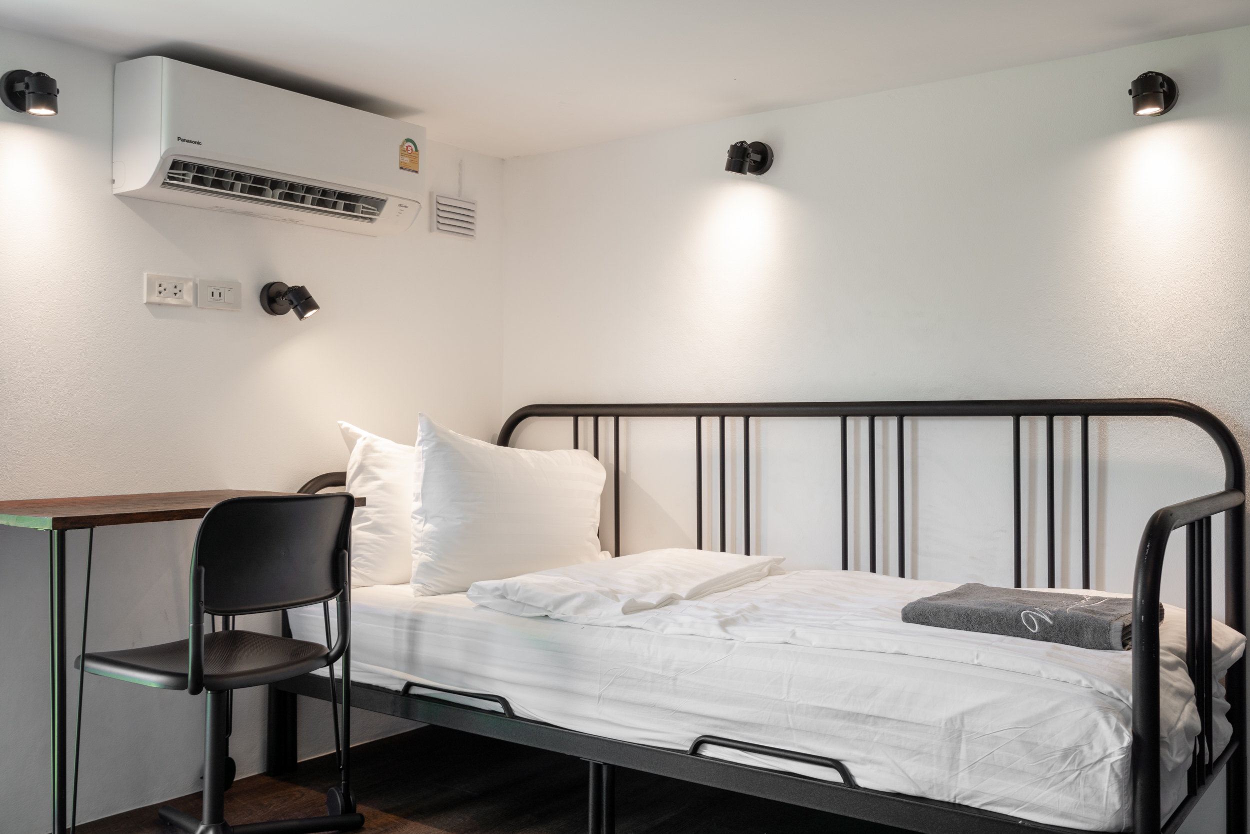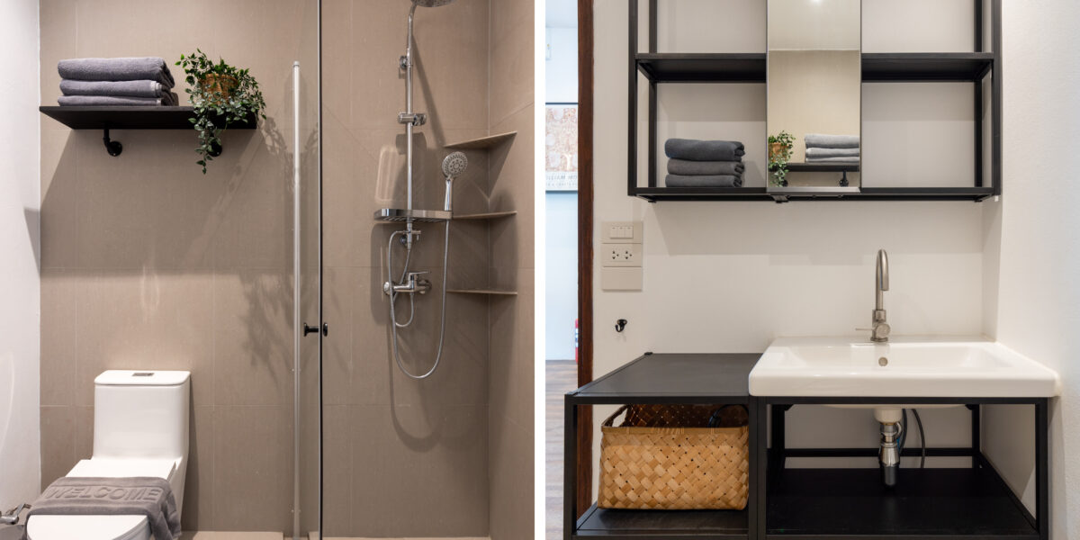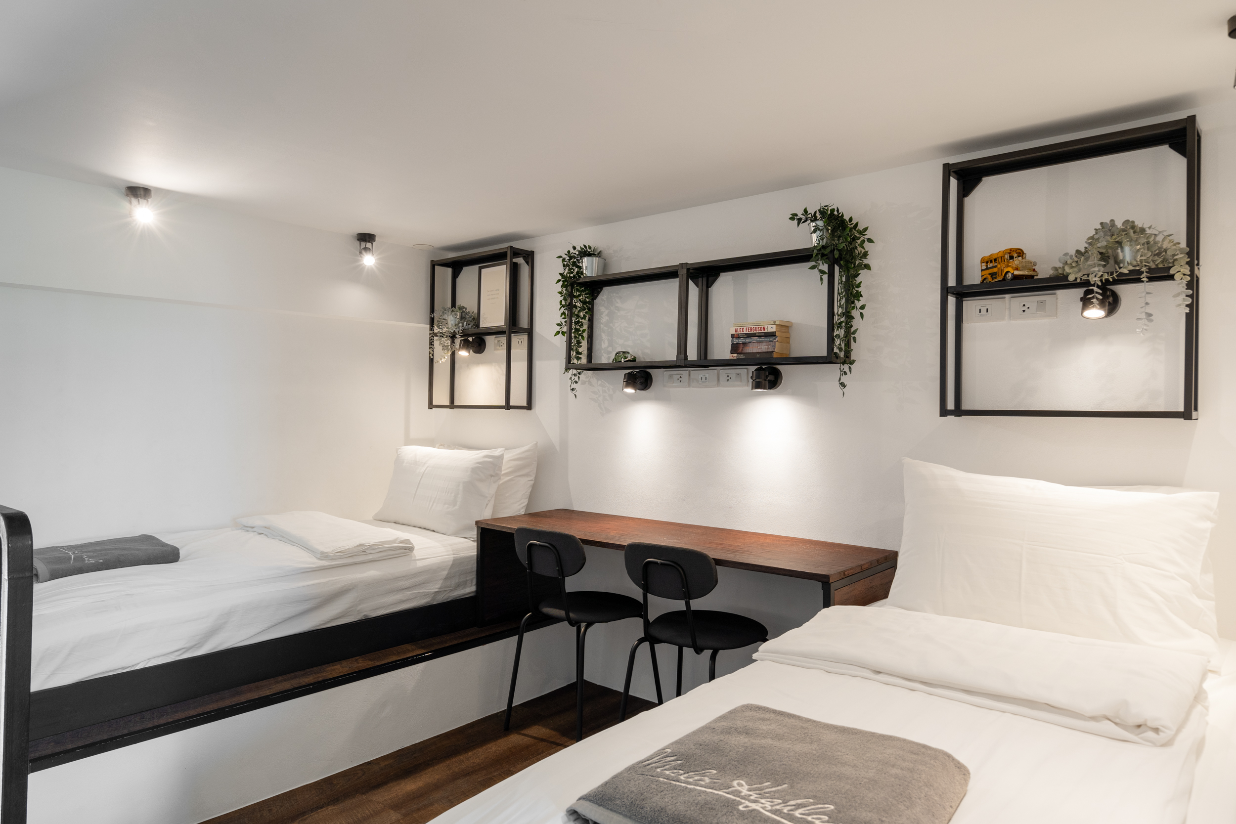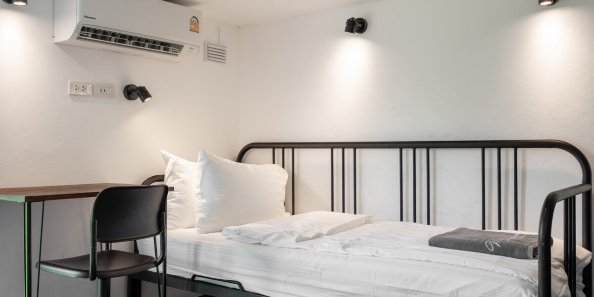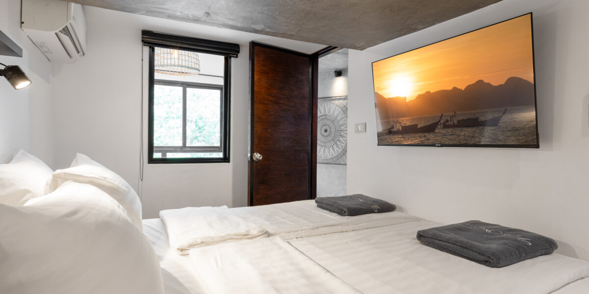 The master bedroom is designed for total relaxation, offering a king-size bed, air conditioning, and a 43-inch smart TV. One loft bedroom features two single beds and a workspace for two. The second loft bedroom includes a single bed, air conditioning, a dedicated work desk with a 24-inch screen, and windows with views of the jungle and the living area. All beds are fitted with high-quality IKEA mattresses and premium linens to ensure a restful night’s sleep.