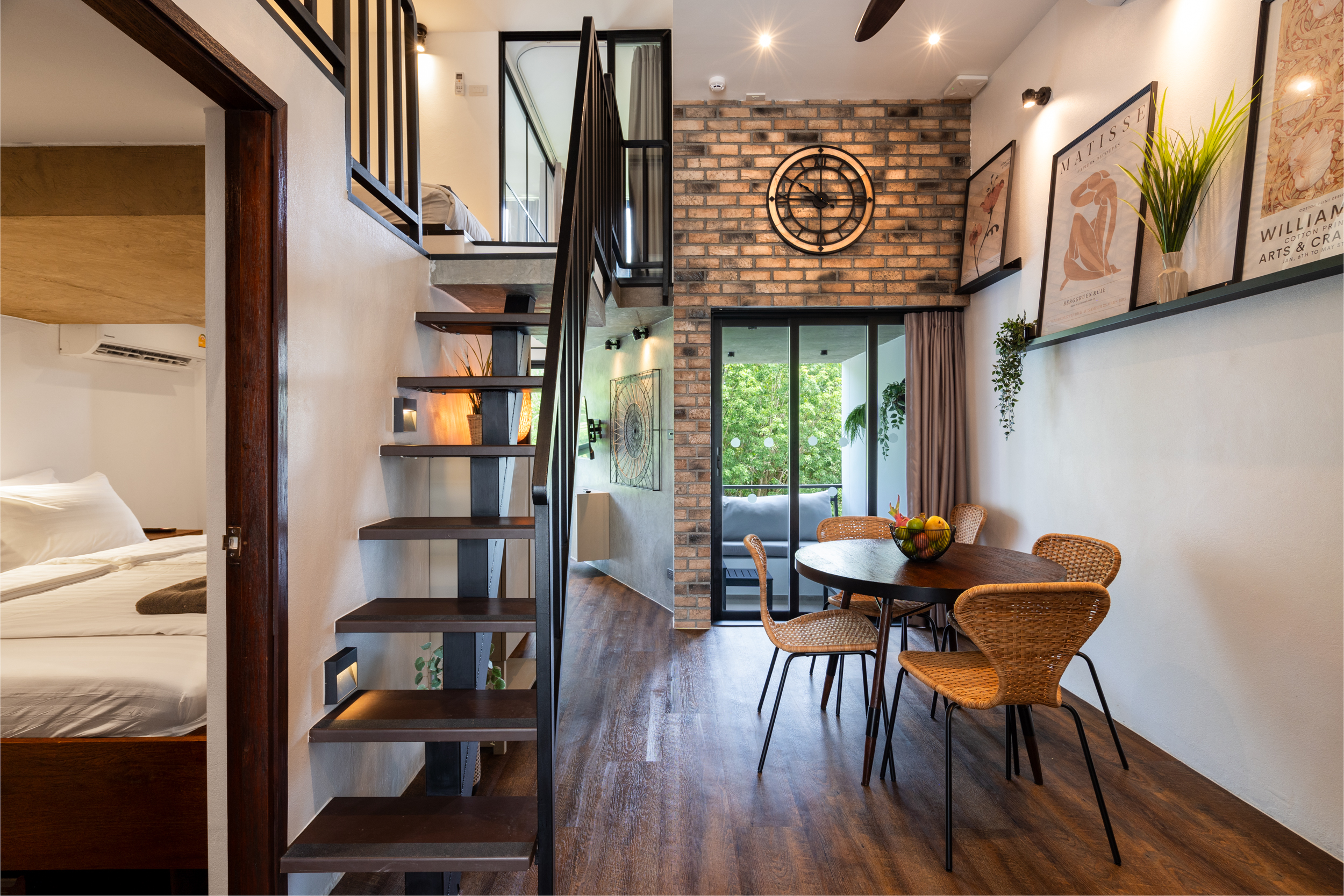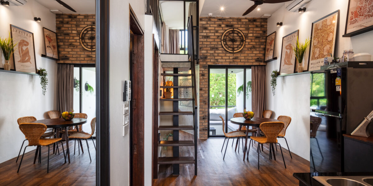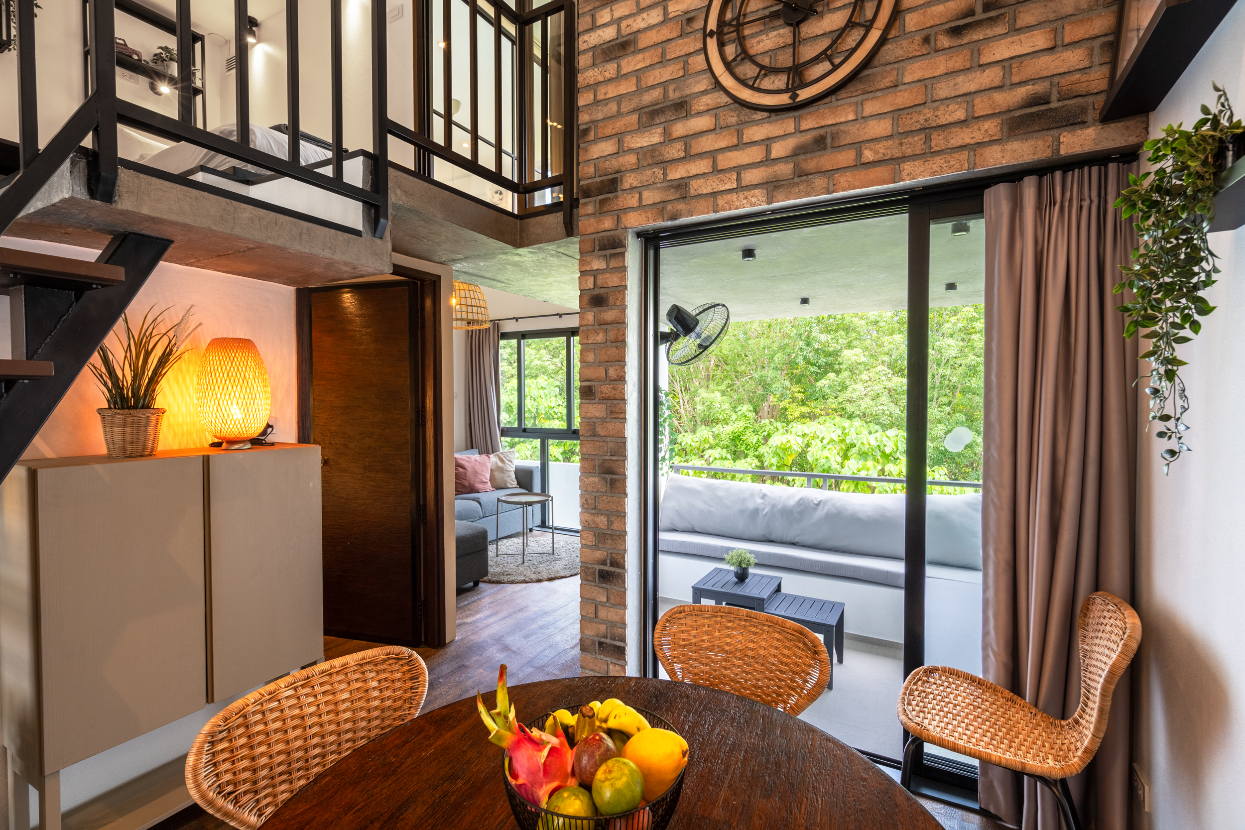 Enjoy a perfect mix of industrial charm, comfort, and tranquil jungle ambiance in this uniquely designed apartment.