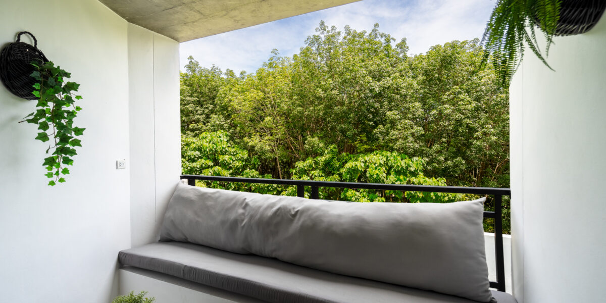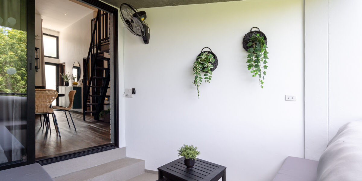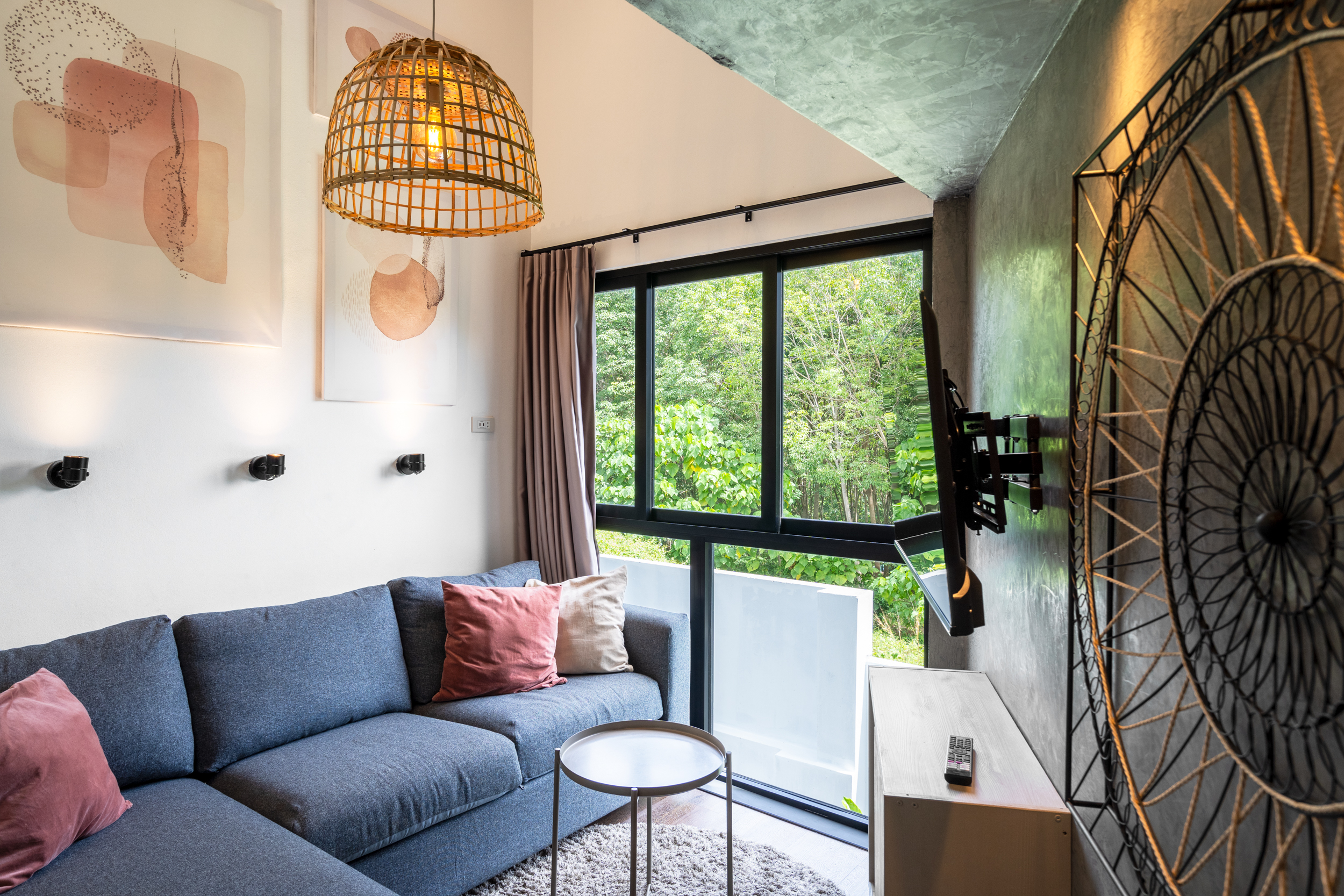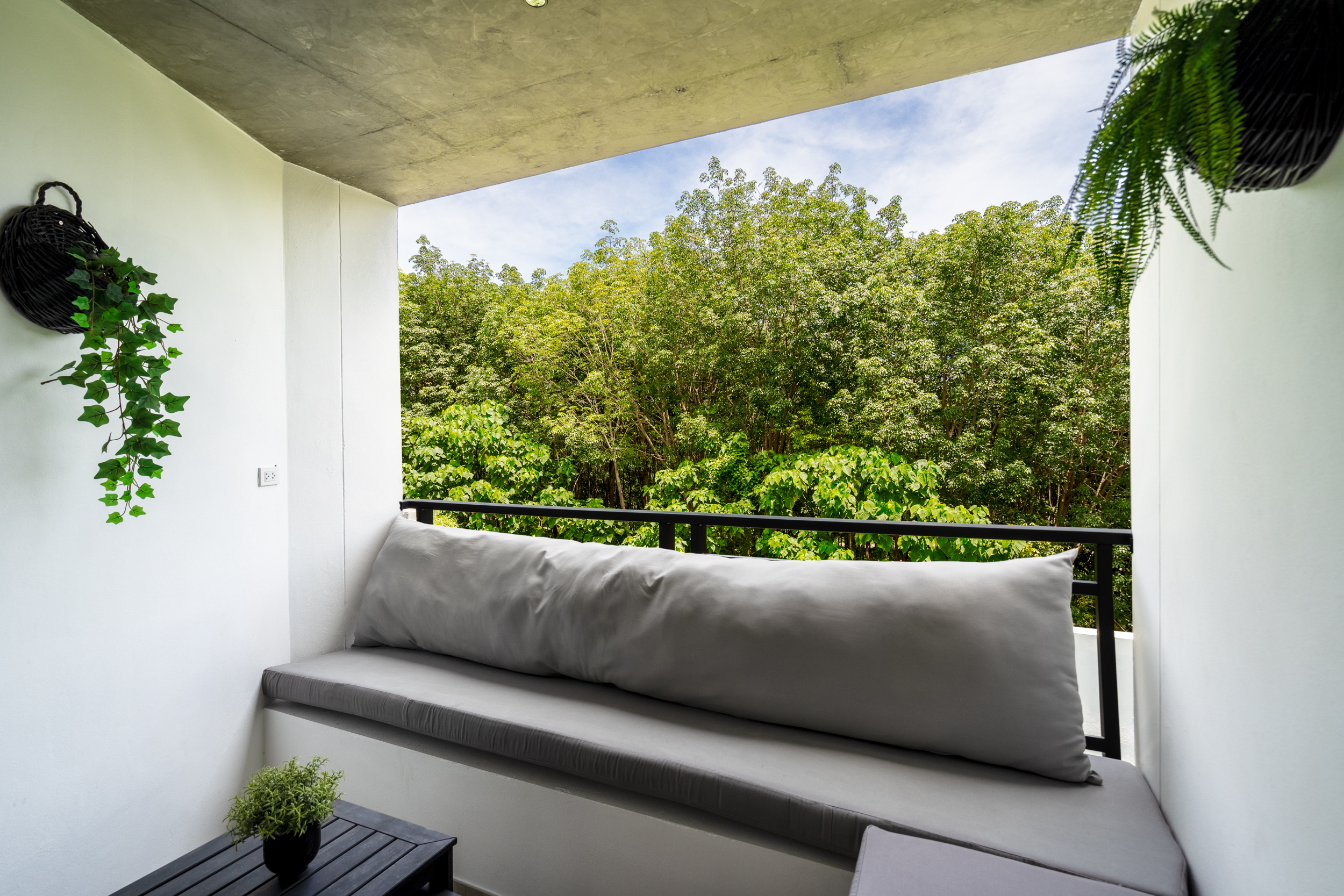 Step out onto the private jungle-view terrace, where a large L-shaped sofa, coffee table, and wall-mounted fan create an inviting outdoor lounge space to relax and soak in the natural surroundings.