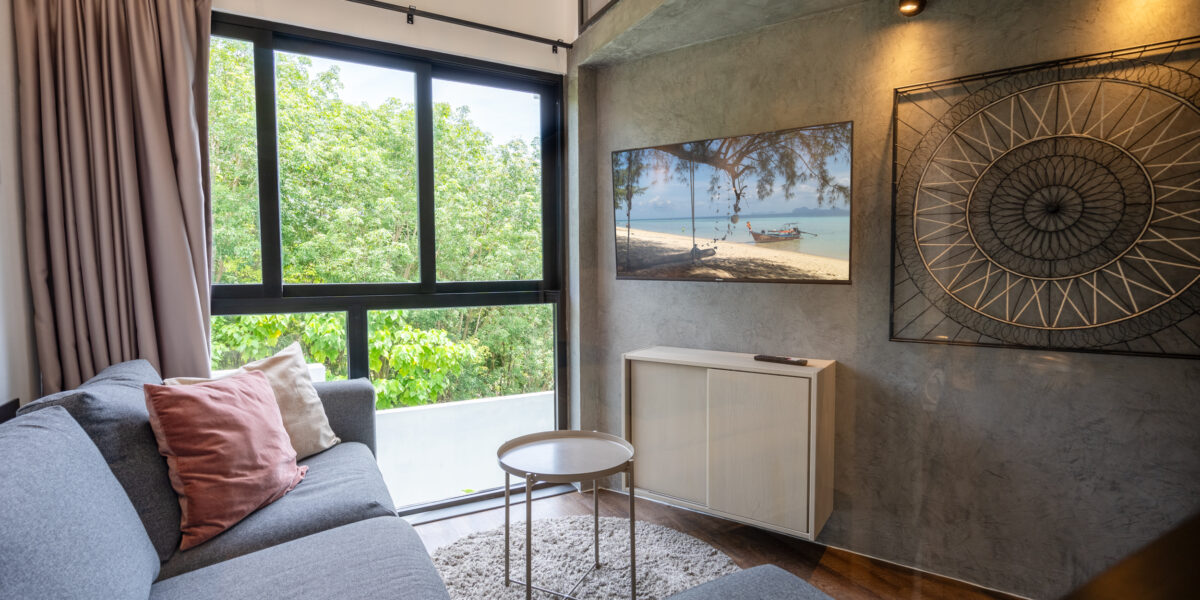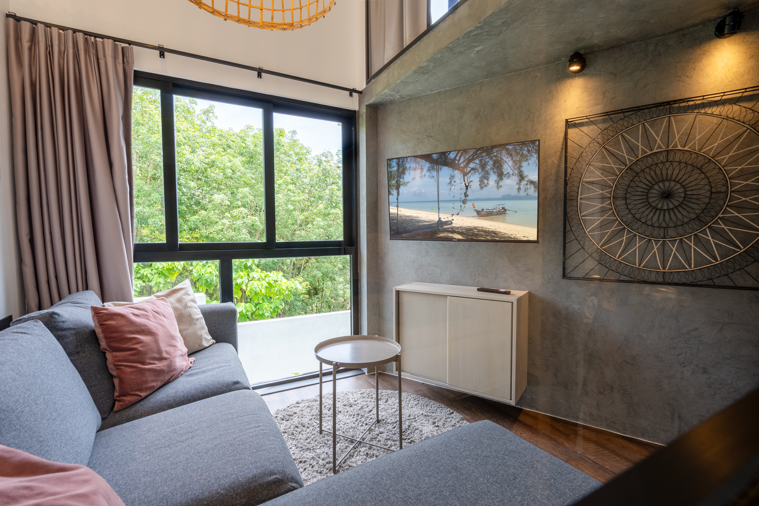 The open-plan living and kitchen area offers a bright, airy ambiance, thanks to expansive windows that flood the space with natural light and provide views of the surrounding jungle. The living room features a comfortable L-shaped sofa and a 43-inch smart TV—perfect for relaxing after a day of adventure.