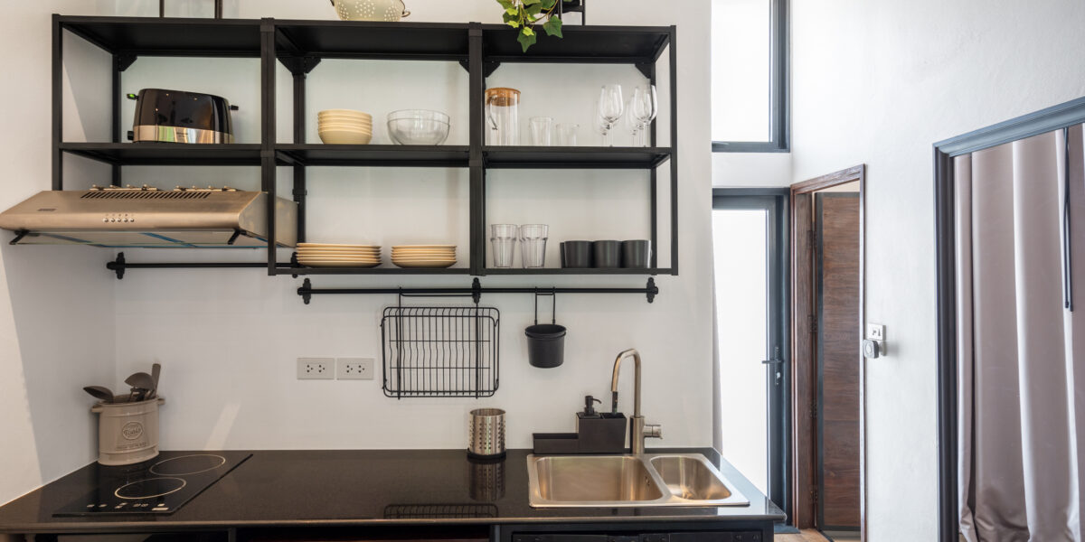 The fully equipped kitchen includes a two-burner cooktop, oven, microwave, full-size refrigerator, toaster, coffee machine, and all essential cookware and utensils. A dining table beside the kitchen comfortably seats five.
