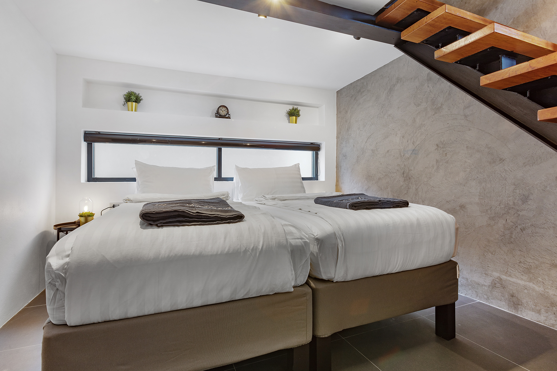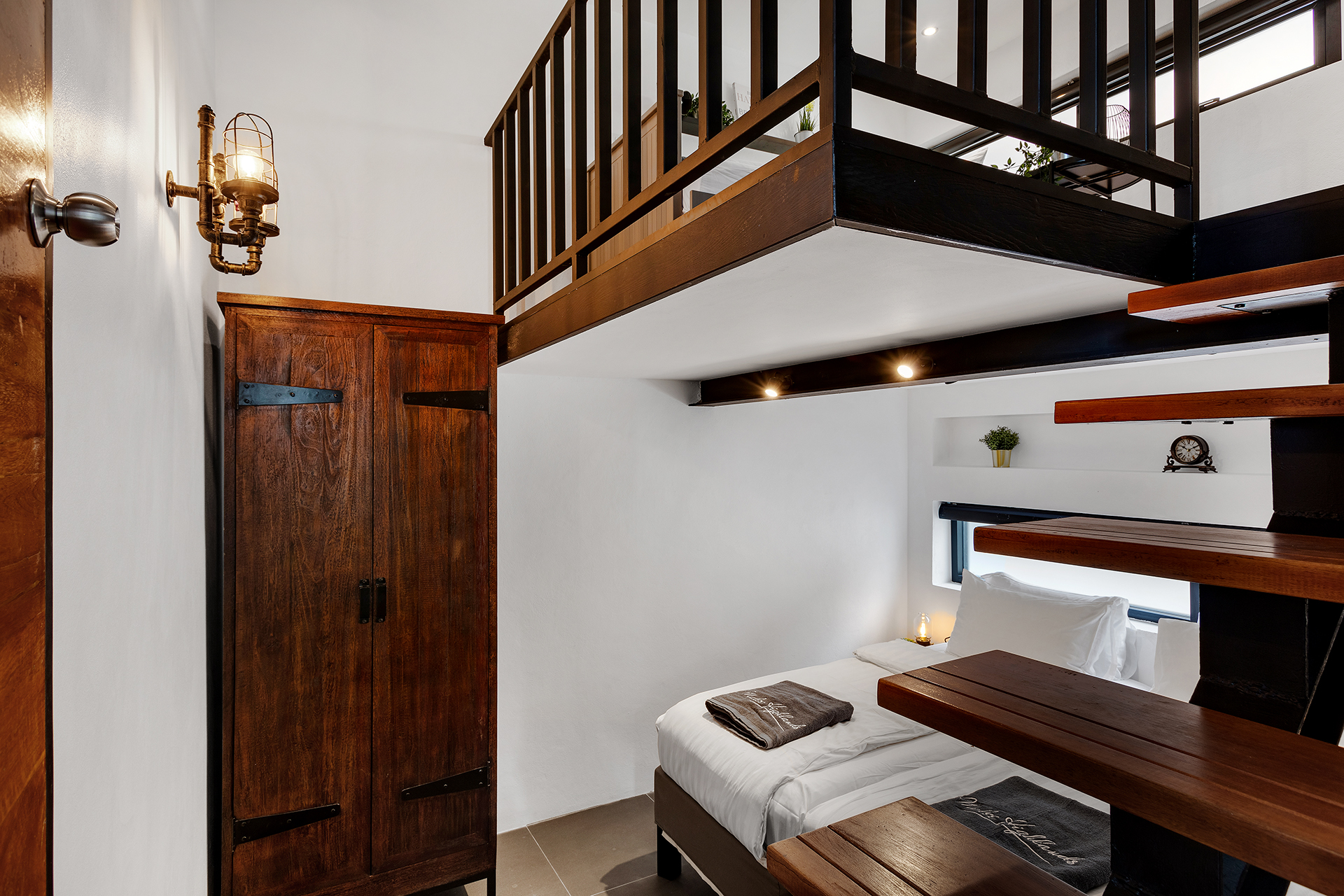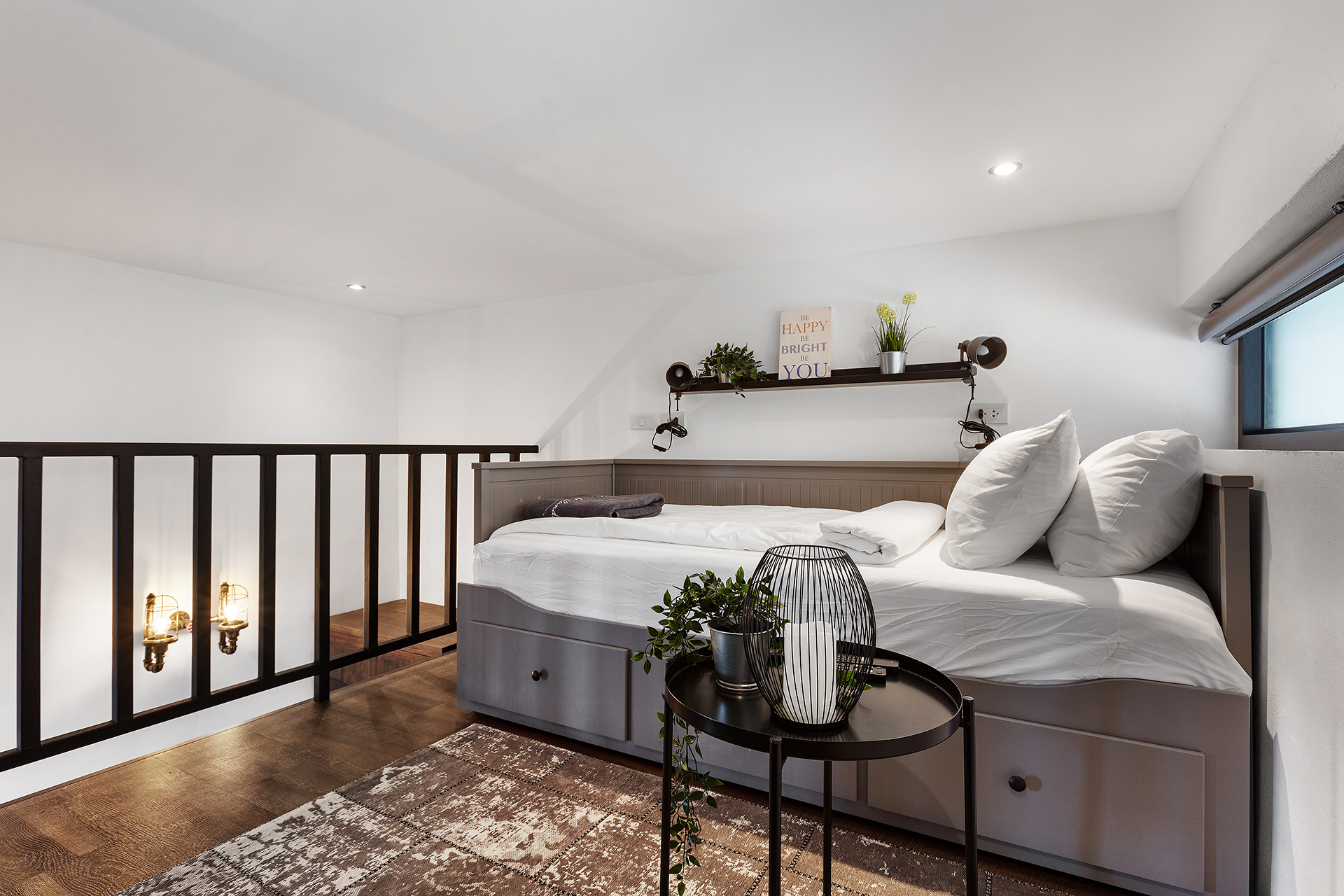 - The second bedroom is uniquely designed with two levels: the ground level has two single beds, and the upper level has a bed sofa that can be turned to a queen size bed, all fitted with high-quality IKEA mattresses for a restful night’s sleep.