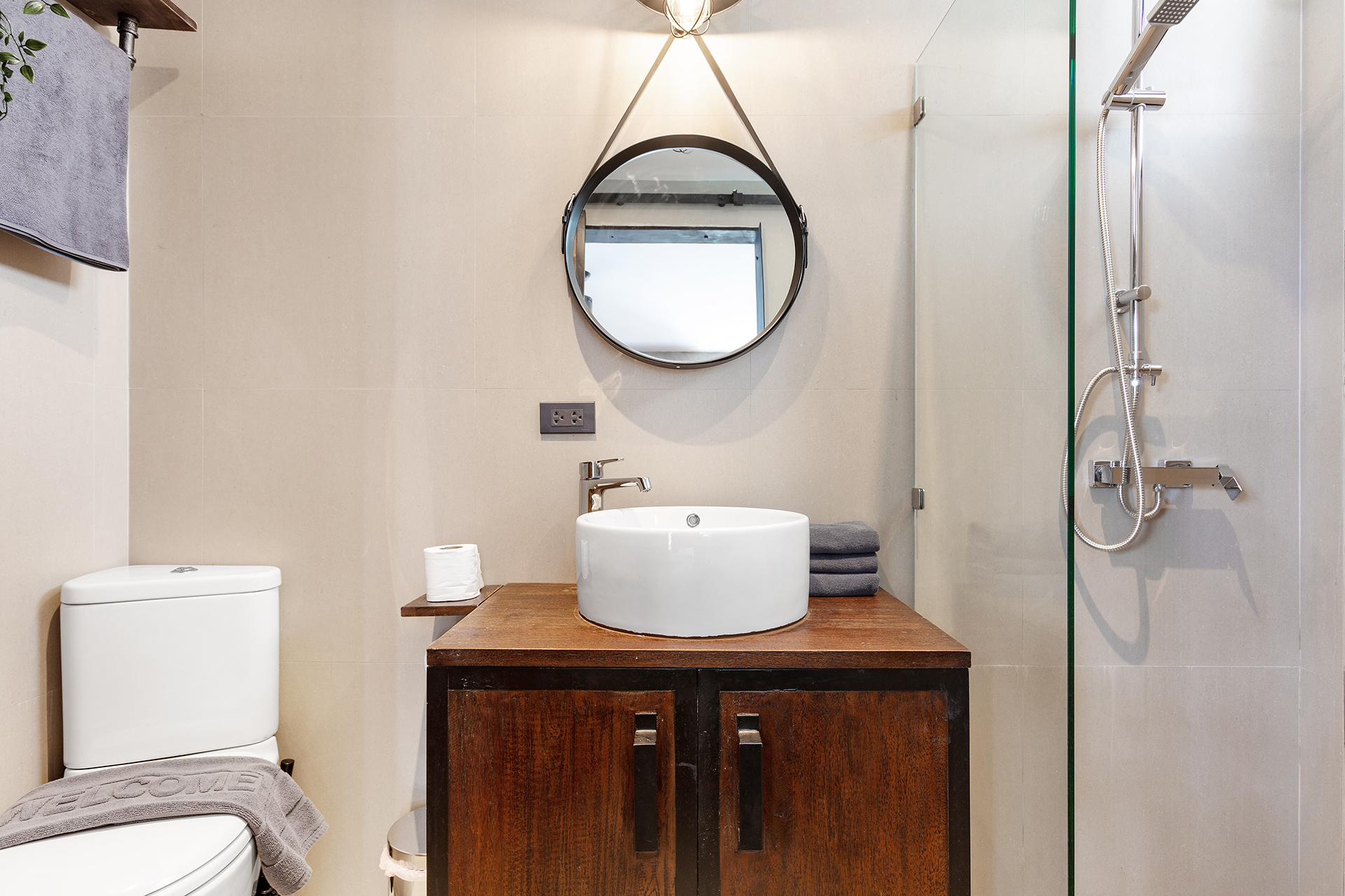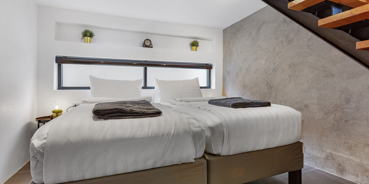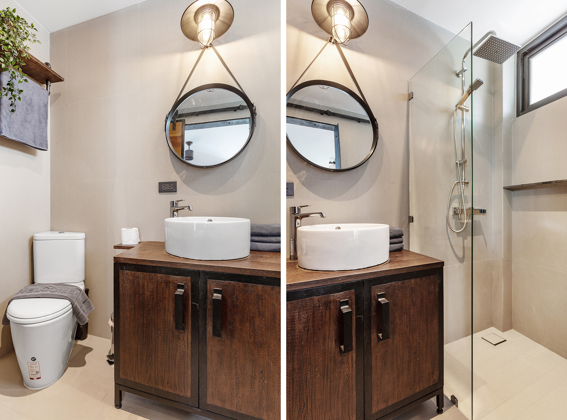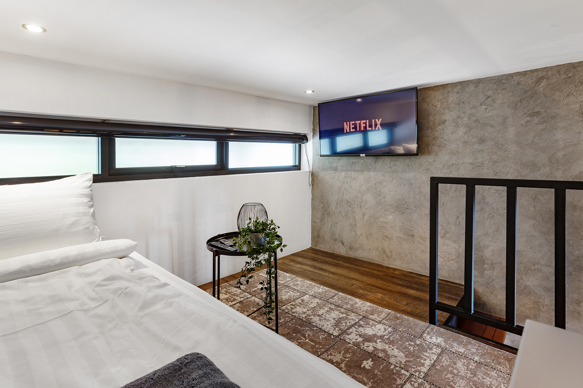 - The second bedroom is uniquely designed with two levels: the ground level has two single beds, and the upper level has a bed sofa that can be turned to a queen size bed, all fitted with high-quality IKEA mattresses for a restful night’s sleep.
