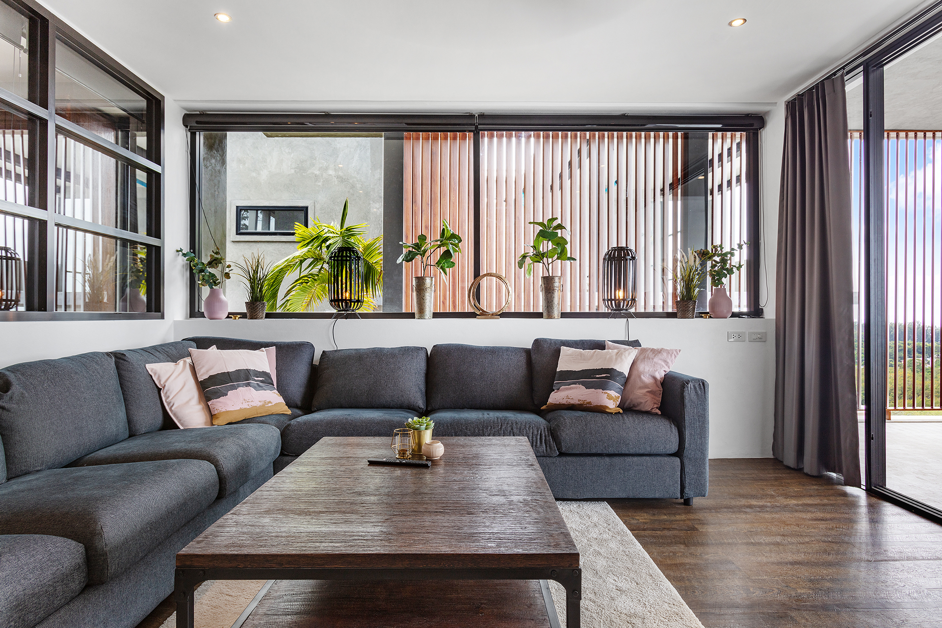 - The spacious living room seamlessly integrates with the signature Malee Highlands kitchen, creating an inviting space perfect for entertaining or unwinding.
