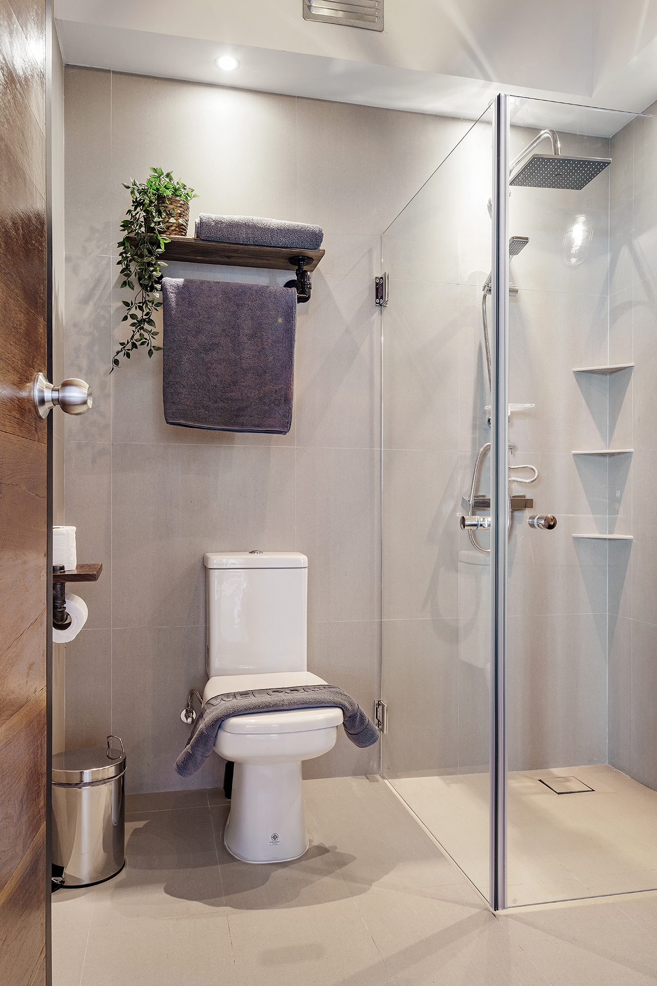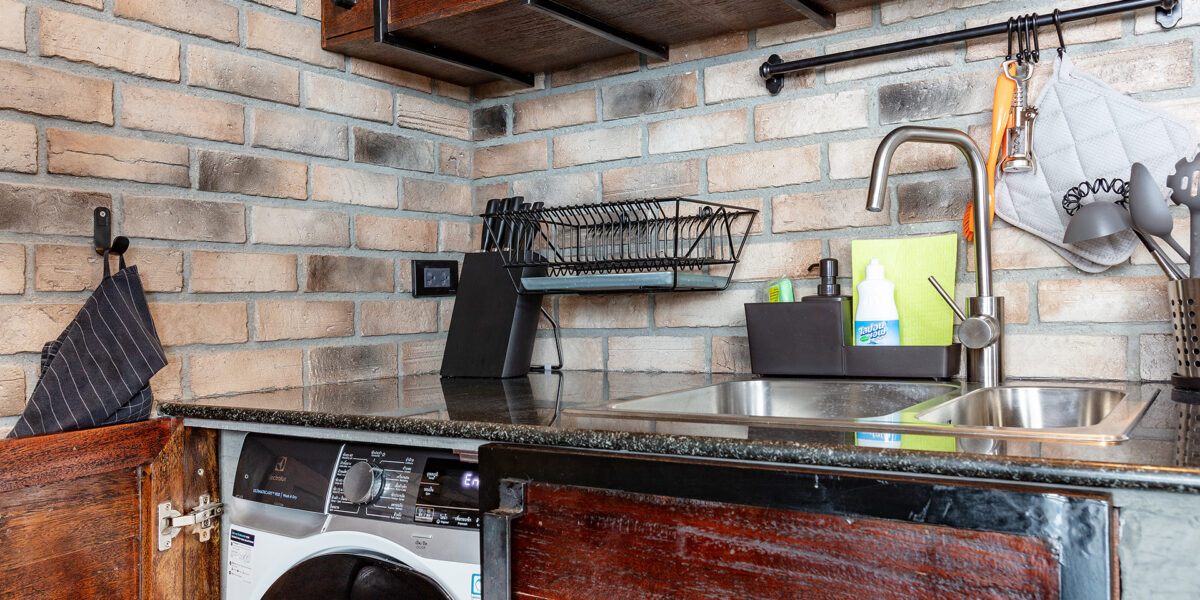 - The hidden washer/dryer machine is cleverly concealed behind a door, maintaining the apartment’s clean and uncluttered look.